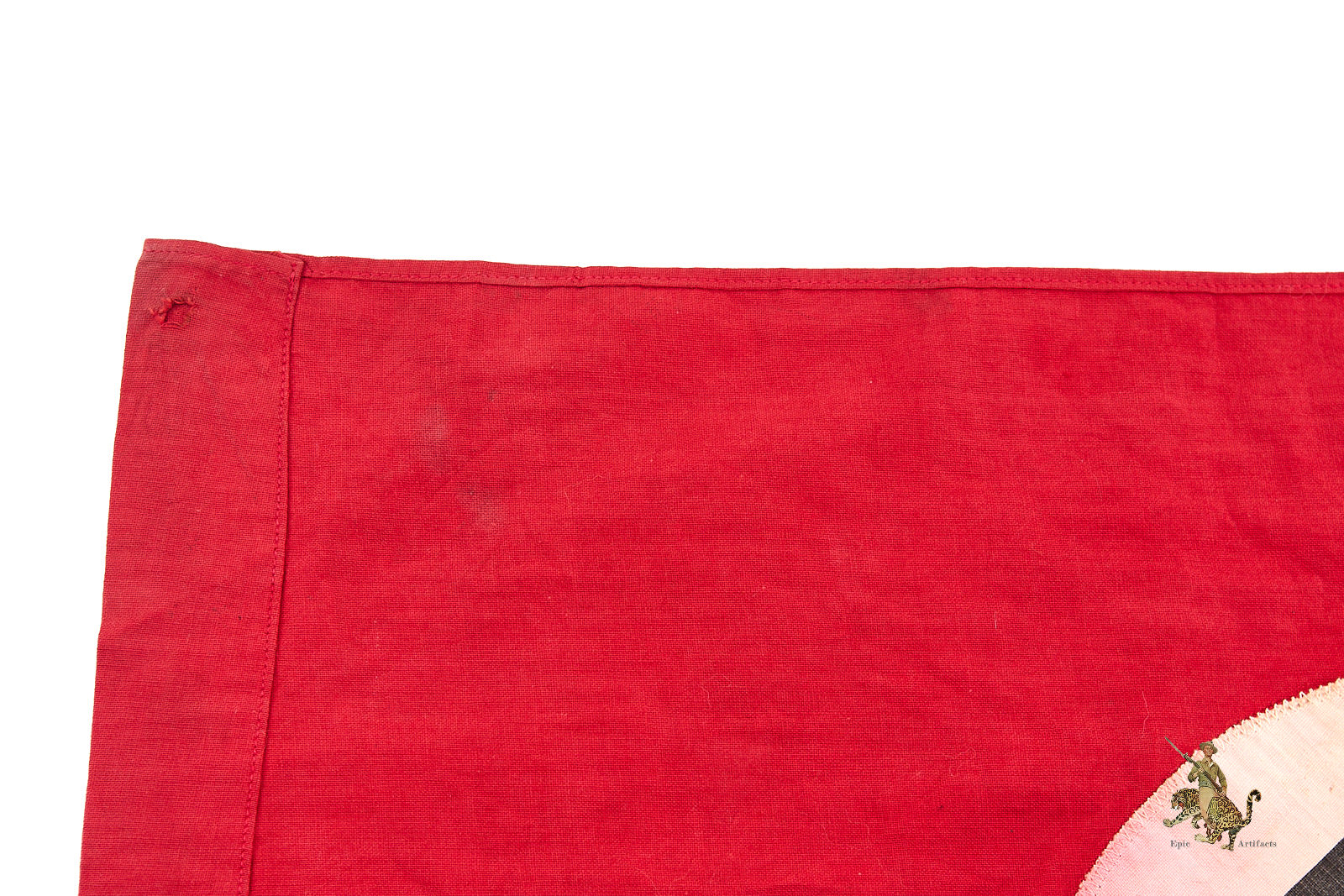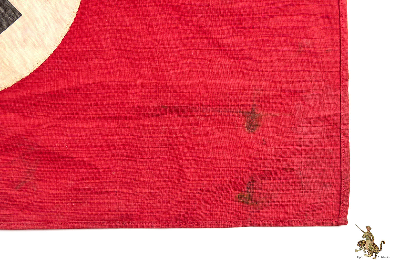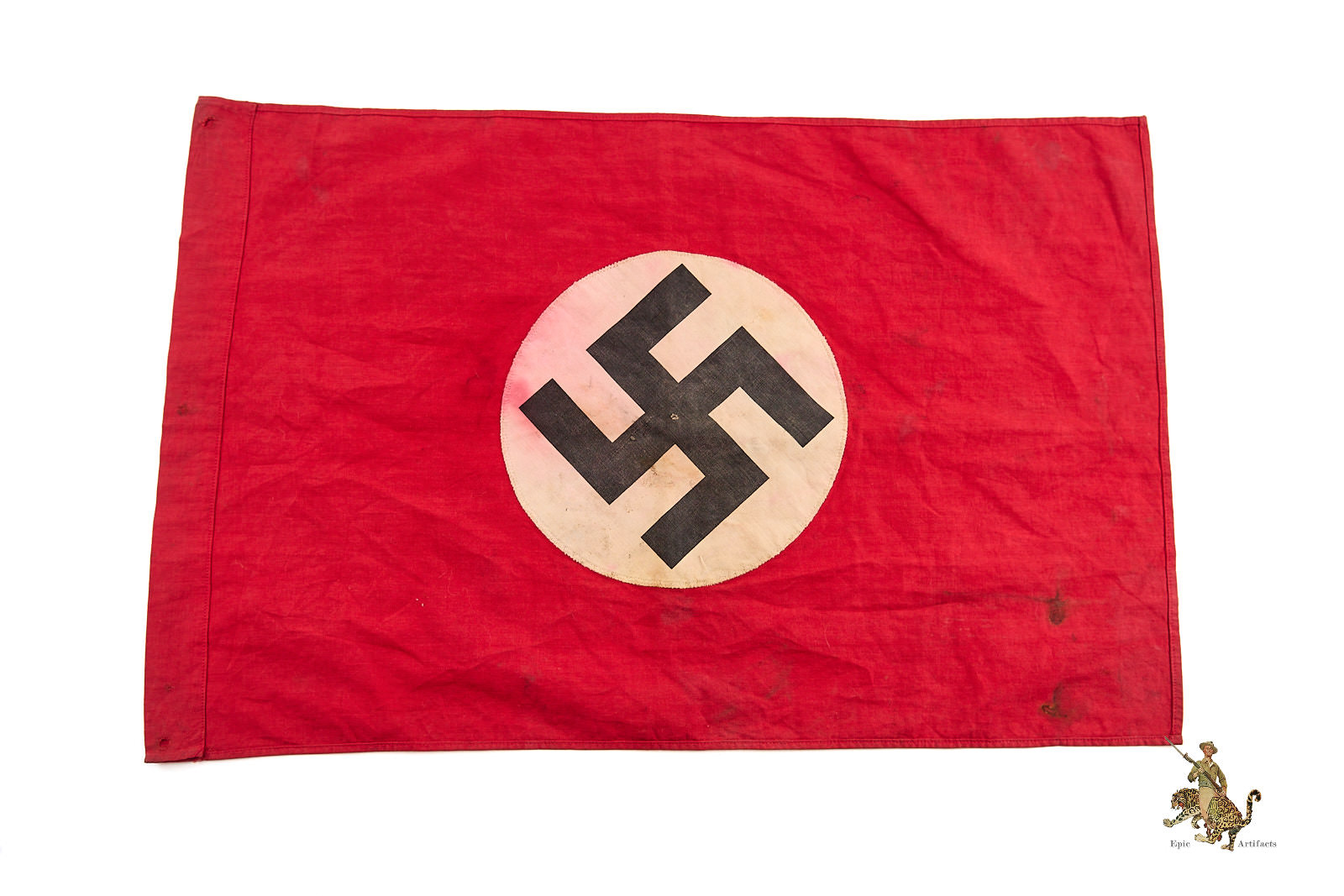 Product Description: This is an all-original WWII Small NSDAP Double Sided Flag 13″ x 21″ , is a striking historical piece that has been well-preserved over time. Measuring 13″ by 21″, this flag is a prime example of the type used at Nazi Party gatherings and after 1935, as an official German national flag. Crafted from a thicker cotton fabric, the banner retains its deep red original color, with some dark spotting and discoloration throughout. The centerpiece features a zig zag machine-stitched white roundel with a printed black swastika on each side. The white fabric has developed some color bleed from age and wear.  This piece has seen use and exhibits moderate wear and flaws consistent with its age, mostly at corners. The quality craftsmanship ensures its durability and excellent condition for display. This historically significant WWII NSDAP flag is a standout addition for collectors of World War II memorabilia. Don’t miss the opportunity to own an authentic artifact from this pivotal era in excellent condition.