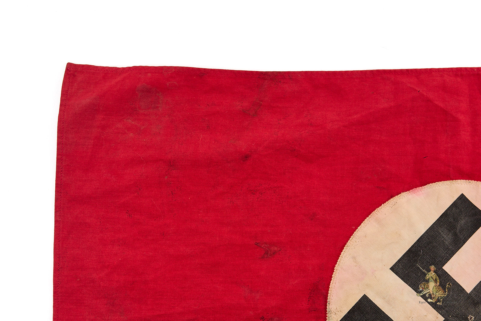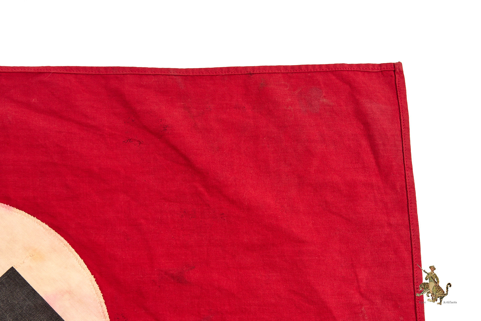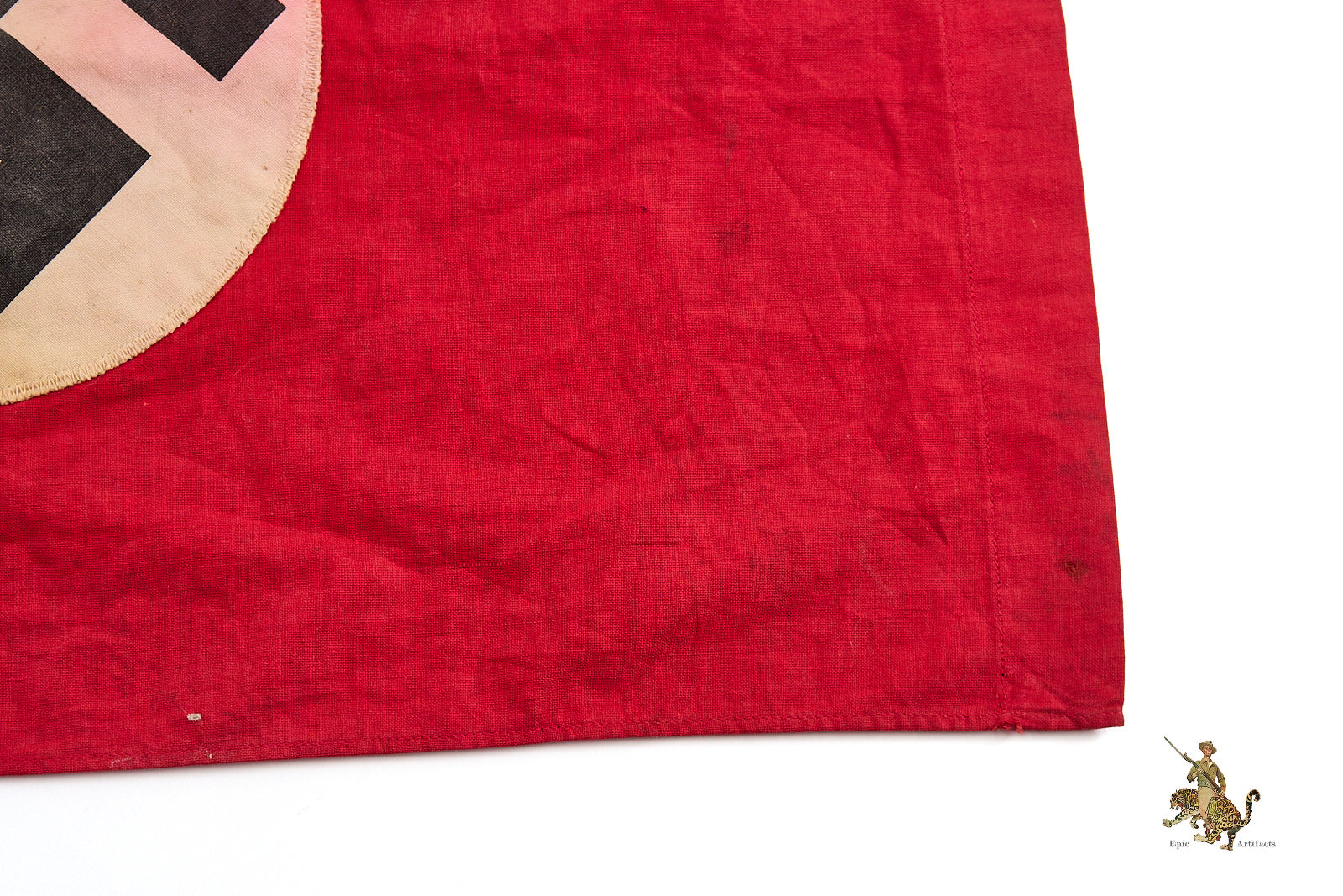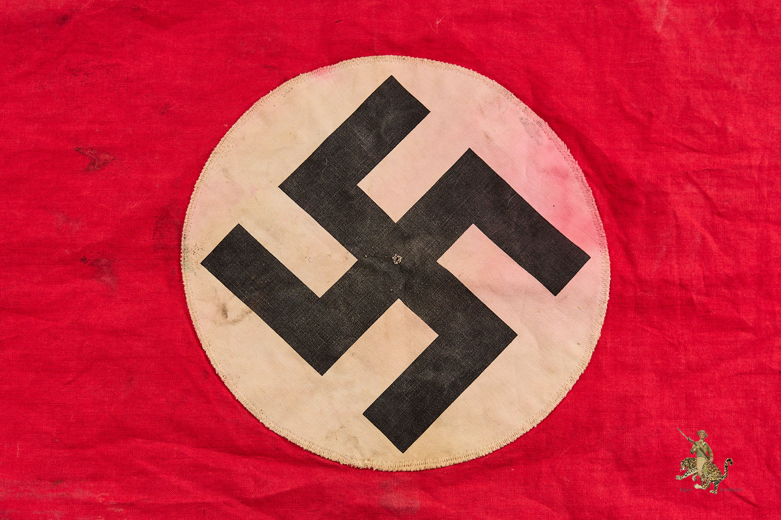 Historical Description: The red flag with white central disk and black swastika was introduced by Hitler in the 1920s as the flag of the National Socialist political party. In 1933, shortly after the Nazis took power, this party flag was recognized alongside the black-white-red Imperial tricolor as one of Germany’s national flags. In 1935, the use of the tricolor flag was discontinued, and between September 1935 and May 8, 1945, the Nazi party flag was the sole national flag of Germany. From its creation in the 1920s through the end of the war, this swastika flag was made and used in endless variations, from the massive banners hung at Party Day rallies to small pennants, bunting flags, and hand-held paper flags distributed along parade routes. These flags, banners and pennants flew from ships, were hung from official and private buildings, and were displayed outside business and private homes. At the end of WWII, the Allied military governments abolished the use of all Nazi symbols, including the national flag. Most Third Reich era German national flags were simply destroyed.