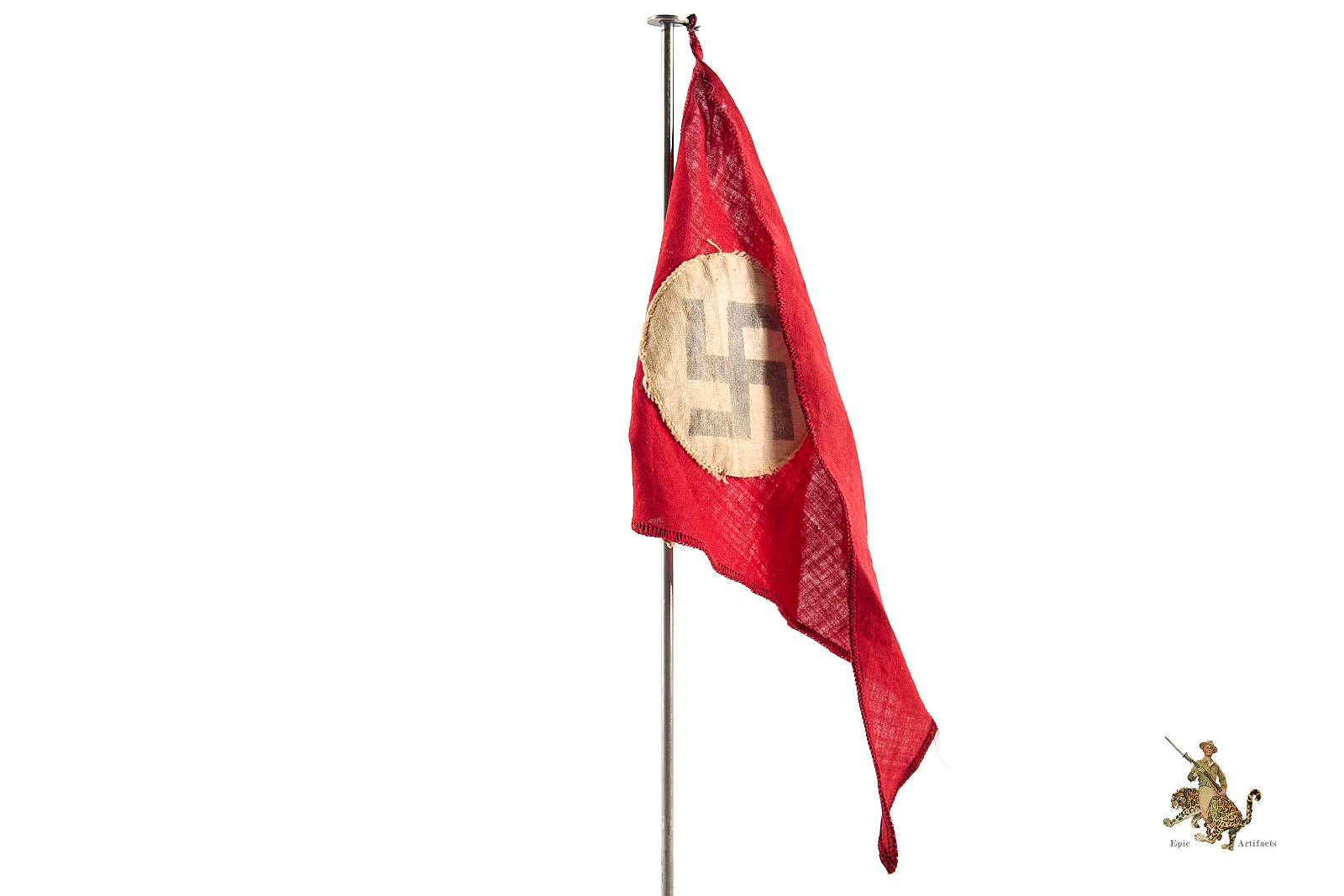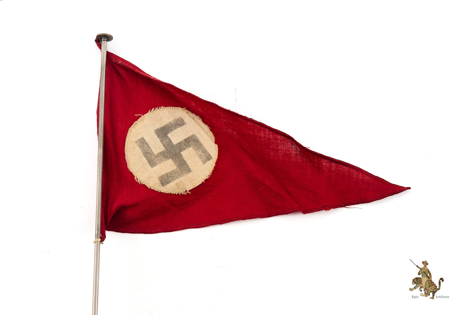 Historical Description: During the Third Reich and WWII, a wide variety of flags and pennants were used on German cars and vehicles. In the military, vehicle flags and pennants were used to indicate branch or rank, or specific command roles. The various civilian organizations also had vehicle flags and pennants for members of their organization or to denote the vehicles of officers, leaders, or people in specific roles. Even political leaders had their own flags, which were often rank specific. Some of the flags, especially military ones, were simply printed, and some were machine woven or stitched, while the flags for political leaders and the highest-ranking military personnel were more decorative and often elaborately hand embroidered in bullion wire. Some vehicle flags were mass produced, including simple national flag type swastika emblem pennants that could have been bought by any patriotic supporter. Others were unique. These flags were attractive souvenirs for GI troops at the end of the war and are eagerly collected today.