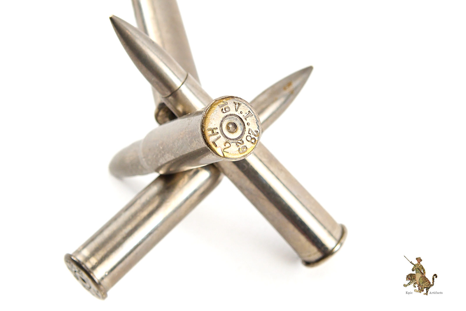 The pole mount is constructed of 4 8mm inert rounds that have been silver toned and soldered together to make a base mount for the flag pole.  the central round has come unsoldered and slides up and down the pole.  Shells are marked V.I. 28 HL and are dated 1928 or 1929.  A unique piece that would fit well in any Third Reich collection.
