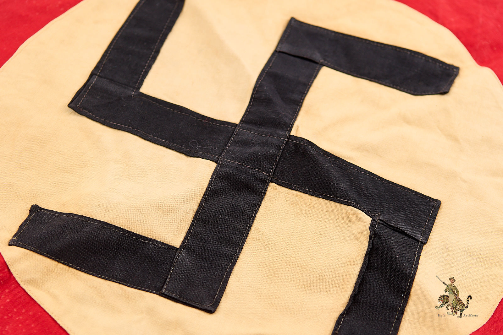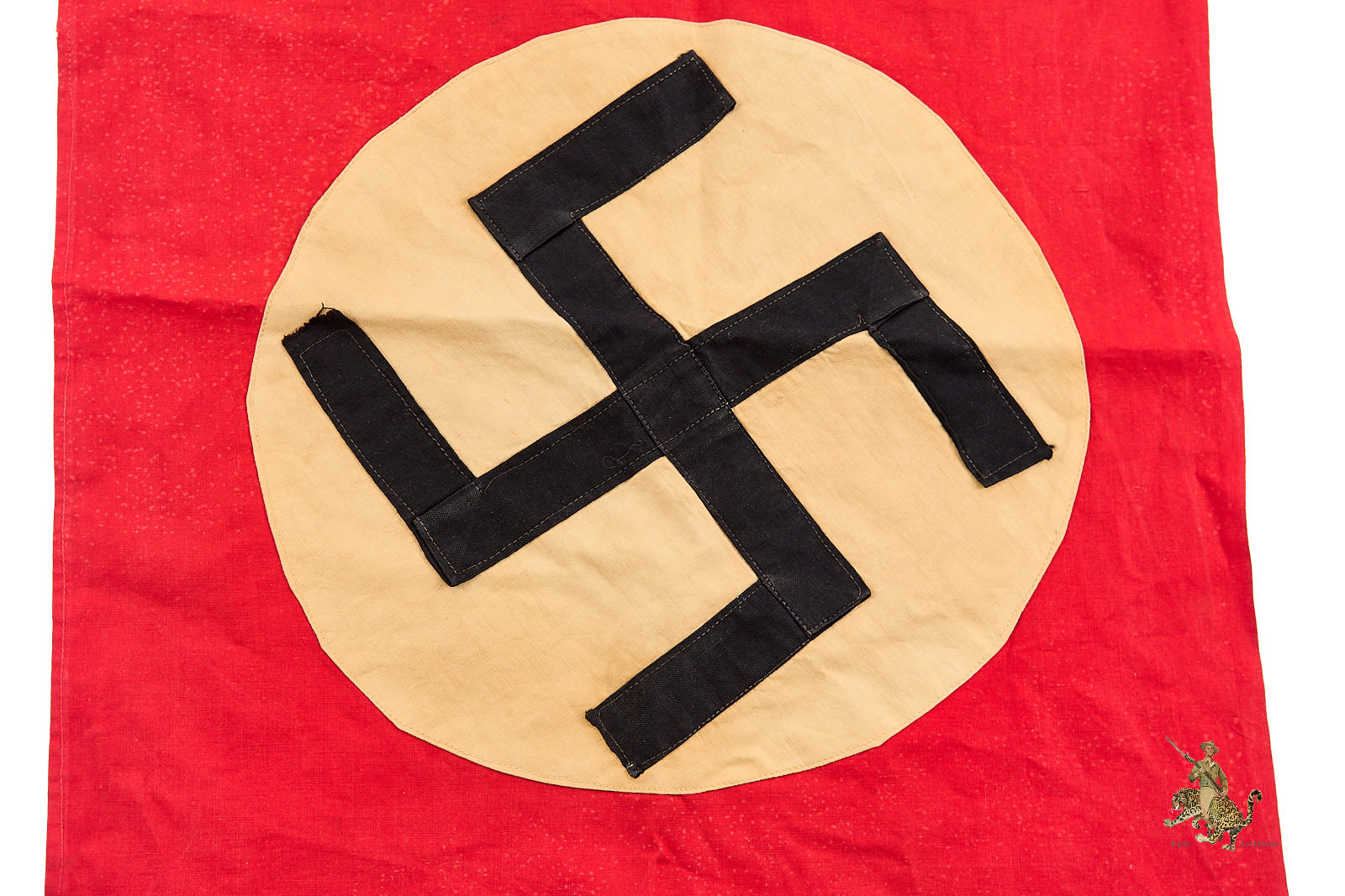 Historical Description: The red flag with white central disk and black swastika was introduced by Hitler in the 1920s as the flag of the National Socialist political party. In 1933, shortly after the Nazis took power, this party flag was recognized alongside the black-white-red Imperial tricolor as one of Germany’s national flags. In 1935, the use of the tricolor flag was discontinued, and between September 1935 and May 8, 1945, the Nazi party flag was the sole national flag of Germany. From its creation in the 1920s through the end of the war, this swastika flag was made and used in endless variations, from the massive banners hung at Party Day rallies to small pennants, bunting flags, and hand-held paper flags distributed along parade routes. These flags, banners and pennants flew from ships, were hung from official and private buildings, and were displayed outside business and private homes. At the end of WWII, the Allied military governments abolished the use of all Nazi symbols, including the national flag. Most Third Reich era German national flags were simply destroyed.