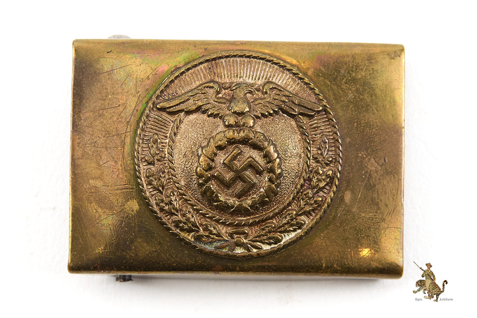 Historical Description: The belt buckle was an important part of the regalia worn by all uniformed military, civil, political and paramilitary organizations during the Third Reich. The belt (“Koppel”) was part of the uniform and would always be worn while on duty. The belt buckle (“Koppelschloss”) was generally specific to each organization, with many organizations having separate belt buckles for officers and for enlisted personnel, sometimes with different colors and finishes to further denote specific purposes. The buckles were adorned with various mottos and designs specific to the organizations for which they were intended. Many designs used the German national eagle emblem, in a variety of forms. Belt buckles were worn with uniforms ranging from finely tailored officer parade uniforms, to the issue uniforms of enlisted soldiers in combat. Generally speaking, most German belt buckles of the Third Reich were made with two prongs on the reverse, to allow the buckle to be worn and adjusted on a belt. The buckle had a catch that would mate with a hook on the belt, when worn. The earliest Third Reich buckles were often made of brass, or nickel silver. Later, aluminum became very common, and was used on private purchase as well as enlisted buckles of the German military, with or without a painted or plated finish. After WWII began, most enlisted military buckles were steel. Nazi belt buckles were popular souvenirs for Allied troops who served in Europe. Some types were made by the millions and remain quite common today. Others were made in limited numbers and are very rare.