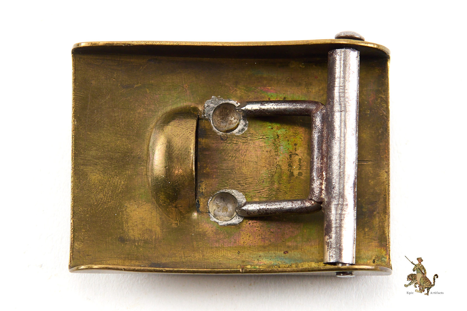 Product Description: This Smaller HJ/SA Buckle was worn by the NSDAP Jugend, the predecessor to the Hitler Youth organization. The front of this buckle is adorned with a brass roundel bearing a political style eagle and swastika. The roundel shows some wear to the brass base metal at the high points of the design. The surviving finish in the recesses shows attractive age toning. The buckle body is made of brass, with pleasant, uncleaned age patina and toning throughout. The reverse of this Smaller HJ/SA Buckle shows typical age patina and light wear. The integral catch for the belt hook is intact, and the solder joints affixing the roundel show no signs of alteration or repair. The roller bar and prongs assembly is made of plated steel, with some surface corrosion. There is no maker mark, as is typical for these. This is a nice example of this buckle type, in excellent condition.