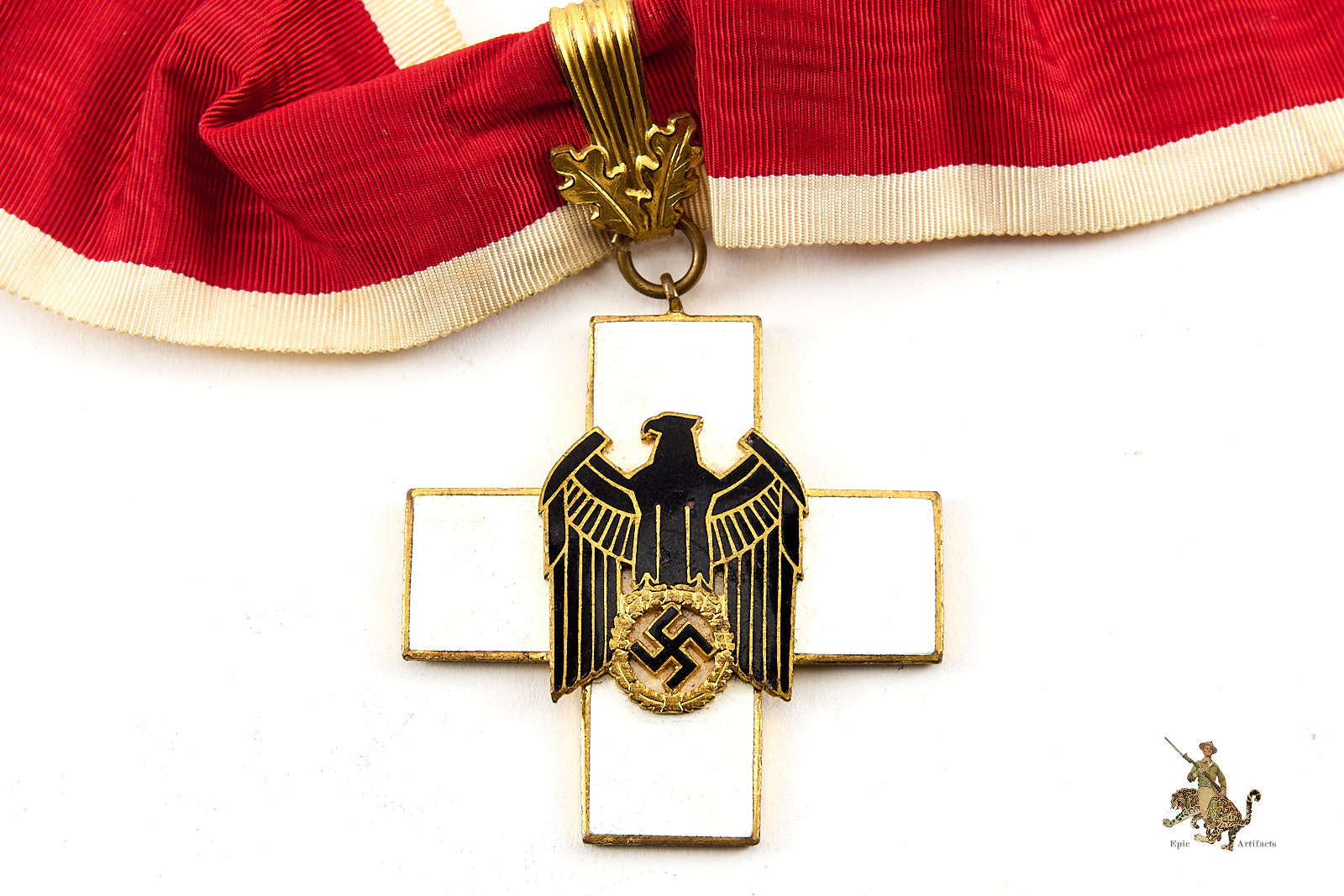 Historical Description: On May 1, 1939, Adolf Hitler introduced a new series of social welfare awards to reward contributions to the German civil population. The official introduction of this series of awards stated that they were to be awarded for achievements in the areas of social welfare, the winter relief organization, care of sick and wounded in wartime and in peace, rescue work, care of the German people and of ethnic Germans in other countries. These awards replaced an early series of Red Cross award. The lowest grade of the new series of awards was called the “Medaille der deutschen Volkspflege,” often referred to as the Social Welfare Medal. The medal was made of bronze or zinc with a silver fuinish, and bore a German national eagle and swastika on the front, superimposed on a cross. The rear bore the inscription “Medaille für deutsche Volkspflege.” The higher grades of the award were designed by Prof. Richard Klein in the form of a cross and called the “Ehrenzeichen der deutschen Volkspflege.” The cross was a white enameled cross, on which was affixed a black and white enameled German eagle and swastika. There were four grades of the cross. The highest level, the I. Stufe (first class), was a large breast star that had the cross affixed to 1 4-pointed star. The II. Stufe of the cross was worn around the neck on a broad ribbon. The III. Stufe was a pin-back cross, and the IV. Stufe was a medal suspended from a ribbon. These Social Welfare decorations were classified as National Socialist awards after the war and were not permitted to be worn after 1945.