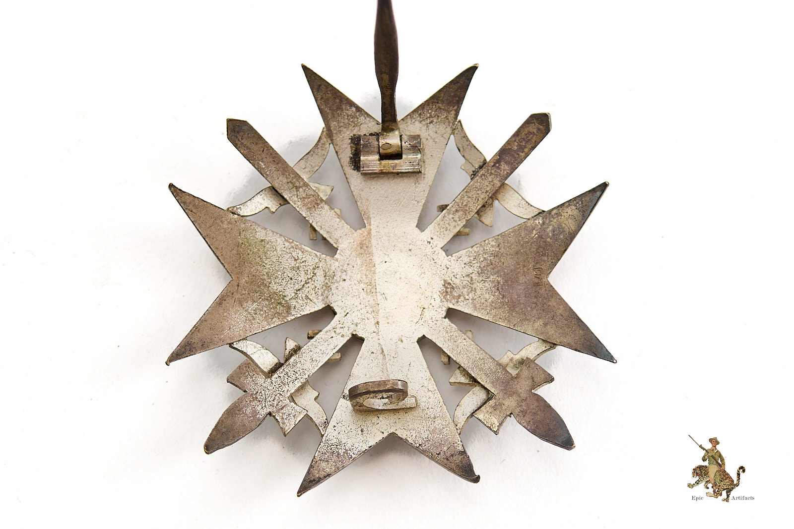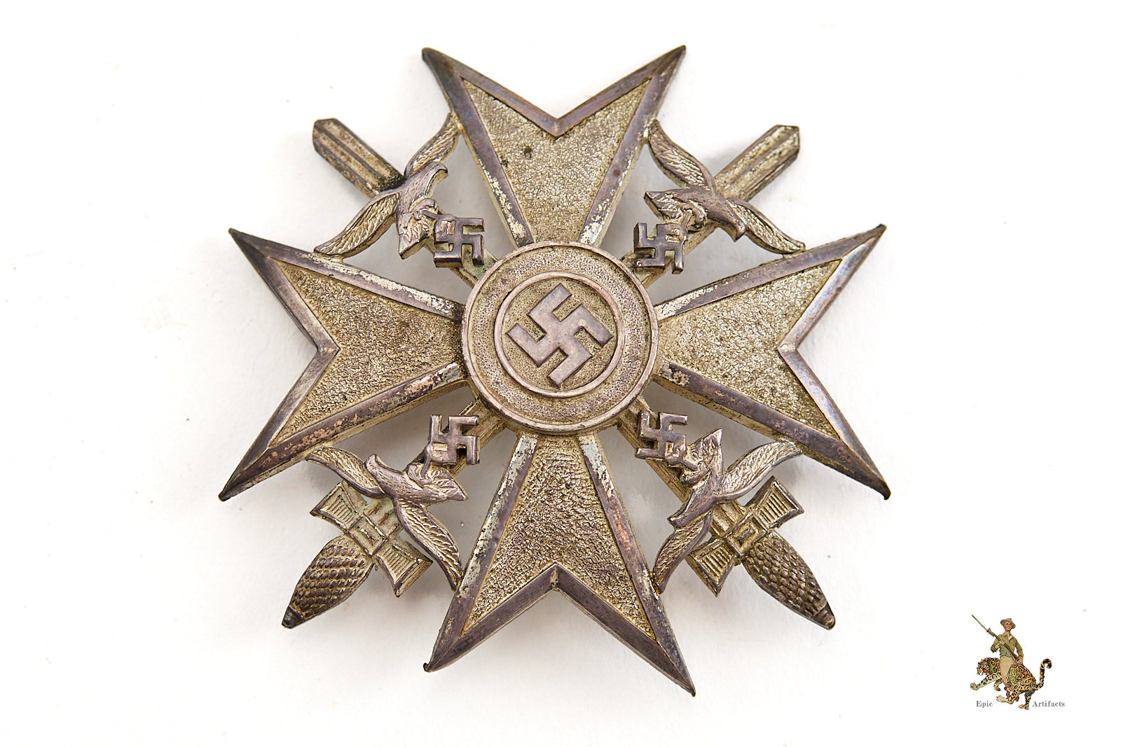 Historical Description: The Spanish Cross (Spanienkreuz) was instituted on April 14, 1939, to recognize the achievements of German personnel who participated in the Spanish Civil War between 1936 and 1939. It was in the shape of a Maltese cross with a swastika in the center and Luftwaffe eagle emblems in the spaces between the four arms. The pin-backed award was issued in four classes: Bronze, Silver, Gold, and Gold with Diamonds. Bronze and Silver classes were made both with and without swords. Silver and Bronze awards without swords were for non-combatants and was issued to military and civilian personnel with three months of wartime experience in Spain, with the Silver version issued for merit. The Bronze award with swords was for combatants, the Silver award with swords was for soldiers who took part in decisive battles and who had considerable fighting experience, and the Gold award was for great merit. The highest grade. The Spanish Cross in Gold with Diamonds, was very rarely awarded and reserved for those who showed the greatest merit or who had high leadership skills in battle. There was also a version made for the next of kin of men who had been killed; this was a medal suspended from a ribbon, rather than a pin-on badge. Unlike most German awards, the Spanish Cross was worn on the right side of the uniform.