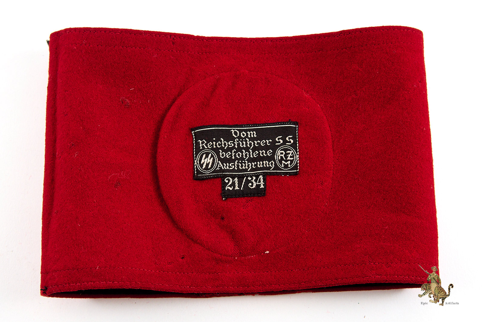 Product Description: A particularly fine and well-preserved SS Armband with RZM Cloth Tag, representing one of the most iconic and sought-after patterns of SS regalia. This regulation issue armband, worn by all ranks with both dress and service uniforms, is constructed of high-quality red wool of the typical plain weave type, retaining strong original color and texture. The fabric shows a pleasing nap overall, with minor mothing and small surface flaws consistent with age.