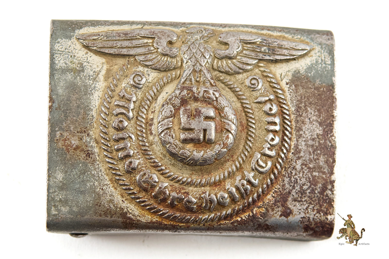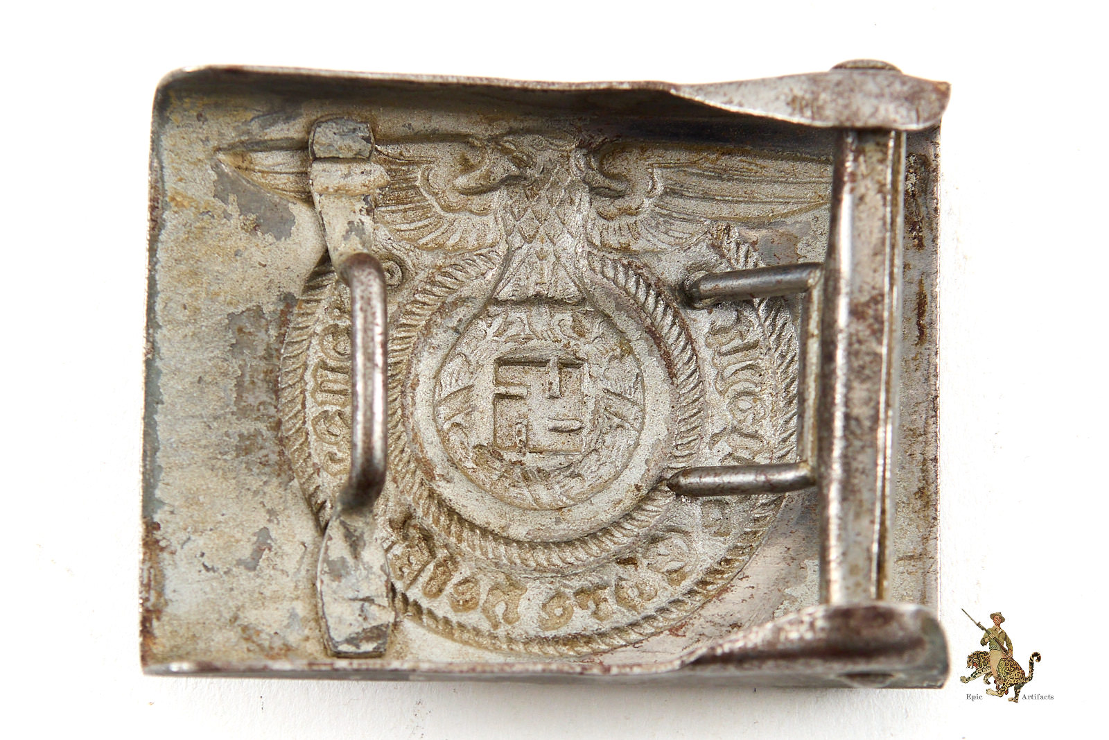 Product Description: This is a beautiful, worn, original SS EM/NCO Buckle. It is made of steel. This one retains around remnants of the original silver factory applied paint. The obverse of this SS buckle shows corrosion and wear, with remnants of the silver paint remaining only in the recesses of the design. The bare steel has an old, uncleaned patina that gives this a wonderful depth. The reverse of this SS EM/NCO Buckle features a functional catch and prong assembly for affixing this to a belt, and also shows remnants of the original paint. No markings found on this buckle. This great buckle shows no damage and no sign of repair. Overall this buckle rates in excellent condition.