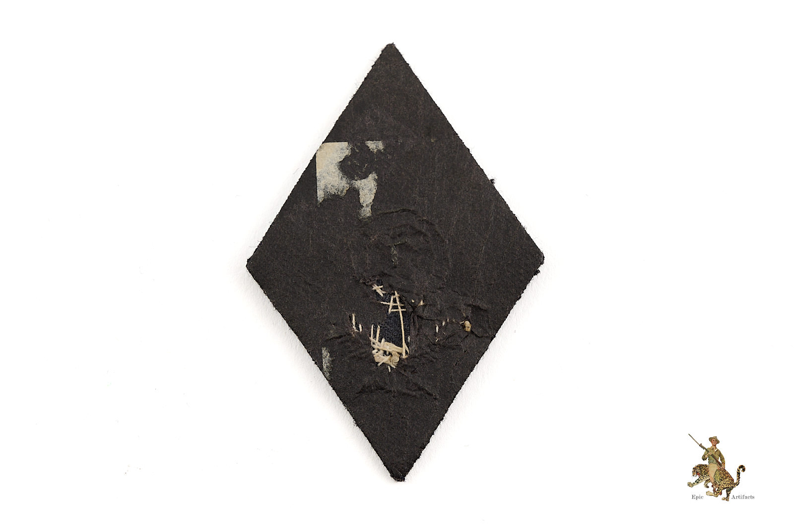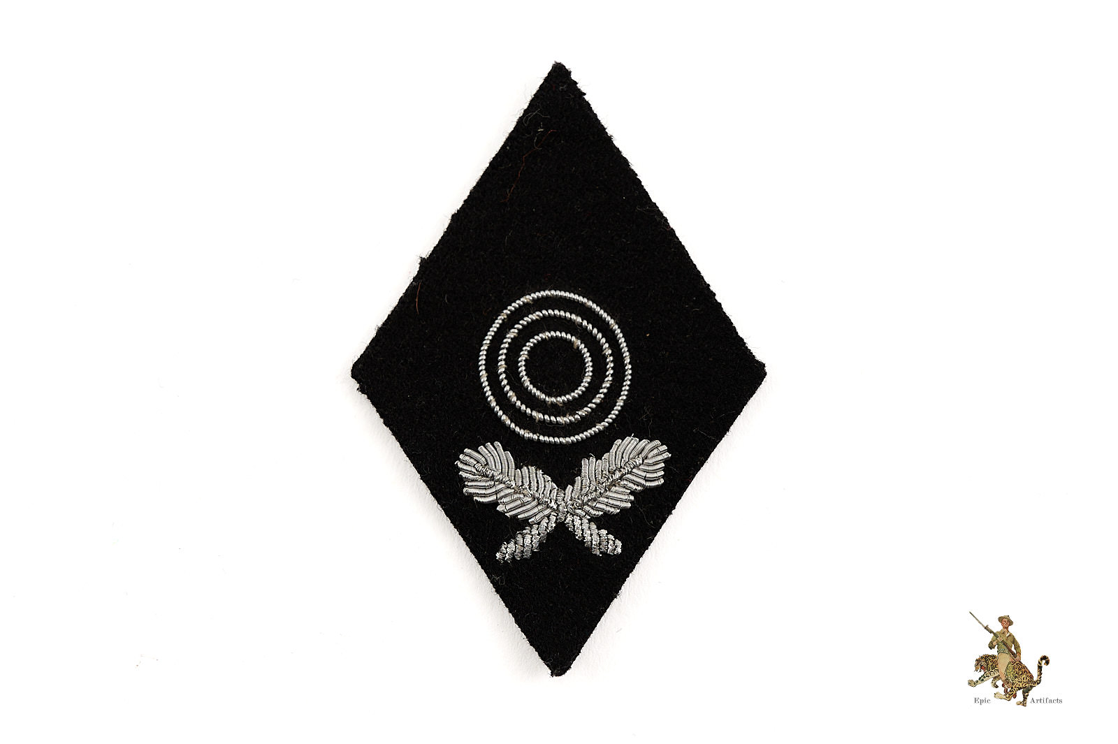 Product Description: This SS Marksman 1st Class Sleeve Diamond is an unissued and nearly pristine example of this piece of SS insignia. This patch features a vertical black wool diamond base with a hand embroidered “target” consisting of three concentric circular rings, positioned above two crossed oak leaves. The target and oak leaves are neatly hand embroidered in aluminum wire bullion. All of the embroidery is intact. On the reverse, this SS Marksman 1st Class Sleeve Diamond has a backing of black paper. The original paper backing is mostly intact, with a couple of small tears that show the back side of the hand embroidery. This diamond shows no stitch holes or any other indication of having been affixed to a uniform sleeve. There is only minimal age toning to note. This piece has a great look and would be tough to upgrade. The condition rates as excellent plus.