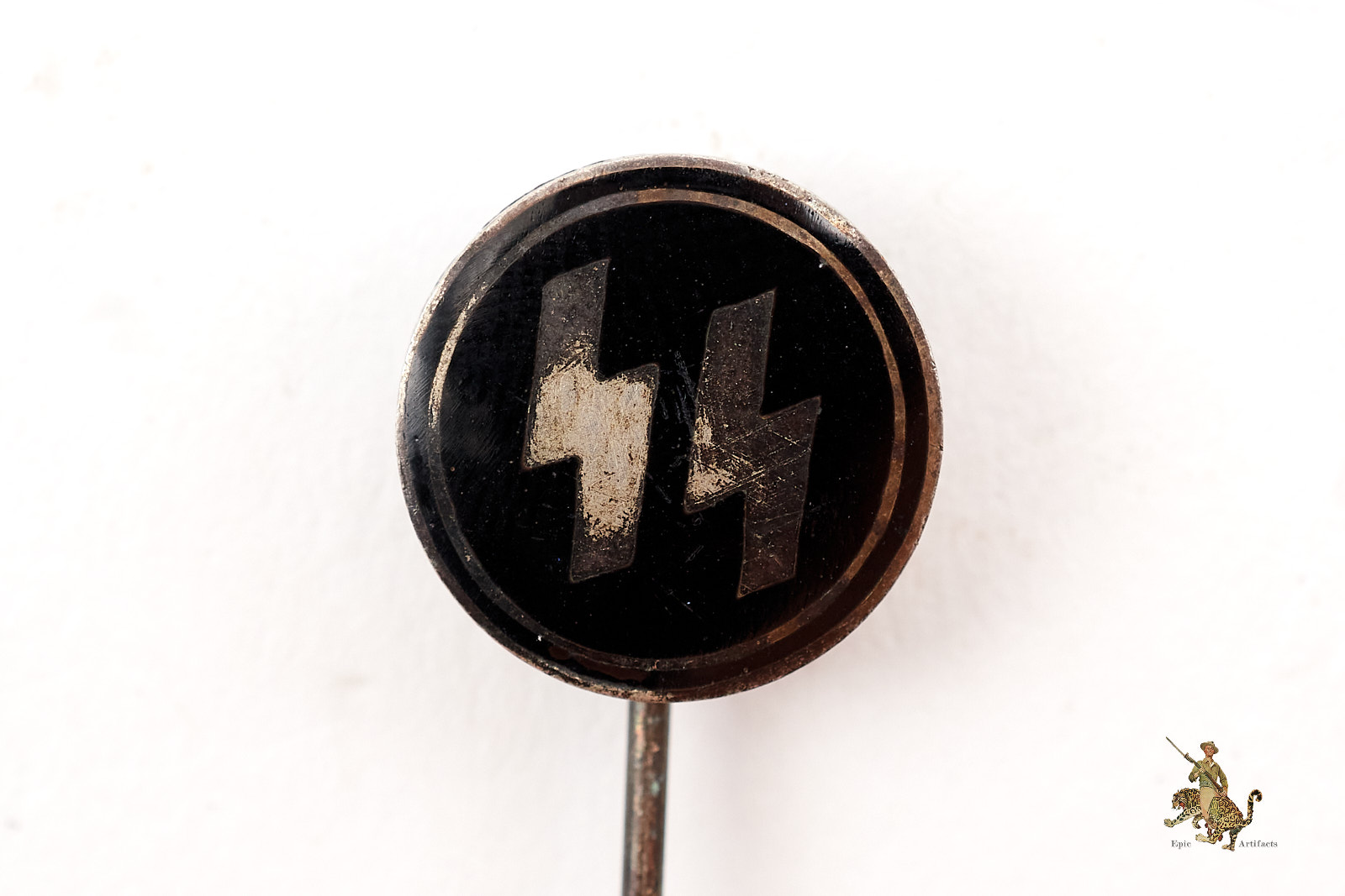 Product Description: This is a very nice example of a desirable SS Membership Pin. This SS Zivilabzeichen was intended for wear on civilian clothes by SS members. It is a prewar piece, made of nickel silver. The obverse depicts the runic organizational emblem of the SS in silver on a black enamel field, surrounded by two circles. The pin appears to have been worn, but retains original silvering on the runes on the front. The high-quality enamel is completely intact, with no cracks or chips. The reverse of this SS Membership Pin is maker marked “Hofstatter, Bonn”and is also marked “Ges. Gesch.” indicating a legally protected design. It is also serial numbered, “34047.” The pin is straight, and tapers to a point, and has correctly spaced grooves along its length. The pin is affixed by means of a soldered pin plate. The pin has a small period done reinforcement where it attaches to the plate. This pin is a very attractive piece of regalia, that remains in excellent plus condition.