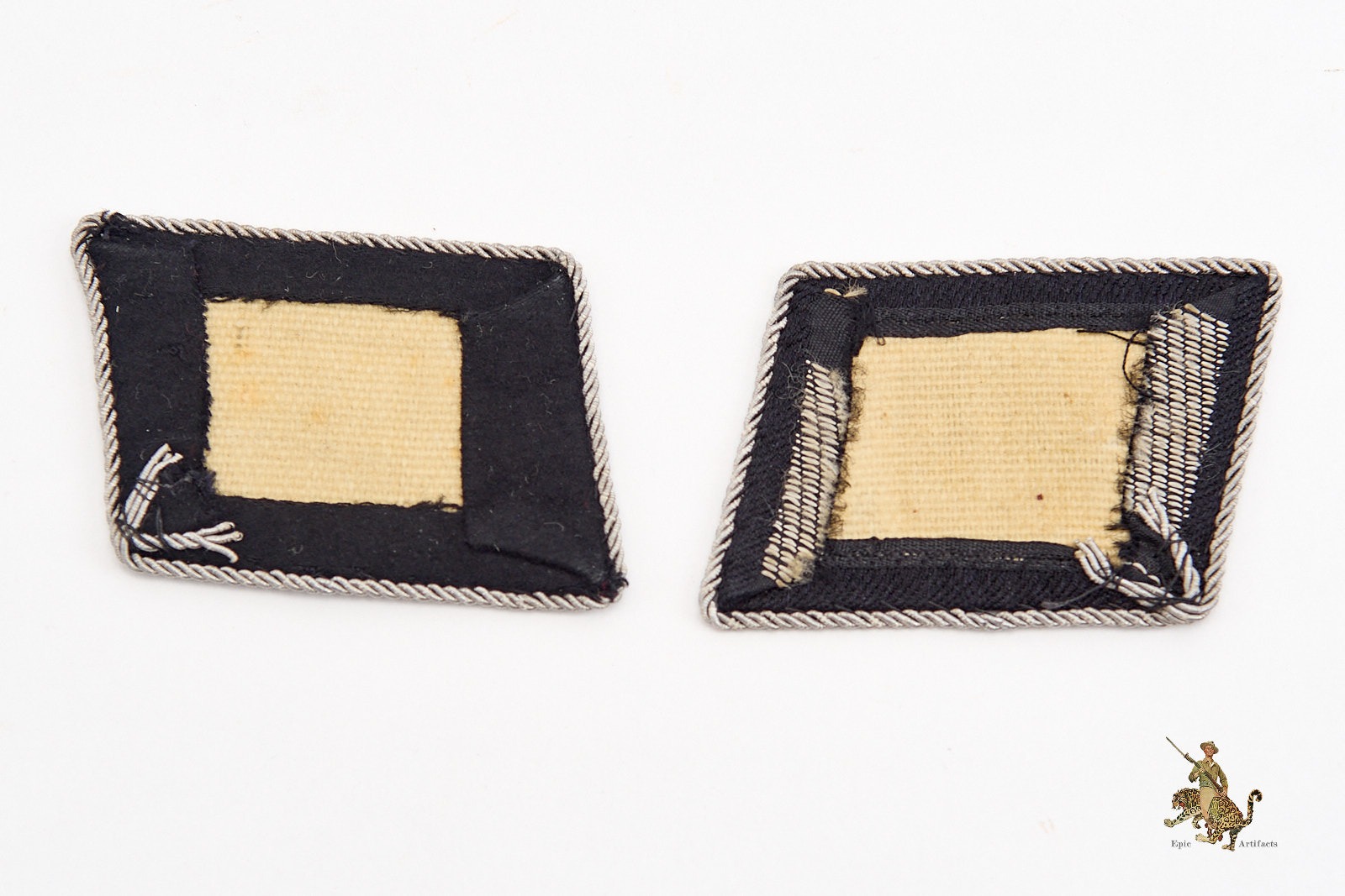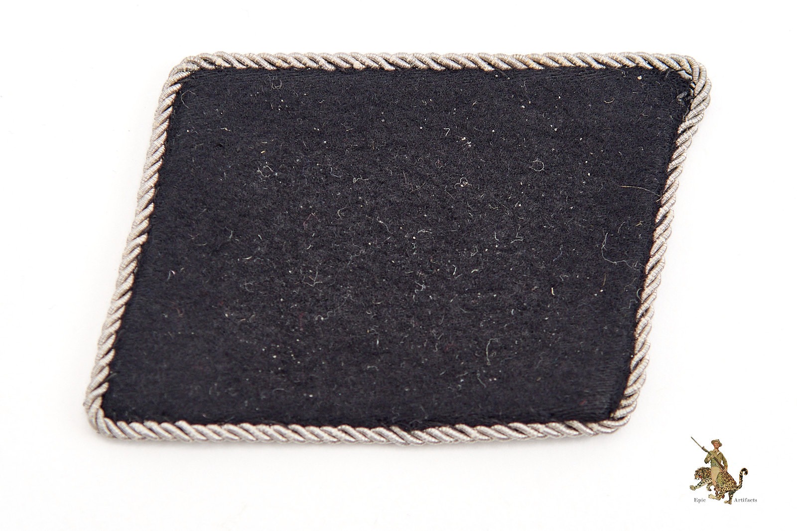 Historical Description: Regulations for the SS Collar Tab went through quite an evolution in just a short 16-year period. The first SS Collar Tabs were introduced in 1929 by Heinrich Himmler as part of the newly introduced SS uniform code. Initially, tabs were worn by both lower rank SS men and their senior leaders. Lower ranks would wear a rank tab as well as a numbered unit identification tab, with senior leaders wearing their rank tabs on both collars. In 1933 the well-known “SS” runic tab was adopted by Hitler’s personal bodyguard detachment, the “Leibstandarte” or “LAH”. The LAH used this runic tab in lieu of the numerical unit identification tab to identify them as members of the elite unit protecting the “Führer”. In 1934 the runic “SS” tabs were again adopted for use by the early “SS-VT” units. This adoption eventually led to the widespread use of SS runic tabs by German Divisions; the later non-German volunteer units would not be permitted to wear the runes, and bore their own unit designed patch instead. SS Collar tabs can be found in an extraordinary variety of numbers, designs, and pipings depending on unit and rank, from hand-embroidered tabs worn by officers to mass produced embroidered and machine woven types that were used on combat uniforms.