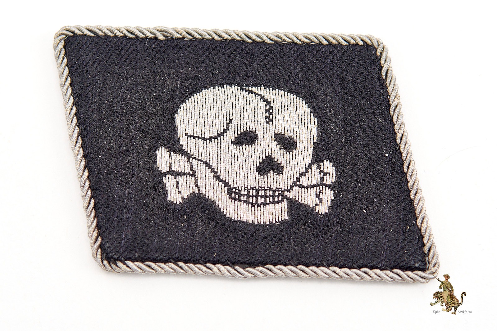 Product Description: An exceptionally well-preserved and visually striking matching set of SS Officer flat wire collar tabs, executed in the iconic BeVo machine-woven style—a hallmark of elite SS insignia and one of the most instantly recognizable forms of Third Reich regalia. This tab set showcases the highly detailed silver-gray SS Totenkopf (death’s head) motif, precisely woven onto a deep black rayon backing, with razor-sharp definition and excellent contrast on one tab, and a black wool second tab. Both are neatly wrapped is silver bullion thread.