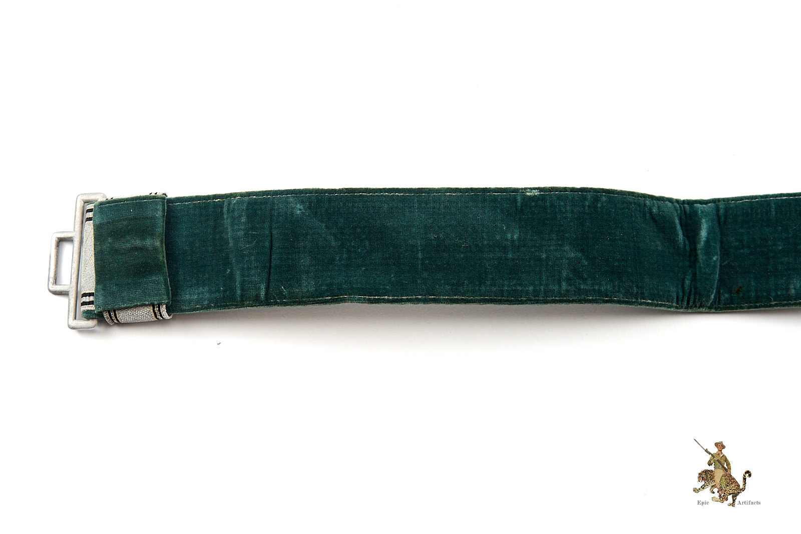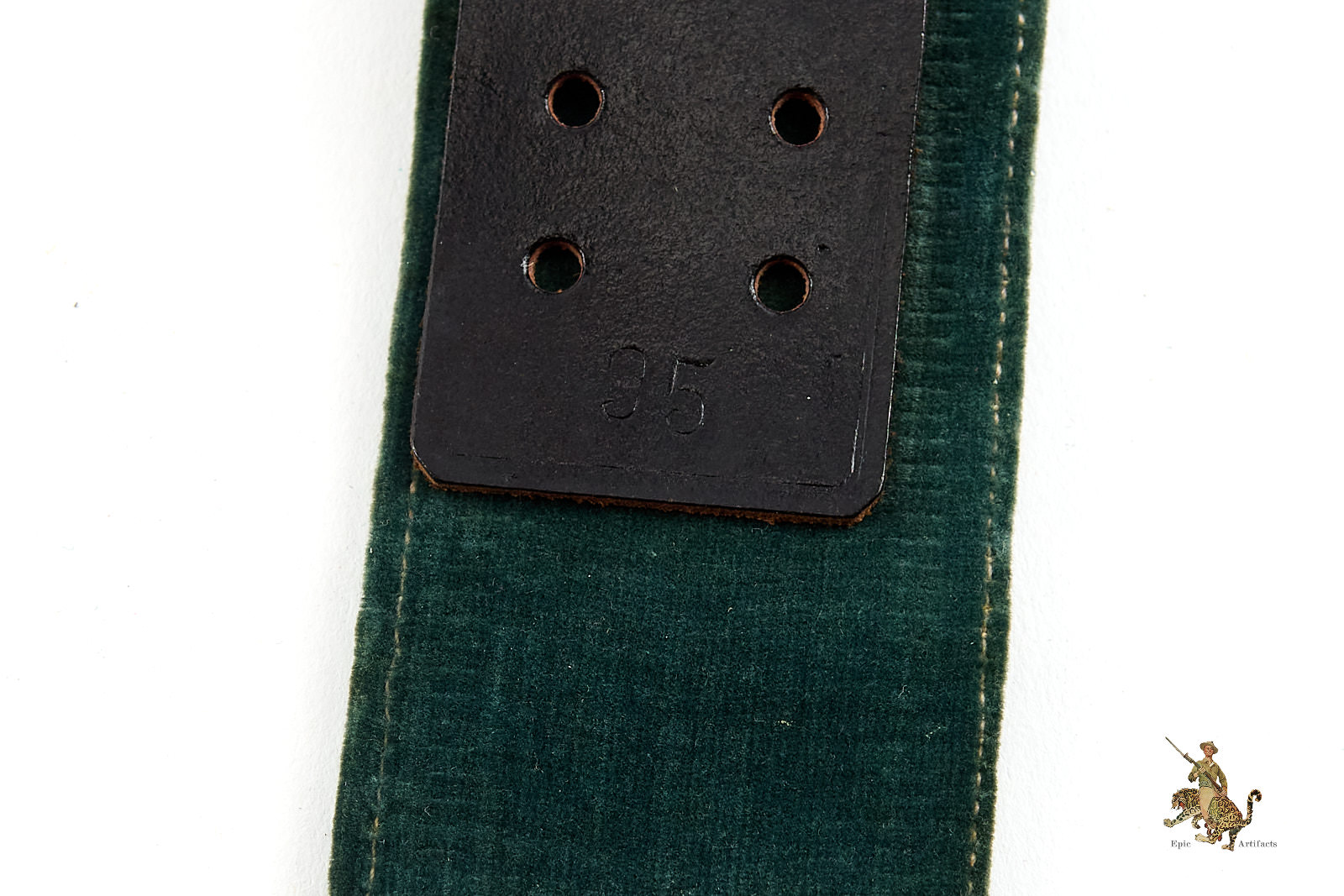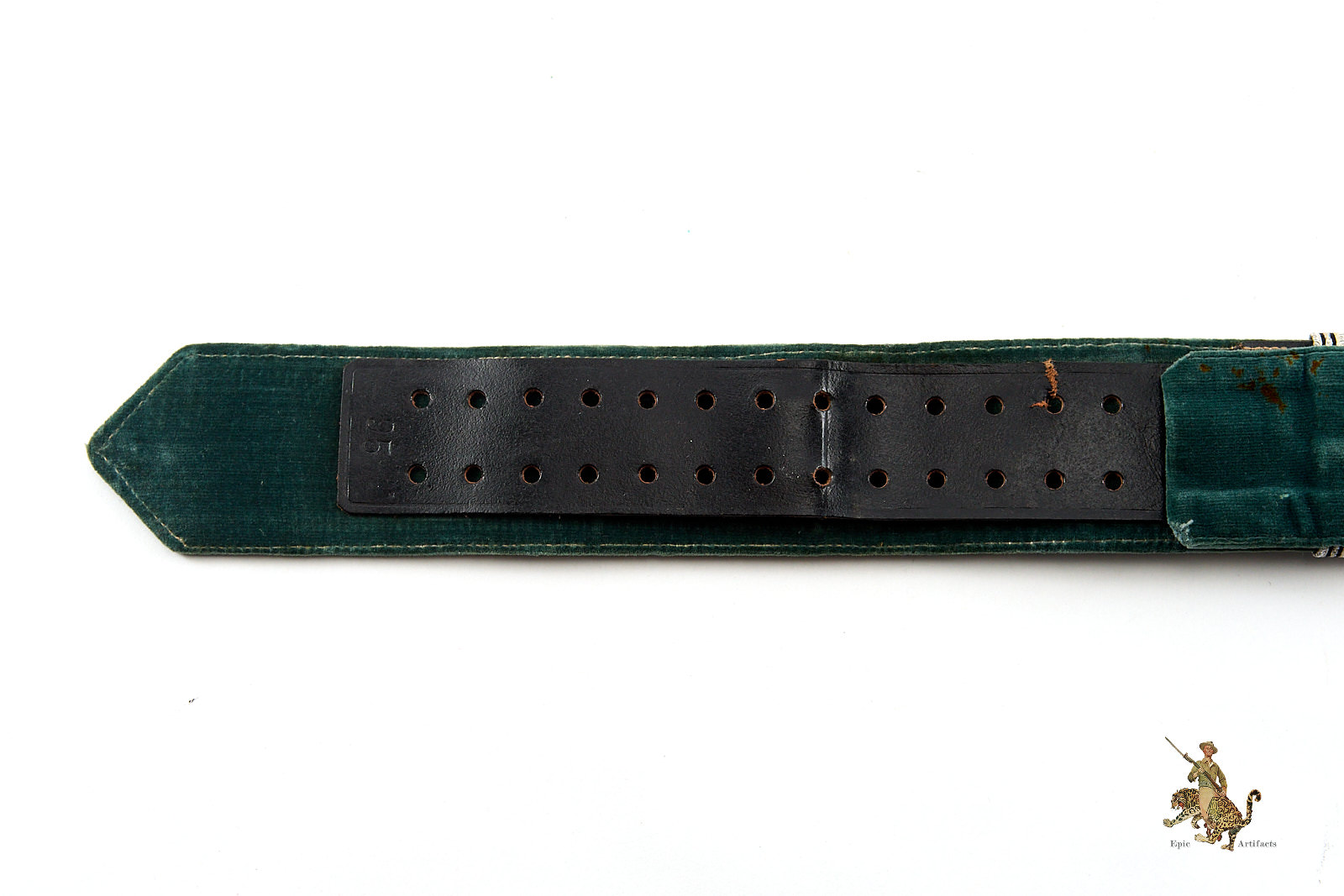 Product Description: A finely preserved SS Brocade Belt & Buckle, notable for its exceptional state of conservation and striking visual presence. The brocade belt is overall in near-mint condition, with no wear or damage to the metal bullion wire, which retains a vibrant, even metallic sheen. Finely interwoven SS runes extend crisply along the full length of the belt. The velour backing remains largely intact, exhibiting only minor areas of discoloration and a few small holes consistent with age. The leather adjustment strap is supple and complete, with a small tear at one hole that does not detract from the belt’s overall presentation. The belt is clearly marked size 95 and presents in a pleasing flat lay, making it particularly well suited for display.