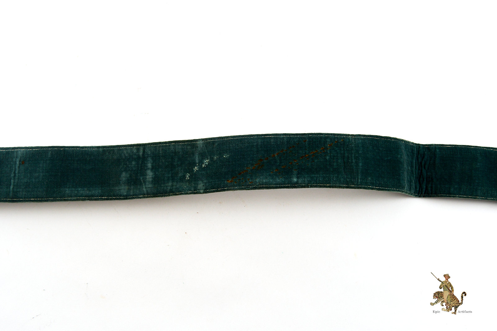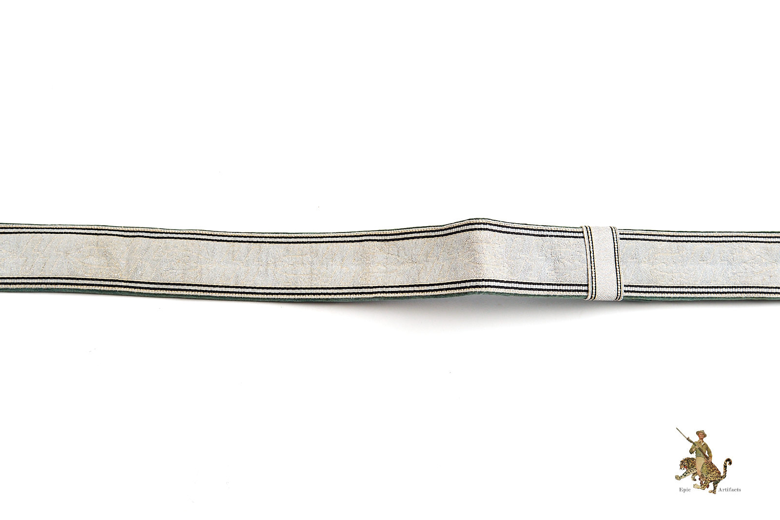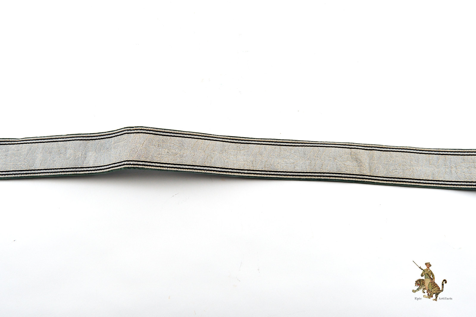 Product Description: A finely preserved SS Brocade Belt & Buckle, notable for its exceptional state of conservation and striking visual presence. The brocade belt is overall in near-mint condition, with no wear or damage to the metal bullion wire, which retains a vibrant, even metallic sheen. Finely interwoven SS runes extend crisply along the full length of the belt. The velour backing remains largely intact, exhibiting only minor areas of discoloration and a few small holes consistent with age. The leather adjustment strap is supple and complete, with a small tear at one hole that does not detract from the belt’s overall presentation. The belt is clearly marked size 95 and presents in a pleasing flat lay, making it particularly well suited for display.