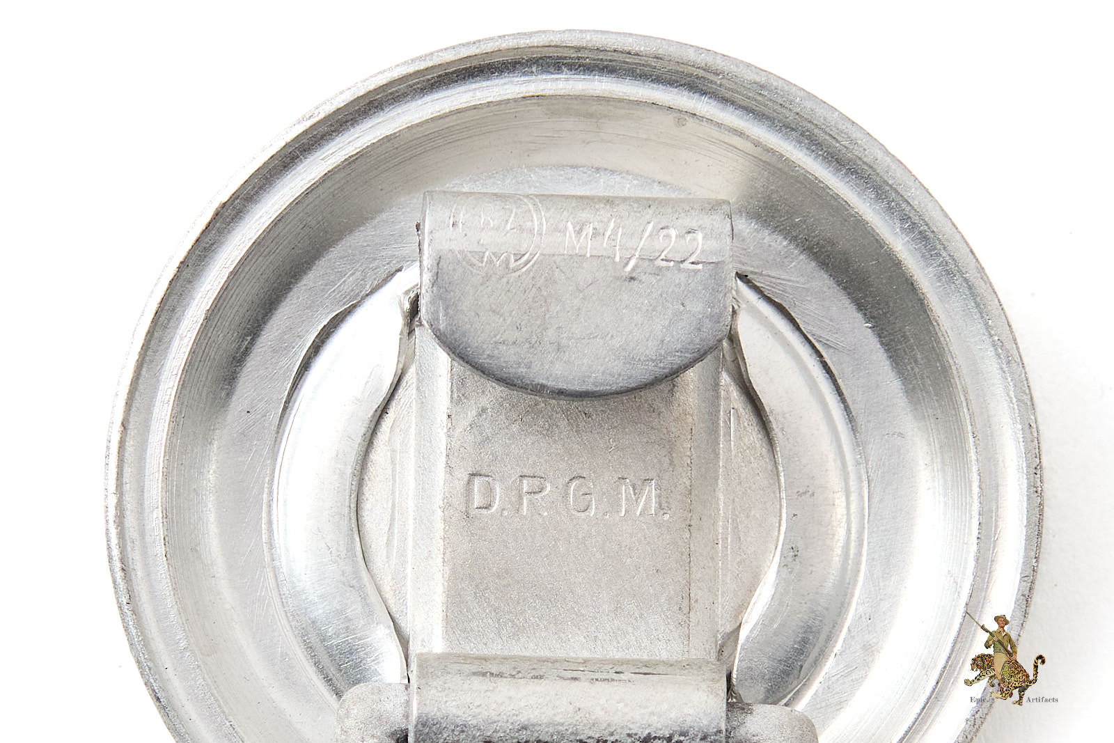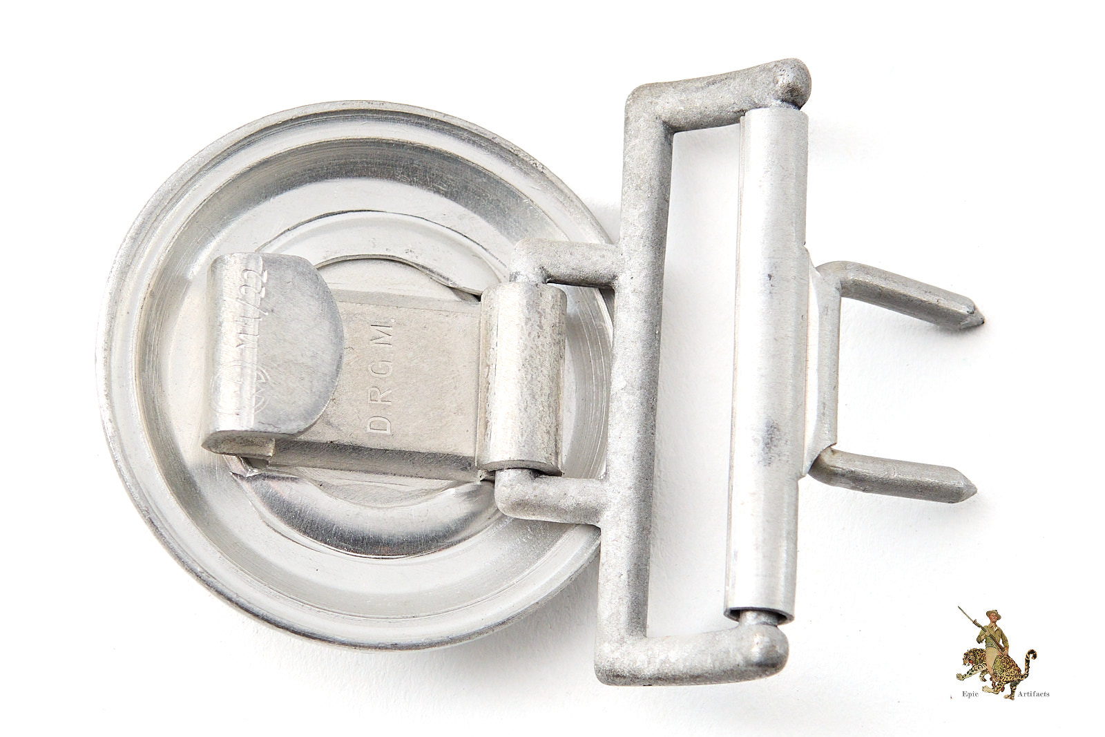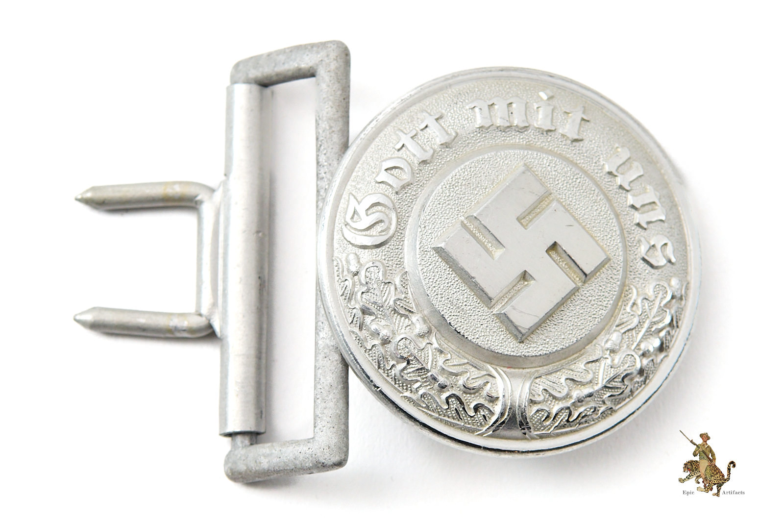Historical Description: The belt buckle was an important part of the regalia worn by all uniformed military, civil, political, and paramilitary organizations during the Third Reich. The belt (“Koppel”) was part of the uniform and would always be worn while on duty. The belt buckle (“Koppelschloss”) was generally specific to each organization, with many organizations having separate belt buckles for officers and for enlisted personnel, sometimes with different colors and finishes to further denote specific purposes. The buckles were adorned with various mottos and designs specific to the organizations for which they were intended. Many designs used the German national eagle emblem, in a variety of forms. Belt buckles were worn with uniforms ranging from finely tailored officer parade uniforms, to the issue uniforms of enlisted soldiers in combat. Generally speaking, most German belt buckles of the Third Reich were made with two prongs on the reverse, to allow the buckle to be worn and adjusted on a belt. The buckle had a catch that would mate with a hook on the belt, when worn. The earliest Third Reich buckles were often made of brass, or nickel silver. Later, aluminum became very common, and was used on private purchase as well as enlisted buckles of the German military, with or without a painted or plated finish. After WWII began, most enlisted military buckles were steel. Nazi belt buckles were popular souvenirs for Allied troops who served in Europe. Some types were made by the millions and remain quite common today. Others were made in limited numbers and are very rare.