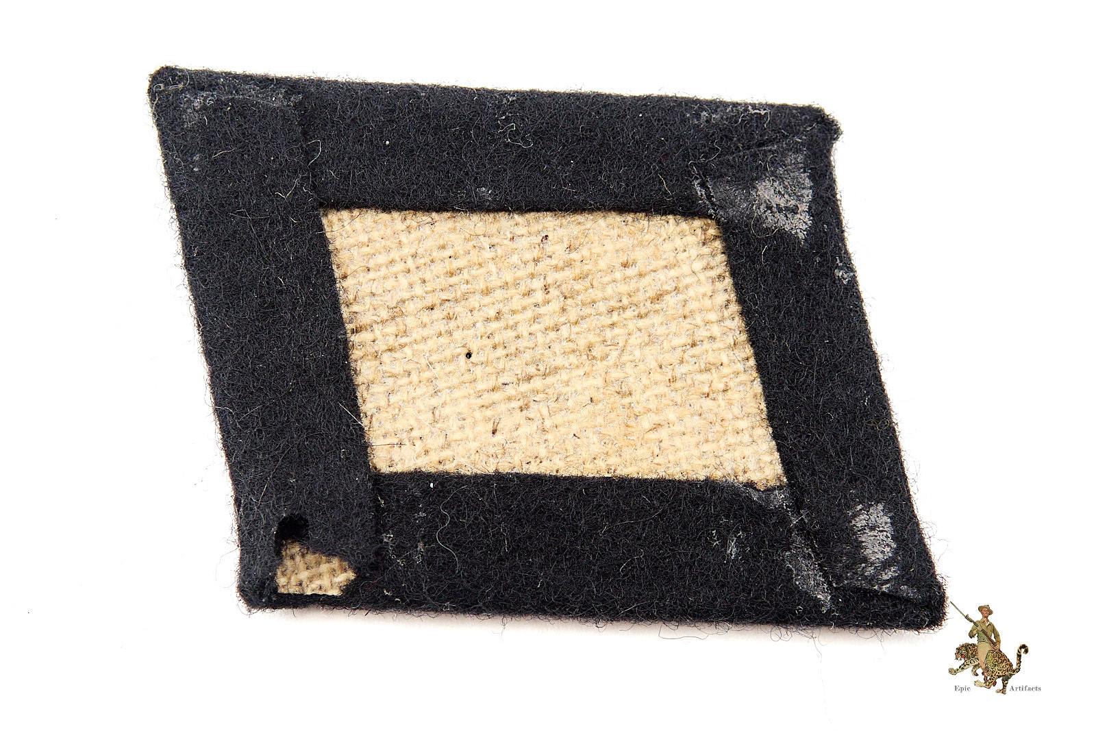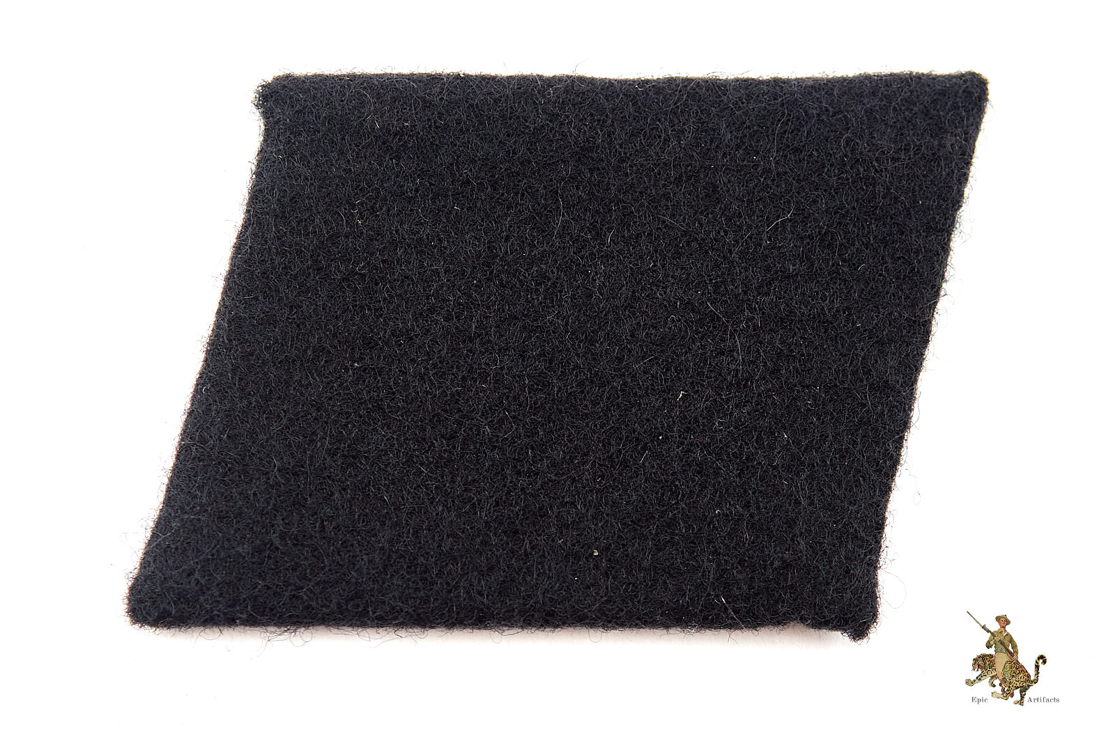 Product Description: An original, unissued example of a Waffen-SS rank collar tab in excellent condition. Constructed of black wool badge cloth, the obverse surface retains its full nap with virtually no wear. There are no stitch holes or evidence of prior application, confirming the tab was never issued or sewn to a uniform. The reverse reveals neatly folded wool edges over a textbook internal stiffener made from lacquered cheesecloth, consistent with wartime production standards. There is some mothing, and what looks to be glue residue possibly from being mounted in an album.