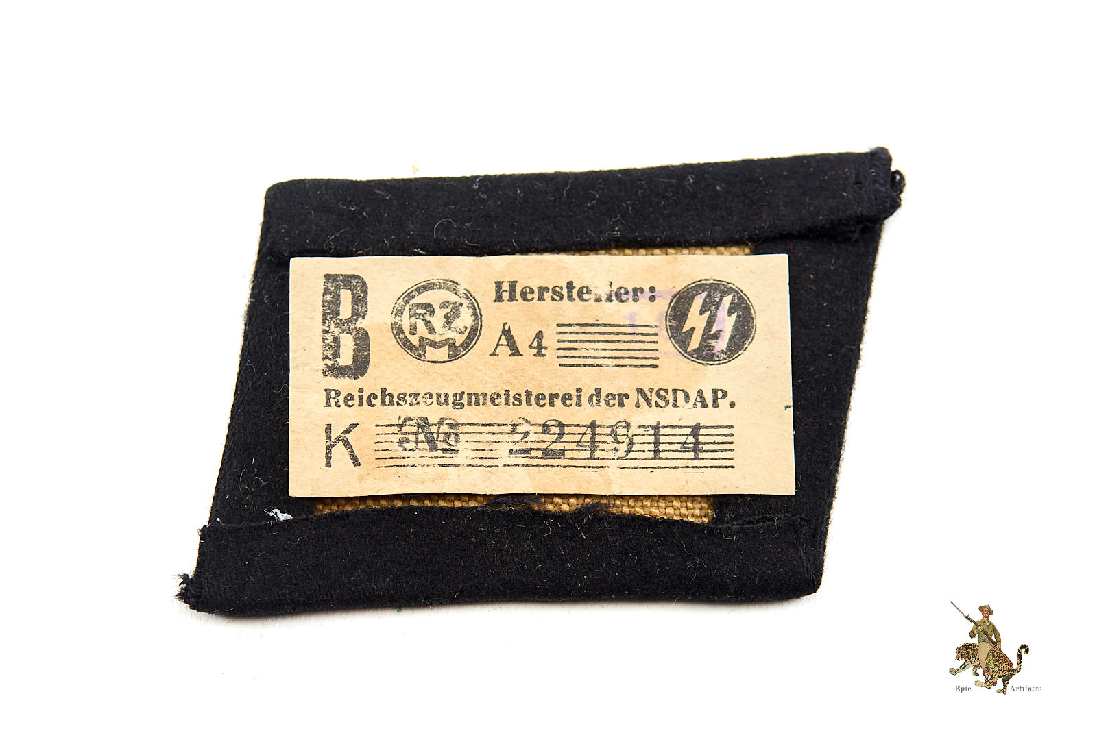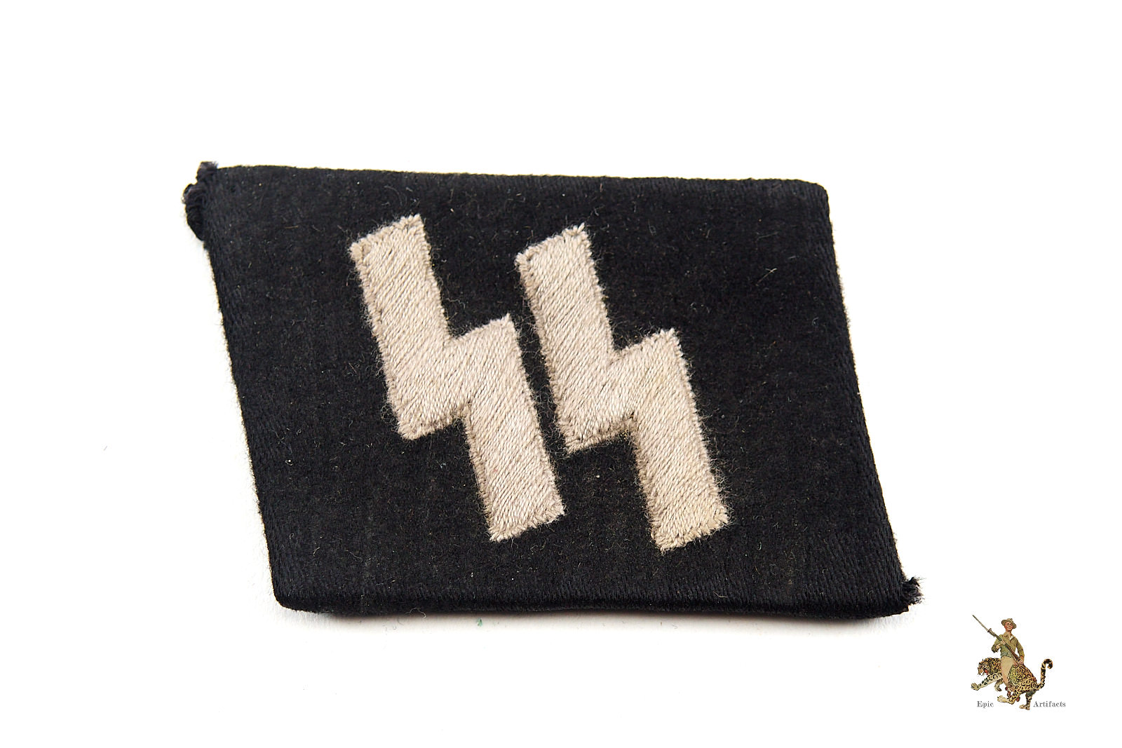 Product Description:  An exceptional and highly desirable example of a wartime SS Rune Collar Tab, correctly worn on the right collar by members of the Schutzstaffel. SS Rune Collar Tab – RZM Tag. This is a machine-embroidered, regulation wartime pattern dating from circa 1940–1945, produced without collar piping, as expected for this type.