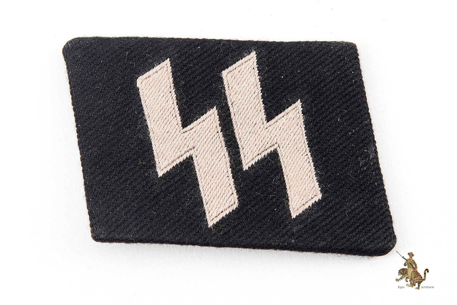 Historical Description: Regulations for the SS Collar Tab went through quite an evolution in just a short 16-year period. The first SS Collar Tabs were introduced in 1929 by Heinrich Himmler as part of the newly introduced SS uniform code. Initially, tabs were worn by both lower rank SS men and their senior leaders. Lower ranks would wear a rank tab as well as a numbered unit identification tab, with senior leaders wearing their rank tabs on both collars. In 1933 the well-known “SS” runic tab was adopted by Hitler’s personal bodyguard detachment, the “Leibstandarte” or “LAH”. The LAH used this runic tab in lieu of the numerical unit identification tab to identify them as members of the elite unit protecting the “Führer”. In 1934 the runic “SS” tabs were again adopted for use by the early “SS-VT” units. This adoption eventually led to the widespread use of SS runic tabs by German Divisions; the later non-German volunteer units would not be permitted to wear the runes, and bore their own unit designed patch instead. SS Collar tabs can be found in an extraordinary variety of numbers, designs, and pipings depending on unit and rank, from hand-embroidered tabs worn by officers to mass produced embroidered and machine woven types that were used on combat uniforms.