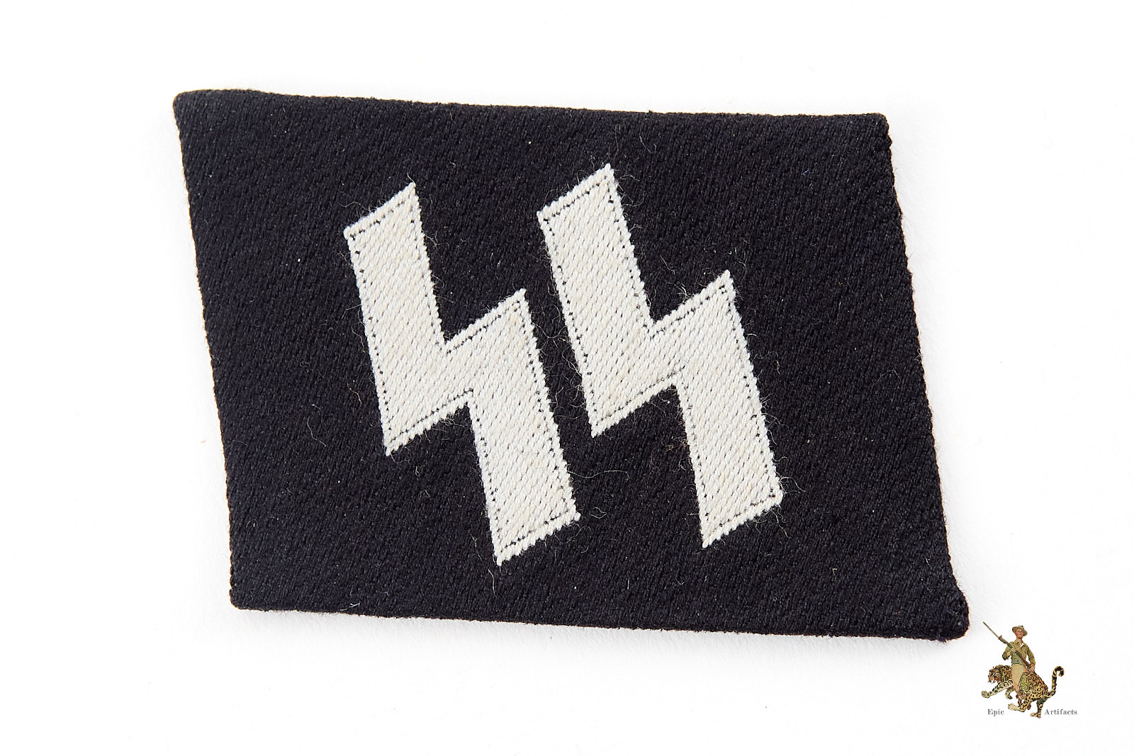 Historical Description: Regulations for the SS Collar Tab went through quite an evolution in just a short 16-year period. The first SS Collar Tabs were introduced in 1929 by Heinrich Himmler as part of the newly introduced SS uniform code. Initially, tabs were worn by both lower rank SS men and their senior leaders. Lower ranks would wear a rank tab as well as a numbered unit identification tab, with senior leaders wearing their rank tabs on both collars. In 1933 the well-known “SS” runic tab was adopted by Hitler’s personal bodyguard detachment, the “Leibstandarte” or “LAH”. The LAH used this runic tab in lieu of the numerical unit identification tab to identify them as members of the elite unit protecting the “Führer”. In 1934 the runic “SS” tabs were again adopted for use by the early “SS-VT” units. This adoption eventually led to the widespread use of SS runic tabs by German Divisions; the later non-German volunteer units would not be permitted to wear the runes, and bore their own unit designed patch instead. SS Collar tabs can be found in an extraordinary variety of numbers, designs, and pipings depending on unit and rank, from hand-embroidered tabs worn by officers to mass produced embroidered and machine woven types that were used on combat uniforms.