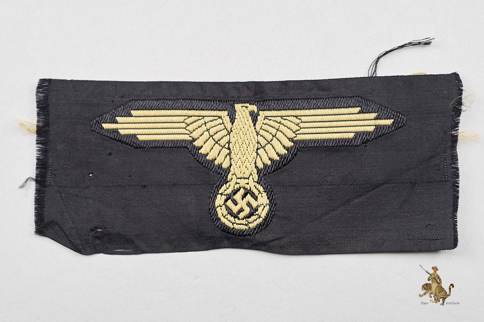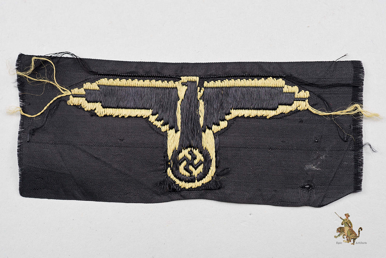 Historical Description: The German Armed Forces (Wehrmacht), as formed in 1935, and as they existed until the end of World War 2, consisted of the Army (Heer), the Air Force (Luftwaffe) and the Navy (Kriegsmarine). The Waffen-SS fell under the command of the Wehrmacht during the war. Each of these branches of service had a unique eagle design that was worn on both the formal dress and parade uniforms, and the field uniforms, of the members of that branch. These eagles were worn on soft headgear, including service and field caps, as well as on the uniform jacket. In the Heer, the Luftwaffe, and the Kriegsmarine, this eagle was worn on the chest of the tunic; collectors have termed these “breast eagles.” The Heer and the Luftwaffe generally used the same eagle style, though variations in color of the eagle or the backing distinguish between the two. The Luftwaffe used their own flying eagle emblem. The Waffen-SS sleeve eagle (and cap eagle) had wings that came to a distinctive tapered point. The cap, breast and sleeve eagles used by the various military branches were manufactured in many variations. There were machine-woven and machine embroidered versions, usually used by officers and NCOs. Hand-embroidered bullion wire eagles were typically for officers. There were metal eagles, for caps, or for uniforms that were intended to have detachable insignia. There were even eagles embroidered on camouflage fabric, intended for use on special field uniforms. There were also eagles in specific colors for use on tropical uniforms. Some of these eagles were mass-produced and are still common today. Others were, and are, very rare.
