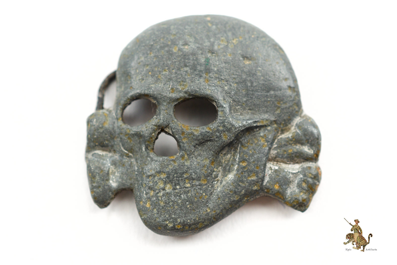 Product Description: A unique and historically significant example of Third Reich insignia, this SS Visor Cap Skull is struck in die-cast zinc.