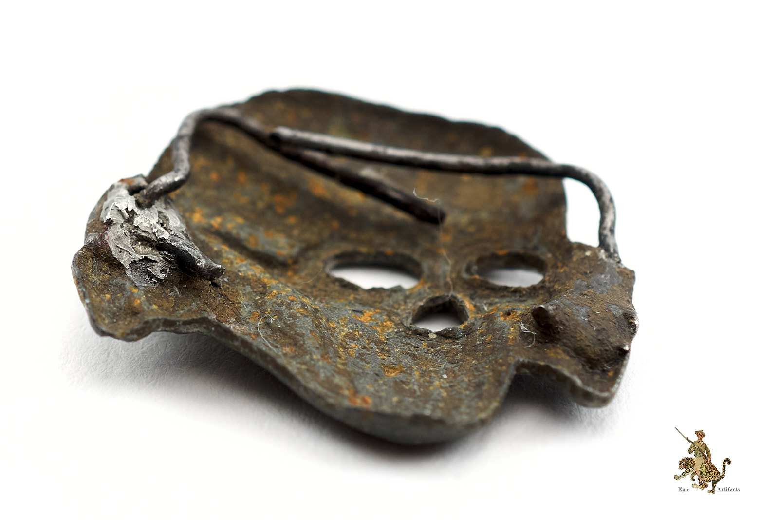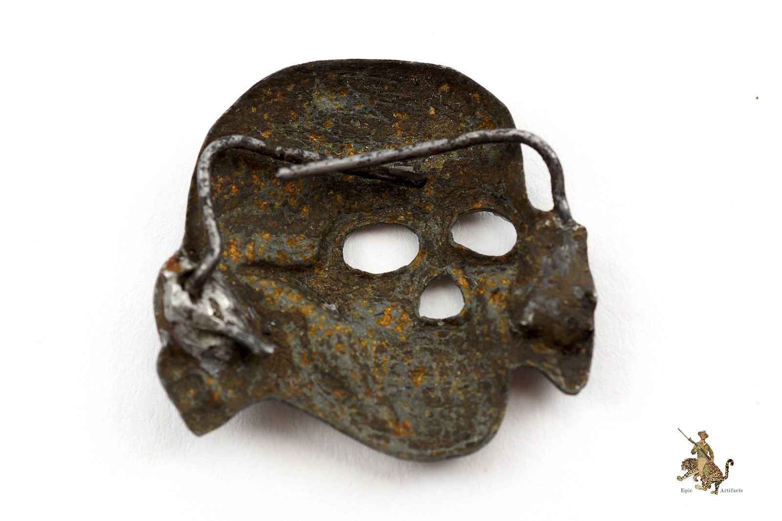 Historical Description: The SS was founded as a paramilitary branch of the Nazi Party in 1925. Beginning in 1927, the SS began to wear a German national eagle and swastika emblem on their headgear. The SS were the first to adopt this practice, but the SA and other Nazi organizations soon began to use the same pinned-on metal cap eagle, which became known as a “political” type cap eagle as it was different from those used by the various military branches. Beneath this eagle, instead of a wreathed national colors cockade, the early SS wore a jawless skull emblem, sometimes called a “Danziger” skull, which was based on a traditional “Totenkopf” death’s-head emblem that had been used in the Prussian military since the time of Frederick the Great. This jawless skull is referred to by collectors as the first pattern SS skull. On October 6, 1934, the SS introduced a new pattern of cap skull that was unlike the traditional design that had previously been adopted. This second pattern SS skull was used until the end of WWII and is the iconic Totenkopf widely associated with the SS today. It was initially worn in conjunction with the political style cap eagle, but in February 1936 the SS introduced a new type of cap eagle to differentiate from other political organizations. This eagle had longer wings than the early political type, and was the pattern worn by the SS together with the second pattern Totenkopf, until 1945. Early SS cap insignia was made from a variety of materials including aluminum, which was left bare, and Tombak, a brass alloy, which was treated with a silver finish. Some examples were made of a composite material called CupAl, which is made by coating aluminum with copper sheet using a special mechanical process. Later, during the later years of WWII, SS cap insignia was generally made of zinc that was treated with a silver wash. As with all SS regalia, SS cap insignia is very collectible today.