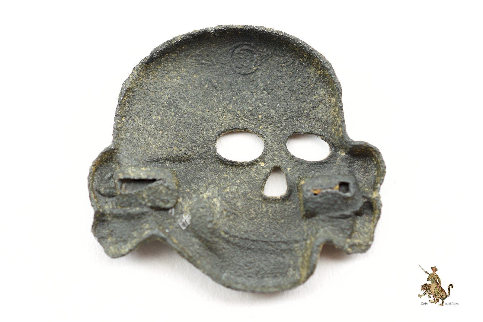 While the original attachment prongs are absent, the skull remains structurally sound and displays an even, attractive patina across the surface. All original finish has been lost, leaving behind a distinctive texture, possibly indicative of ground recovery, yet key features such as the teeth, jawline, and eye sockets remain clearly defined on the obverse. The reverse retains crisp stamped details, including the prominent RZM M1/24 marking.