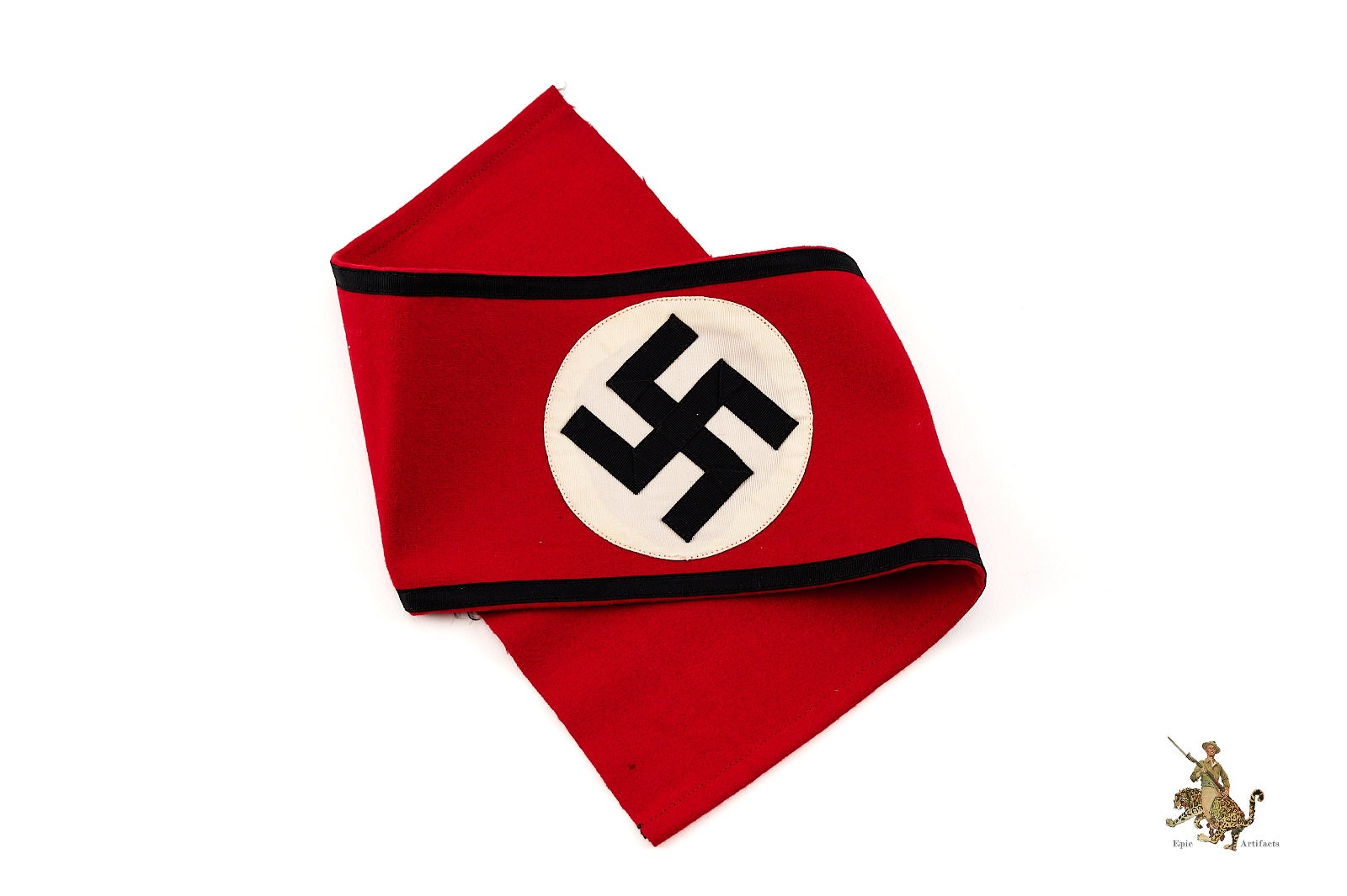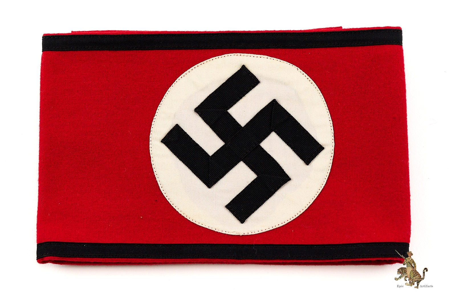 Historical Description: Nearly every military, civil, political, and paramilitary organization in existence during the Third Reich used armbands. Armbands were worn on military and civilian uniforms and also on civilian clothes, from suit jackets to work clothing. They were used to denote membership in organizations, to indicate a specific role or function of the bearer, and as insignia of rank. Many organizations would change the design of their armbands over time, which added to the variety produced. These were manufactured in countless variations, ranging from simple printed bands to elaborately hand-embroidered pieces of the highest quality. Some Nazi armbands were worn by all members of large organizations and were made by the millions. Others were intended for use at a specific time and place and were unique. Many types were made in very limited numbers. Some bore metal insignia or special identifiers that indicated the wearer’s rank, unit affiliation, or nationality. Armbands were sometimes but not always marked with ink stamps by the issuing authorities.