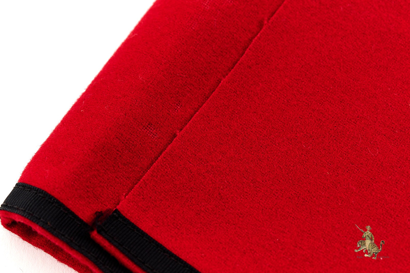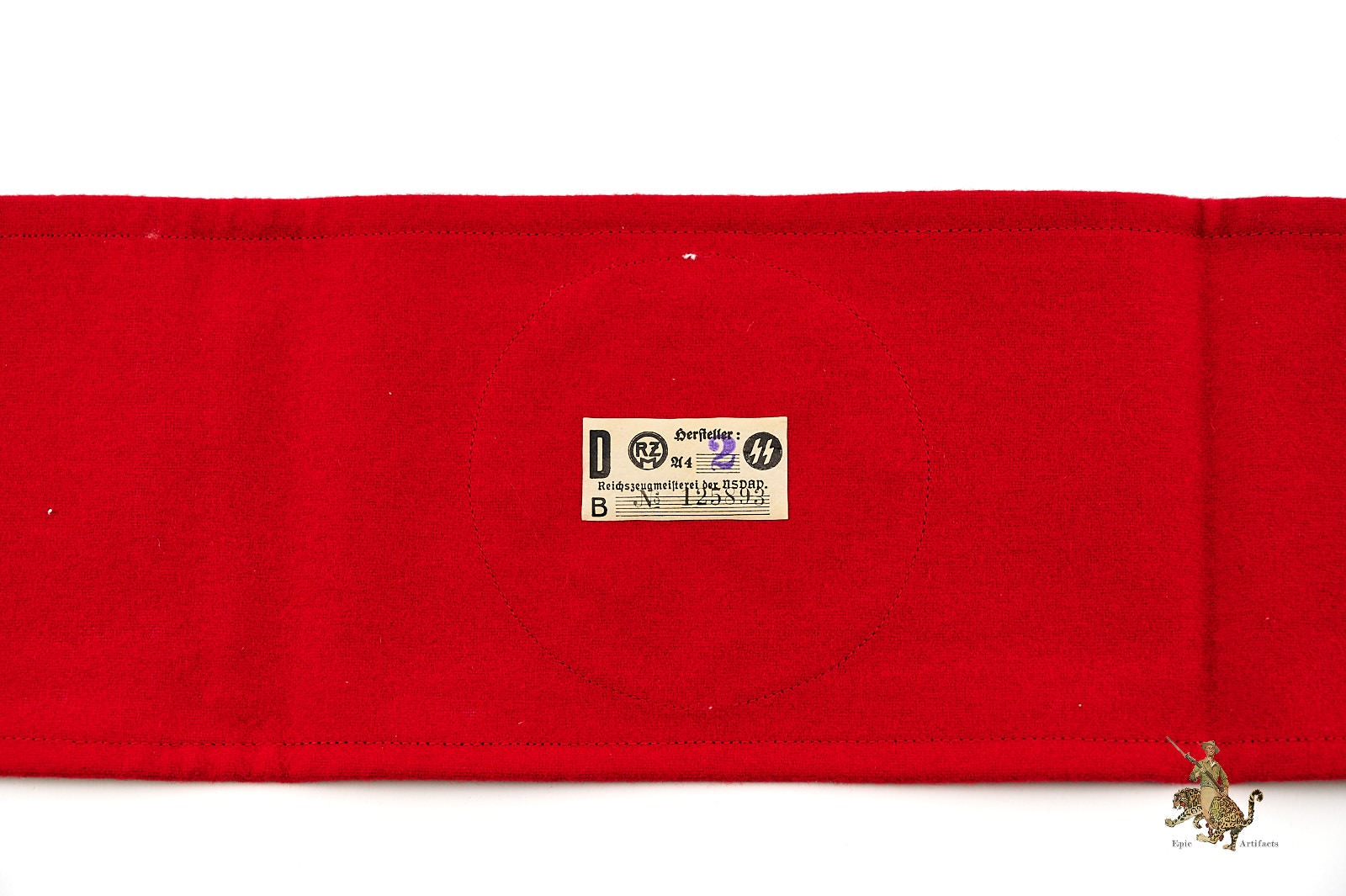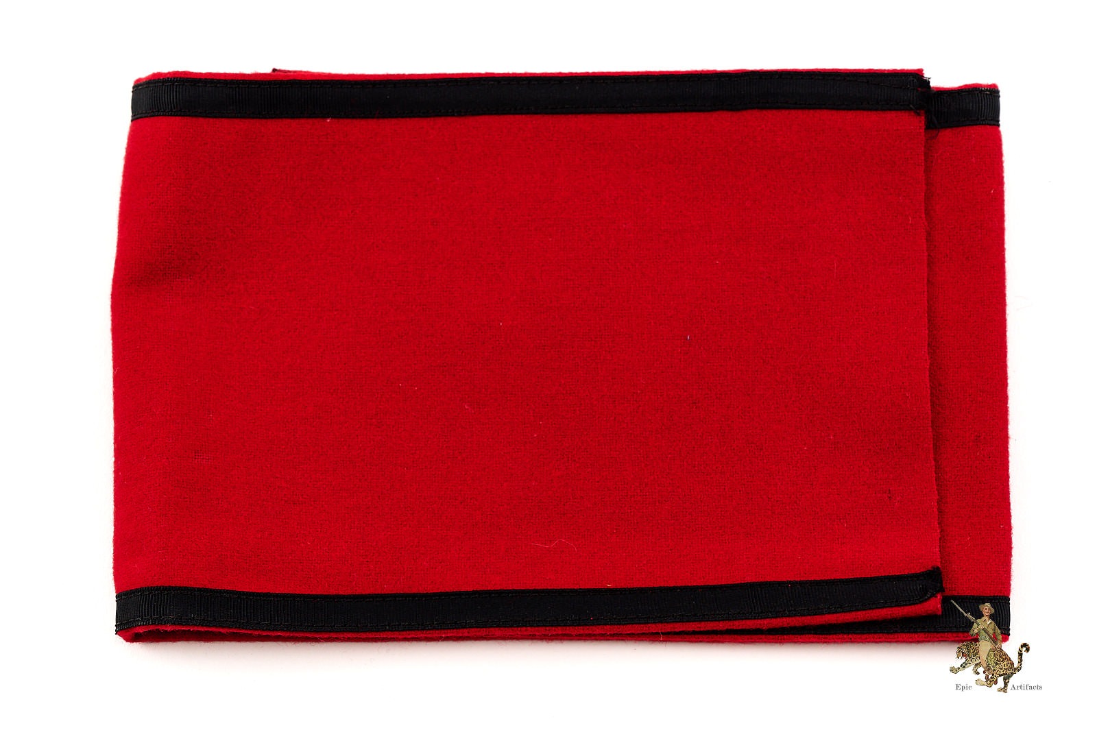 Product Description: This SS Wool Armband – RZM Tag is an exceptionally well-preserved and highly desirable example, complete with its original SS RZM (Reichszeugmeisterei) tag still affixed to the interior. Constructed of high-quality wool, the armband retains its vivid red coloration, with no fading or discoloration—evidence of long-term storage, likely in a wartime depot or warehouse. The design features a machine-applied white roundel with a swastika constructed from ribbed black tape, a method typical of SS-issued variants. Flanking the top and bottom edges is a black fabric tape with a distinctive horizontal weave, denoting issue for use by a member of the SS.
