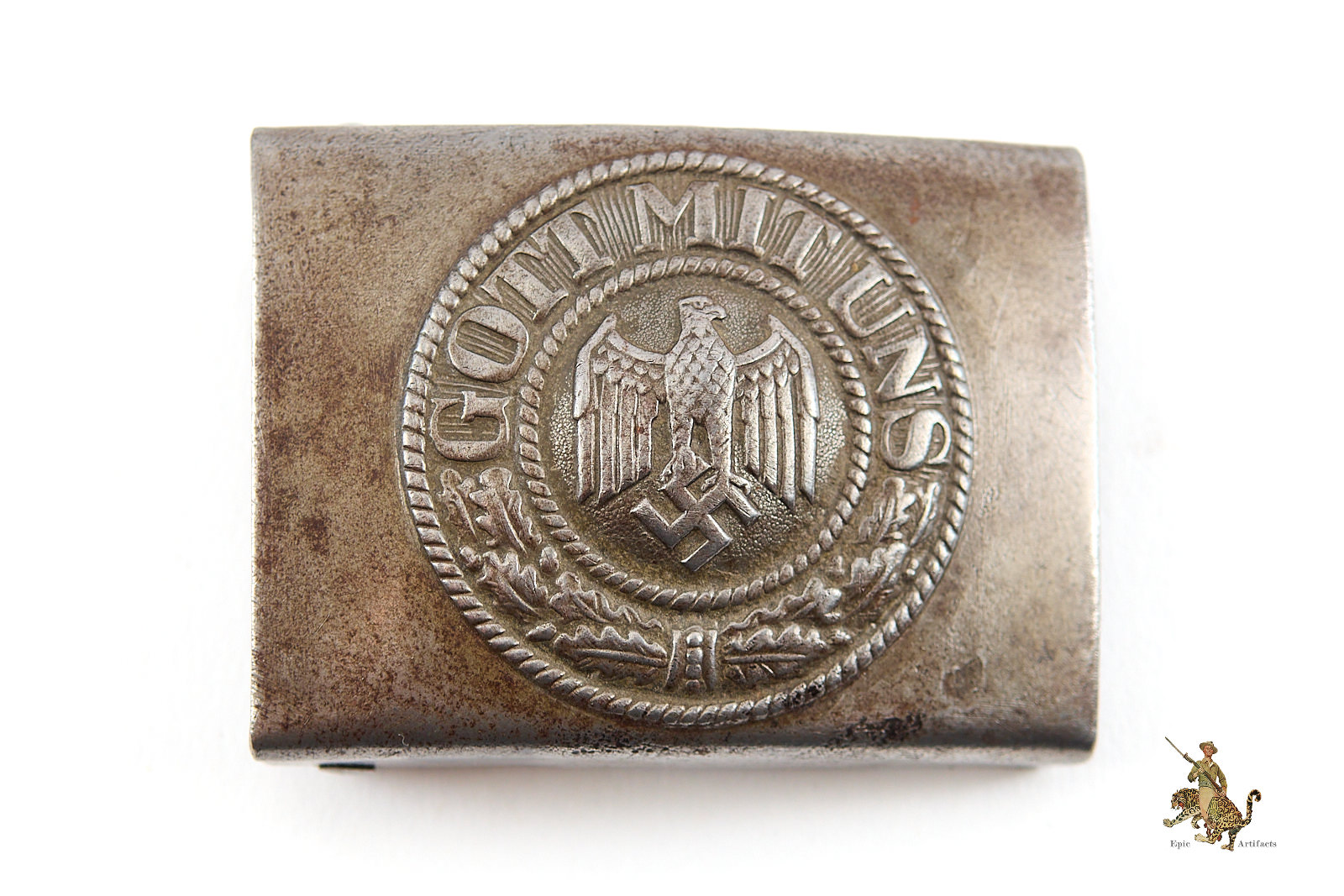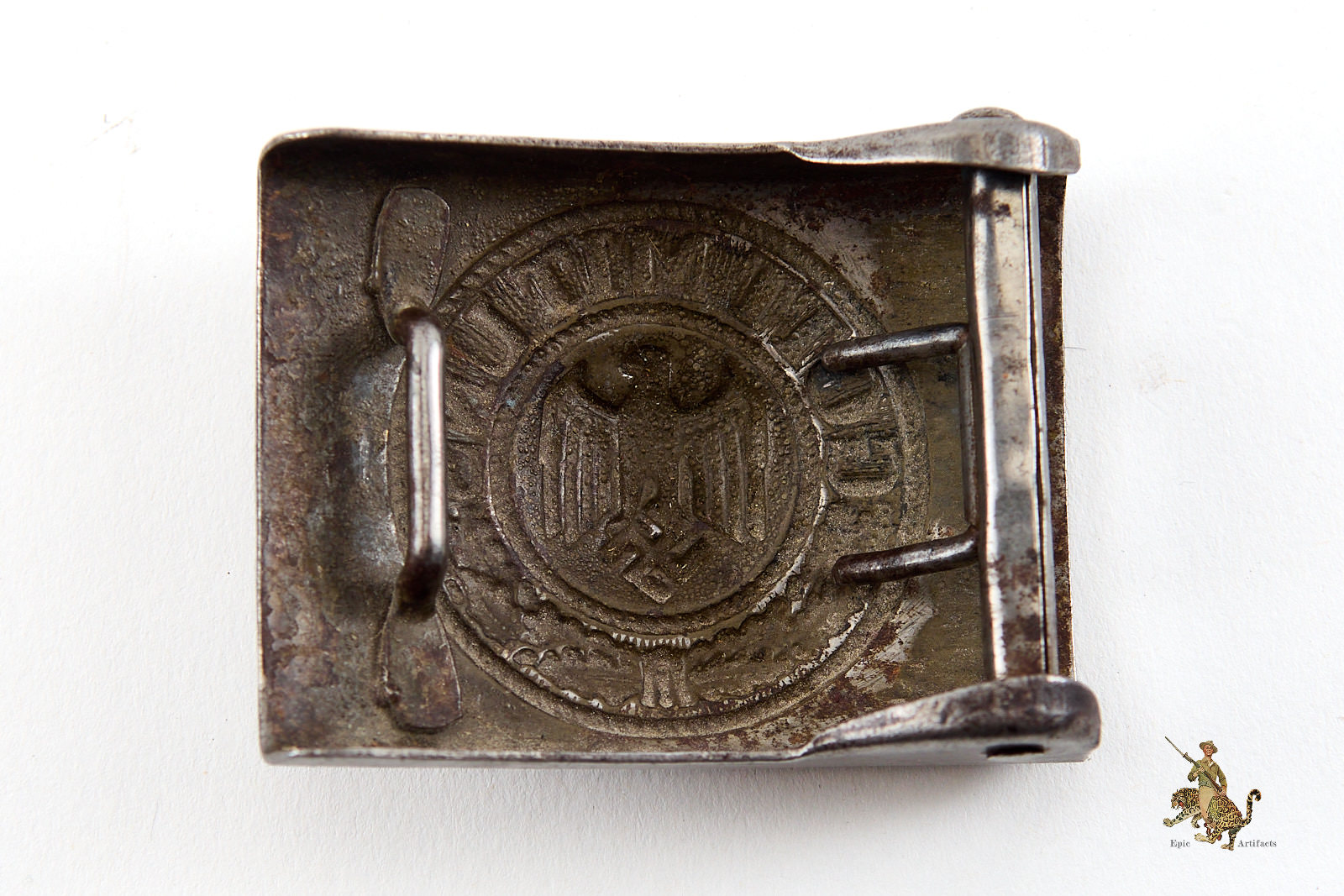 Product Description: This is a very nice Steel Heer EM Buckle. This was the standard pattern of wartime belt buckle worn by enlisted soldiers in the German Army. The front of this one has lost all of the factory applied paint, showing all of the base steel. Buckle shows a nice patina with wear to the eagle and swastika emblem high points. There are some scratches and marks from wear. On the reverse, nearly all of the original attractive paint is missing, but there are remnants in the recesses. This buckle is complete, with a textbook spot welded catch for the hook on the belt, and an intact and functional roller bar and prongs assembly. No maker marked on this buckle. This Steel Heer EM buckle is a nice display object, and rates in excellent condition.