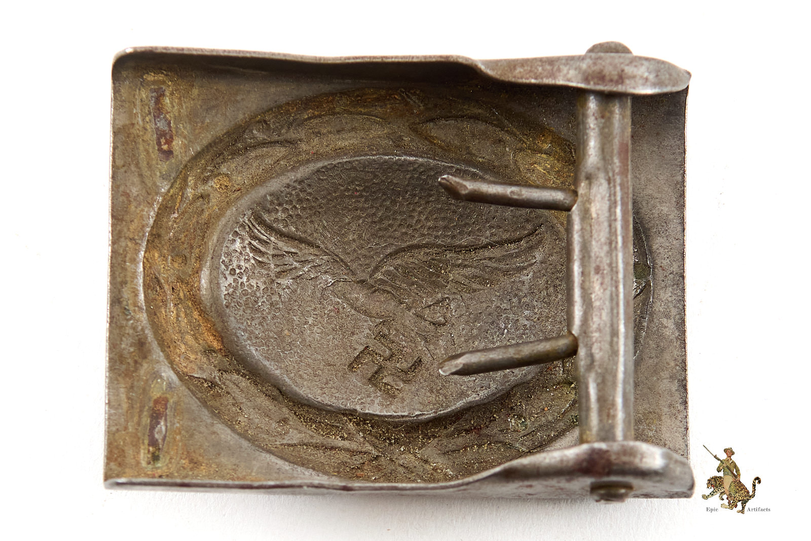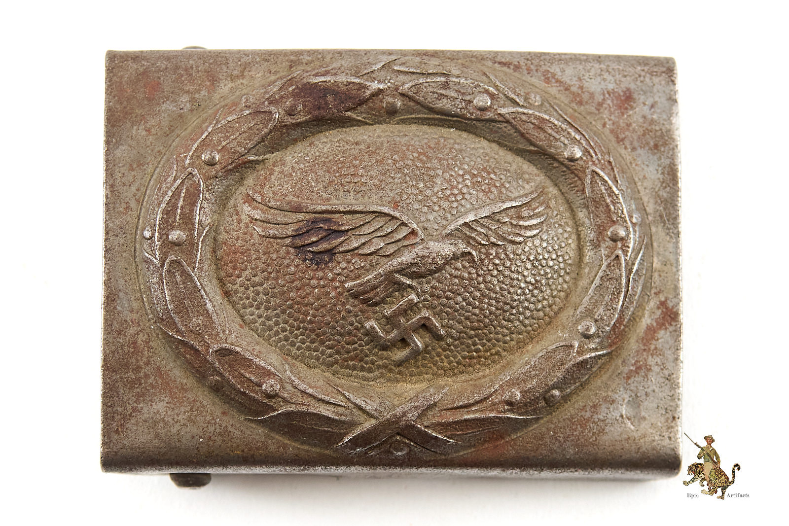 The obverse retains strong and well-defined detail to the Luftwaffe eagle and wreath motif, now absent its original painted finish and exhibiting light, even corrosion consistent with age and service. The reverse displays a uniform steel base with an attractive, undisturbed patina throughout. The roller bar and claw assembly remain securely affixed, while the catch for the belt hook is no longer present. No maker’s marks are visible.