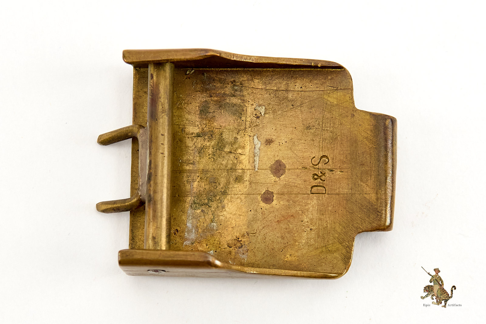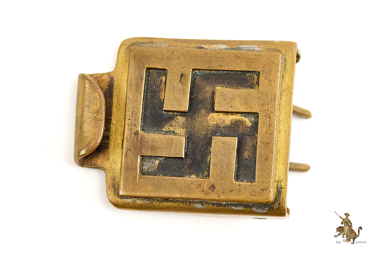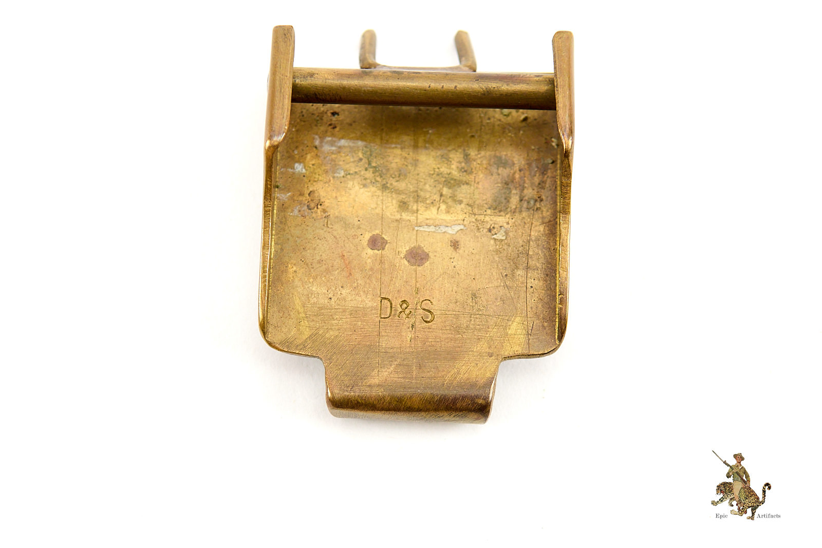 Product Description: A period Swastika Brass Buckle, marked D&S on the reverse, exhibiting an attractive, even patina across its surfaces. The buckle measures approximately 2 inches in width (including the hook) and 1¾ inches in height, with the post and roller bar—complete with functional prongs—remaining intact and smoothly mobile. Crafted in solid brass, the piece displays crisp detailing and the characteristic weight and finish associated with early- to mid-20th-century political regalia.