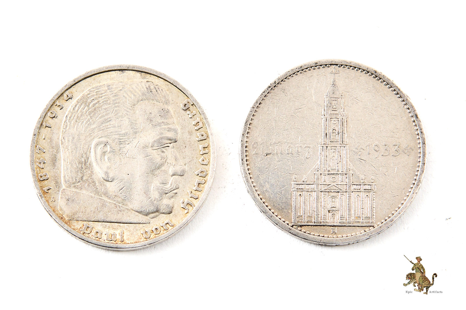 Historical Description: Silver Reichsmark coins played both a practical and symbolic role in Germany during the early years of the Second World War. Struck primarily in .900 silver, denominations such as the 2 and 5 Reichsmark continued a long tradition of high-quality German silver coinage and were issued in limited quantities between 1933 and 1939. Designs featured nationally significant imagery, including President Paul von Hindenburg and commemorative architecture such as the Potsdam Garrison Church, reinforcing themes of German heritage, continuity, and state authority at the outset of the Nazi era.