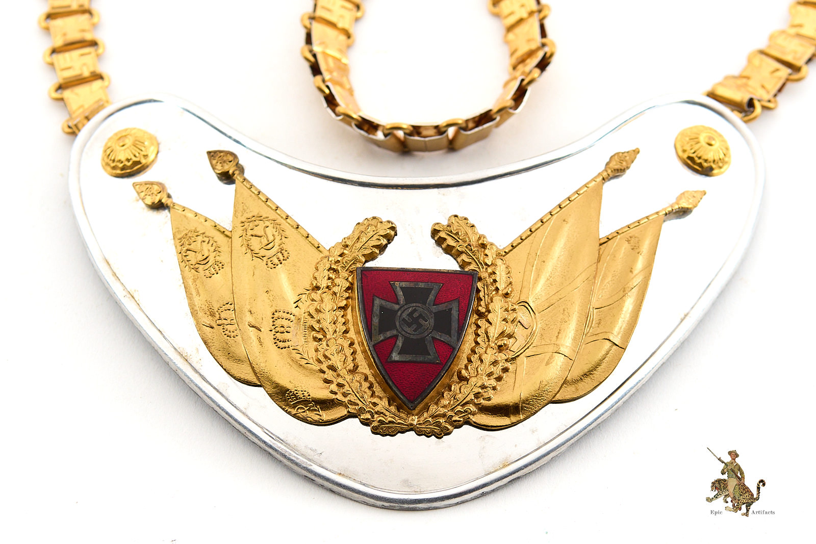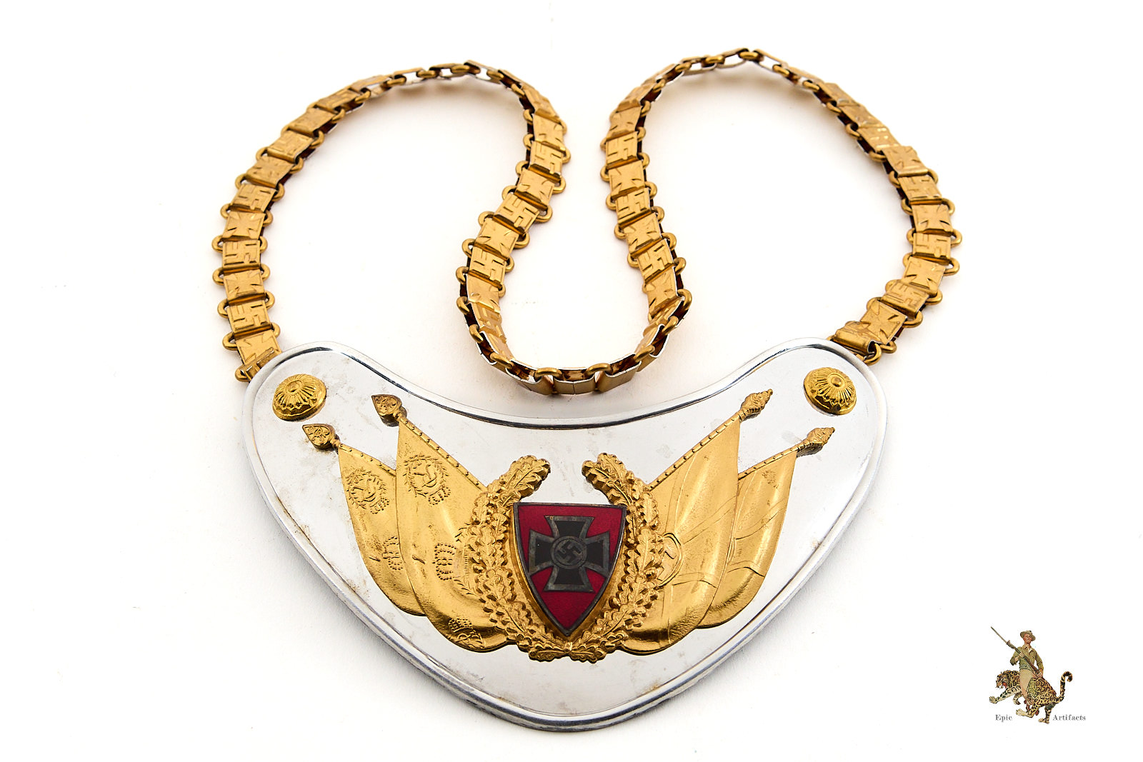 Historical Description: Gorgets were originally part of a knight’s armor during medieval times. Long after suits of armor were abandoned, the gorget continued to be used in many European armies as a form of military insignia. In the Imperial German Army until 1914, gorgets were worn as a special mark of distinction by certain elite units. Following WWI, German paramilitary and police organizations used gorgets for standard bearers, as insignia, and to denote personnel assigned special tasks. Following the Nazi rise to power, there was a vast increase in the number of uniformed organizations, and a variety of new gorgets were instituted for use by these civil, political and paramilitary organizations, as well as by the military. Standard bearers of most organizations, who were entrusted with carrying flags at rallies and in parades, wore gorgets. Other gorgets indicated assignment to guard or security forces. The military police personnel of the Wehrmacht and Waffen-SS had their own gorgets as a part of their uniforms and were nicknamed “chained dogs” by the troops, due to the chain used to suspend the gorget around the wearer’s neck. Because gorgets were never general issue to all personnel of any organization or military branch, they were manufactured in limited numbers, and are generally scarce to encounter today.