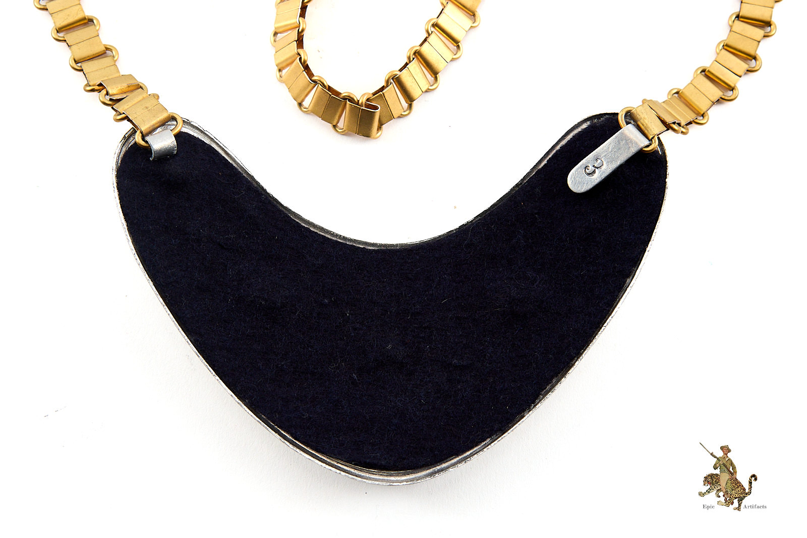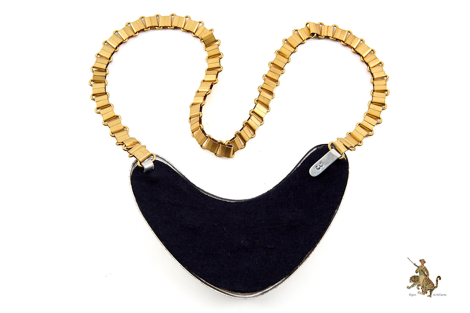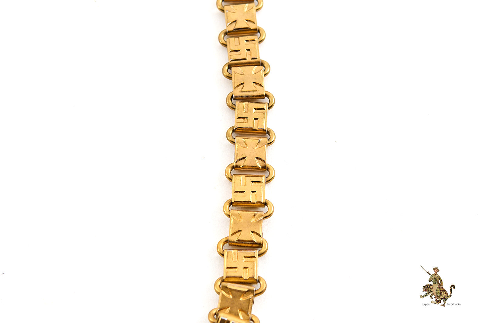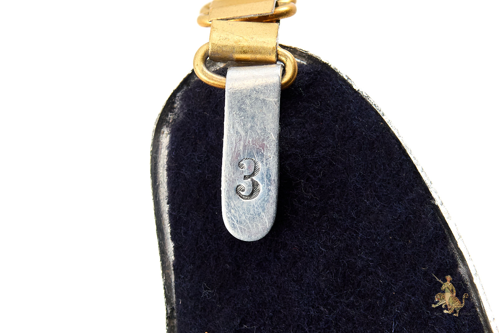 The gorget is complete with its original, full-length chain, which alternates Iron Cross and swastika links and displays only minor wear. The reverse retains its original black wool backing, free from moth damage. The chain is secured by two sheet-metal clips, one neatly stamped with the number “3,” likely a manufacturer’s code.