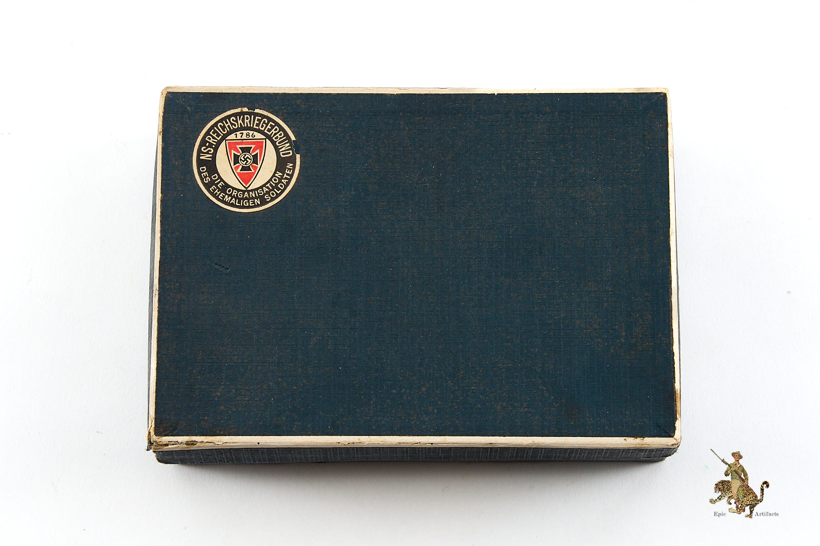 Product Description: This Type II Veterans Gorget in Box is an impressive piece of Nazi-era regalia, intended for wear by a flag bearer in a veterans’ association. The silver-colored front plate remains exceptionally clean, retaining full original luster. It is fitted with a brass central device depicting detailed Imperial military standards alongside Third Reich veterans’ flags. At the center is a separately applied enameled emblem featuring a swastika within an Iron Cross, the symbol of the veterans’ organization. The black and translucent red enamel is fully intact and shows no damage.