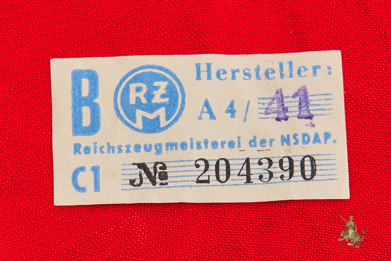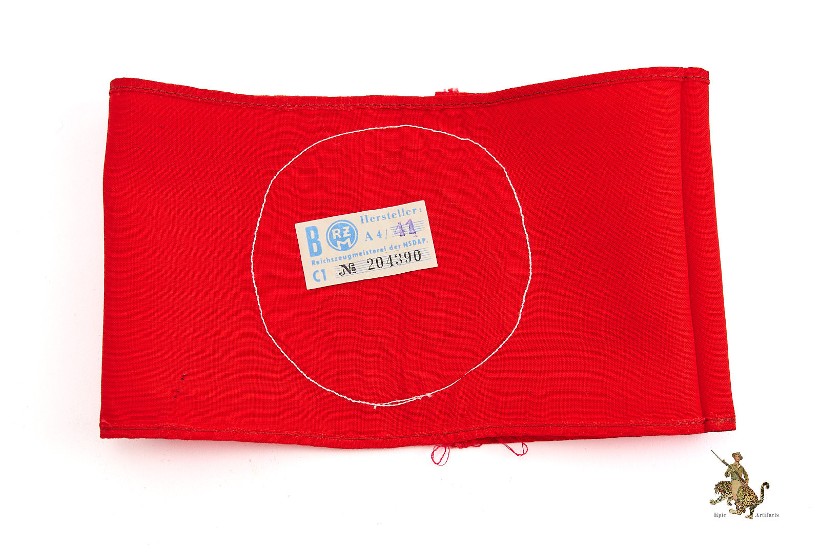 Product Description: An original Three-Piece NSDAP Armband with intact RZM tag, offered here as a textbook example of period craftsmanship, exhibiting clear evidence of wear and exceptional visual character. Constructed from high-quality red polished cotton, the armband features a separately applied white polished cotton roundel with a precisely executed black polished cotton swastika, all neatly machine-stitched to the body. Both upper and lower edges are cleanly finished, with ends joined by machine stitching consistent with period production. The interior retains its original paper RZM tag, marked A4/41, confirming its authenticity.