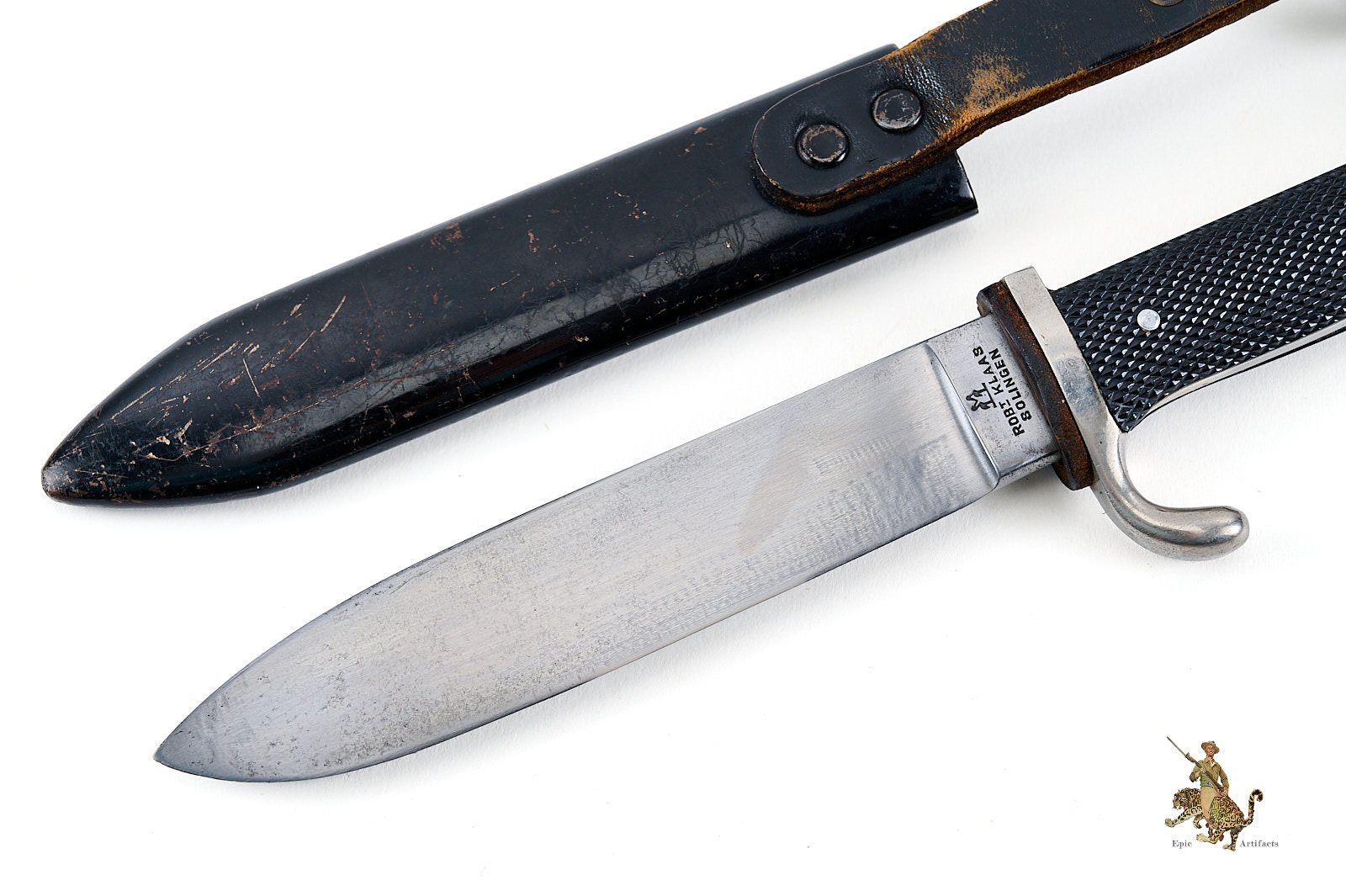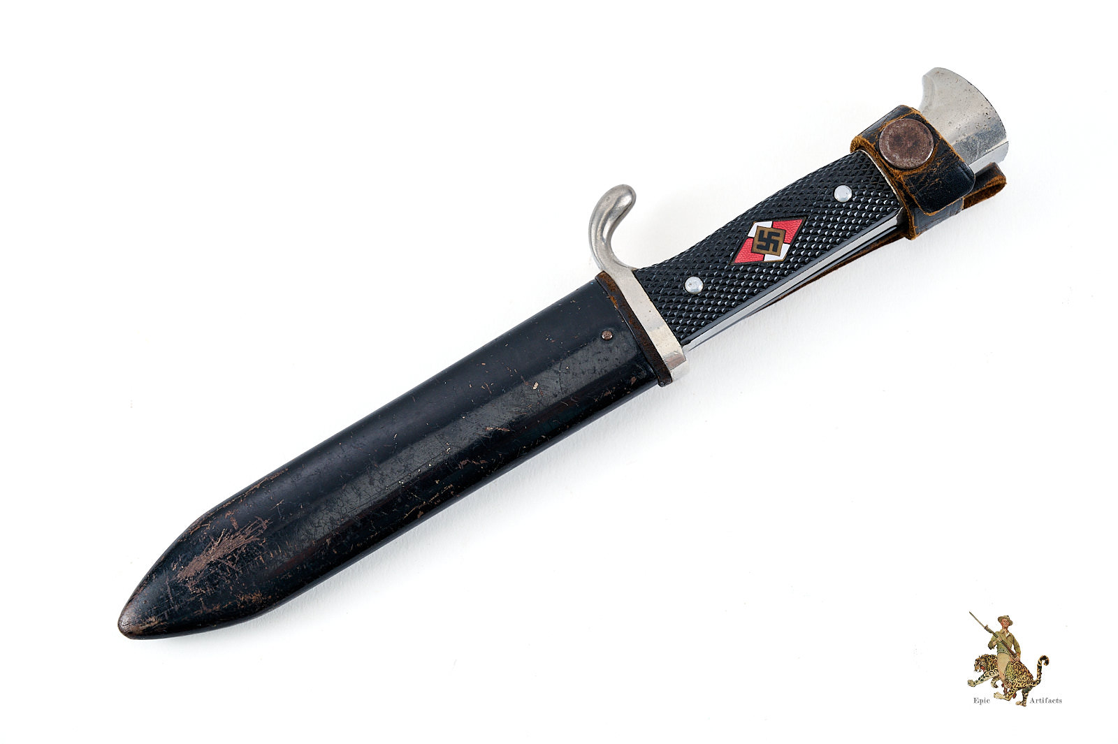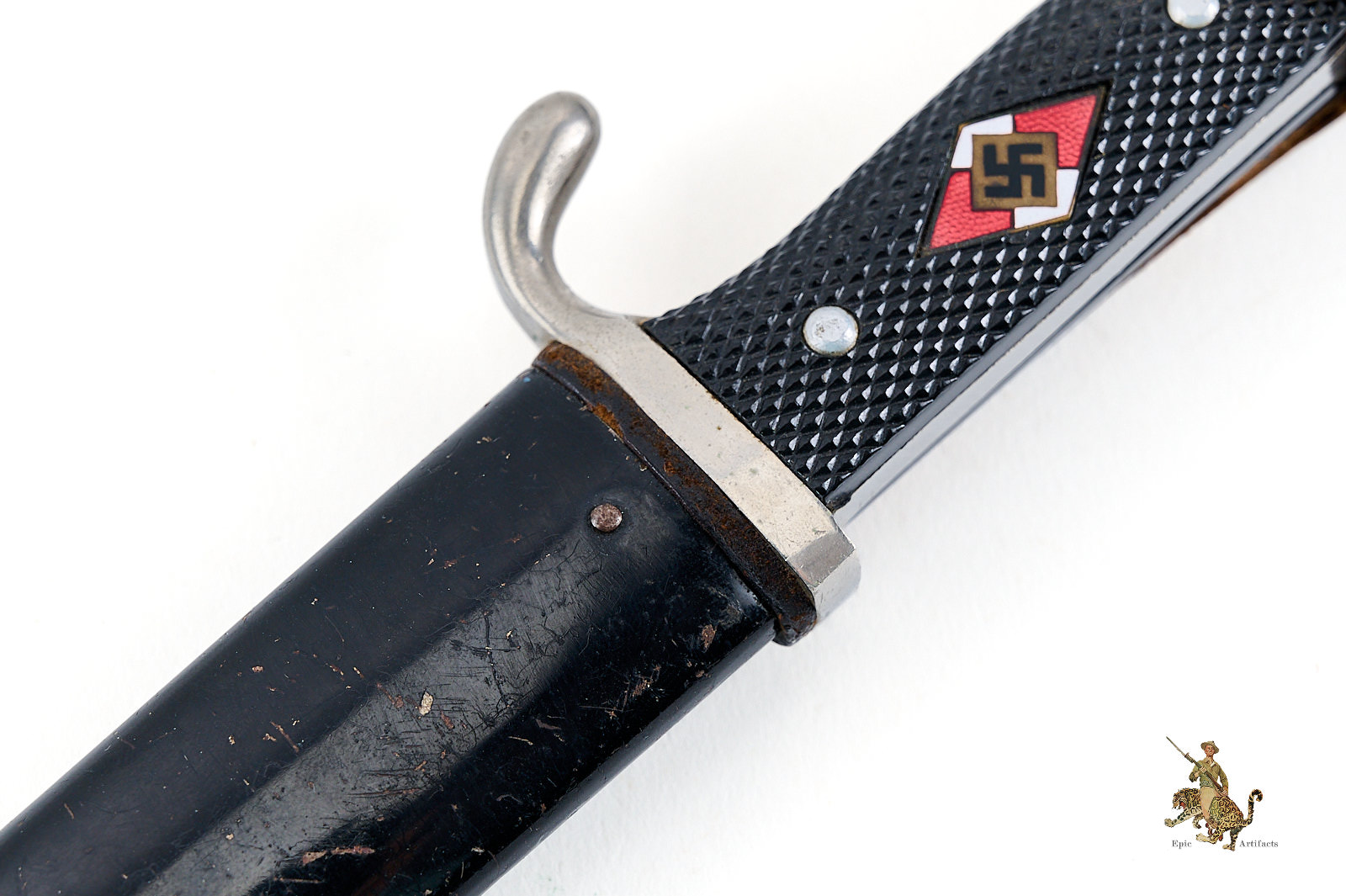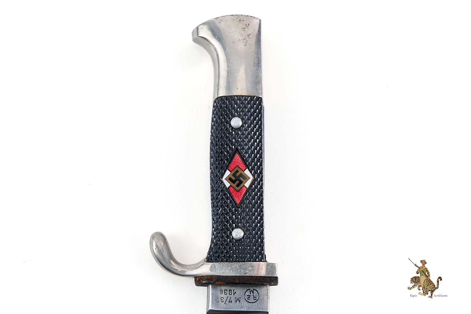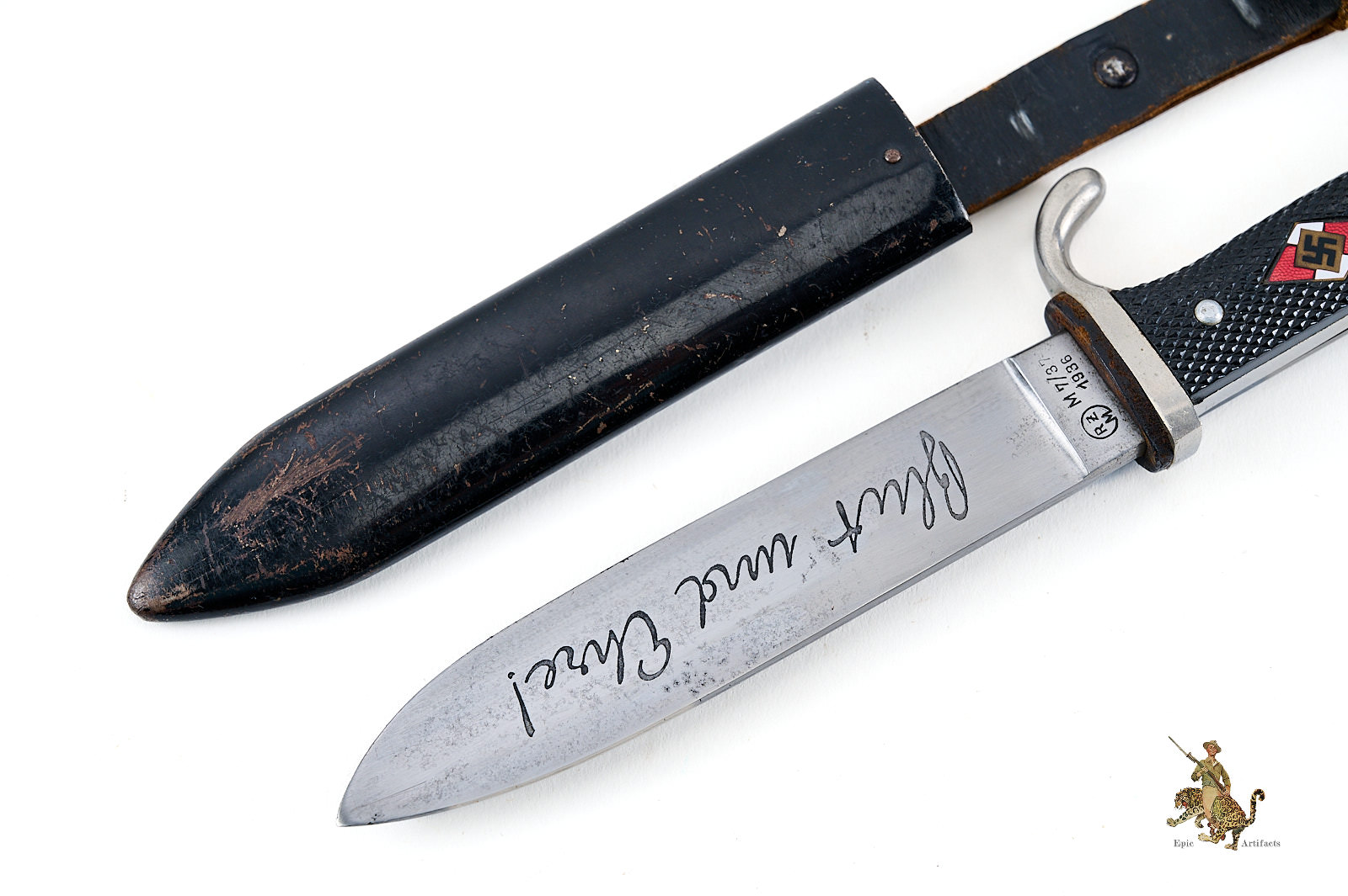 Historical Description: The Hitler Youth Knife (Hitlerjugend Fahrtenmesser) was introduced in the summer of 1933, shortly after the Nazi seizure of power in Germany. It was produced by a multitude of manufacturers and could be purchased from authorized shops for a price of 4 Reichsmarks. It was used not only as a dress sidearm, but as a functional camping tool, and these were commonly sharpened by their original owners. The earliest examples bore the motto of the Hitler Youth, “Blut und Ehre!” (Blood and Honor), etched on the blade. The blades on these early knives were marked with commercial manufacturer logos. They had nickel silver handles, and anodized metal scabbards. The use of the etched motto was discontinued in August 1938. Later HJ knives had nickel plated steel handles, painted scabbards, and the maker logos were replaced with an RZM code along with the year of manufacture. There are also transitional types that still have the etched motto but have dates on the blade ricasso. Manufacture of these knives is believed to have ceased around 1942. All HJ knives have the diamond emblem of the Hitler Youth on the handle.