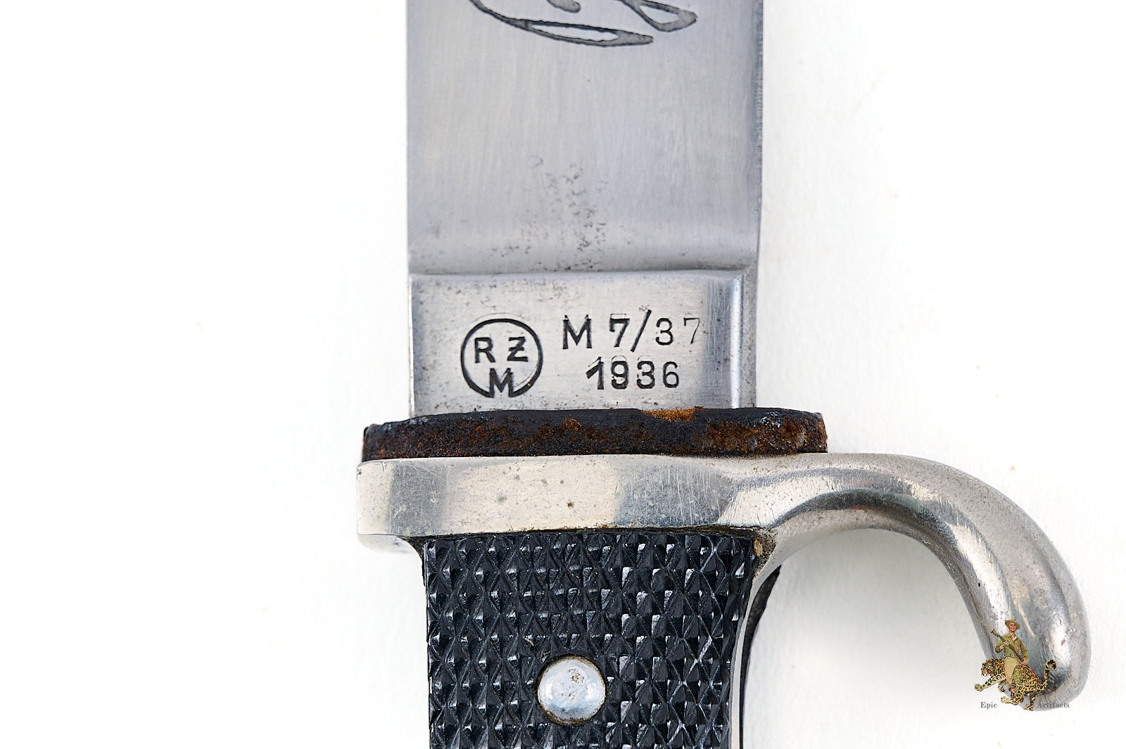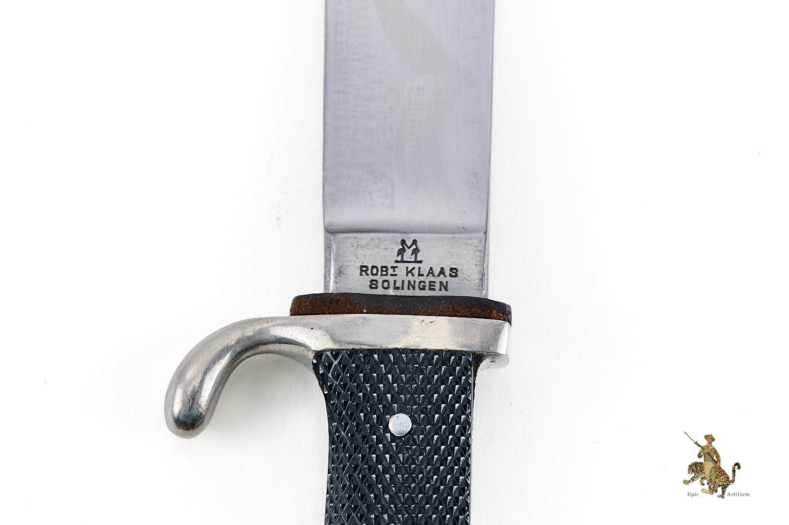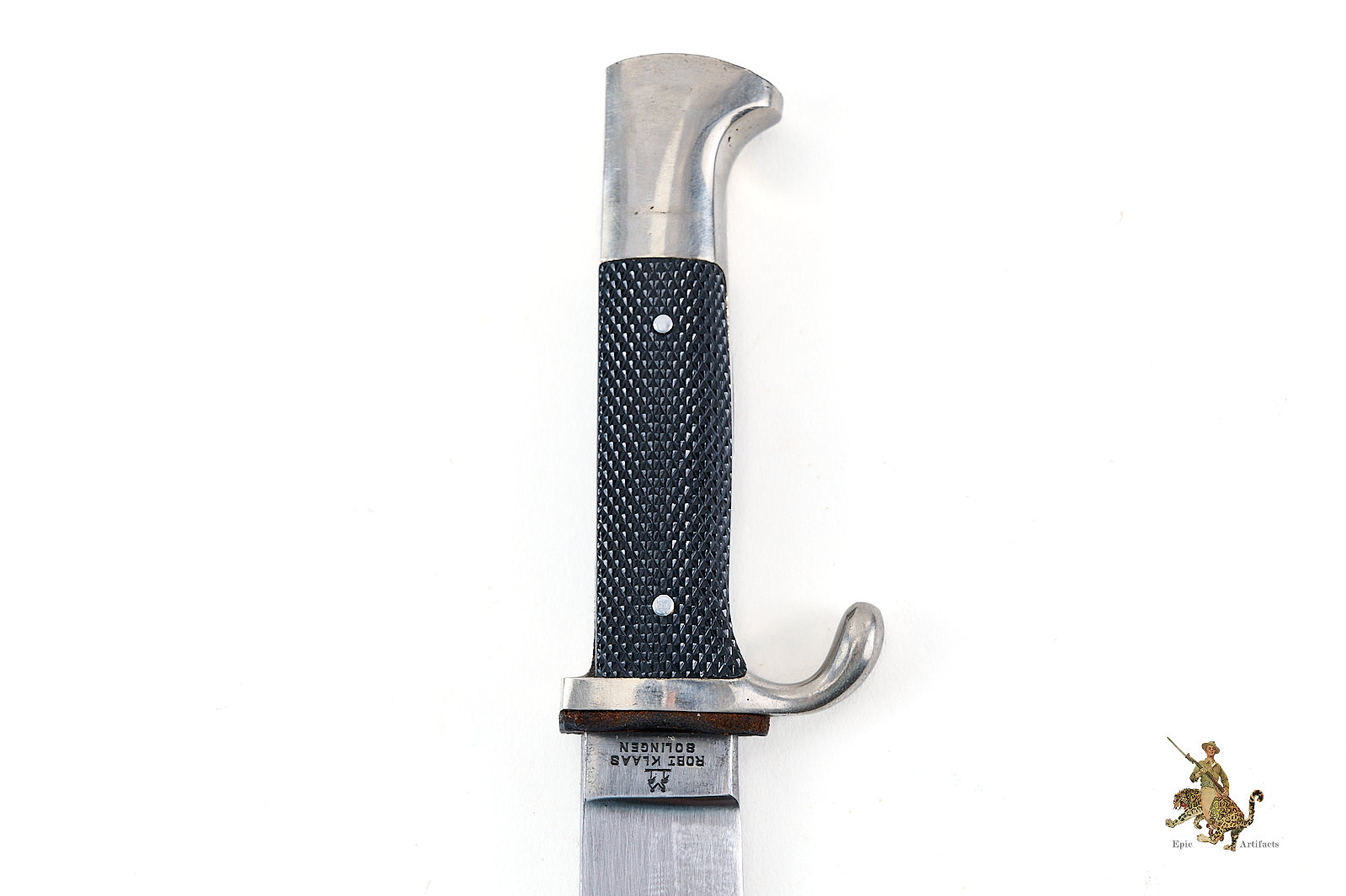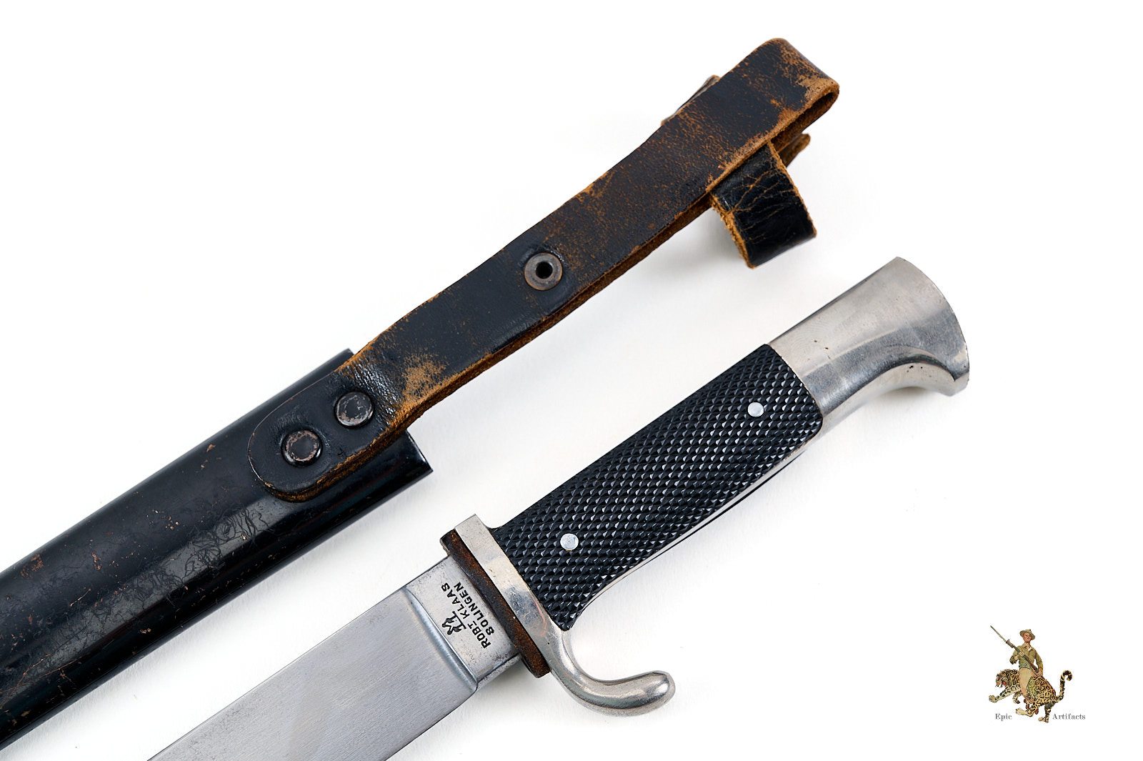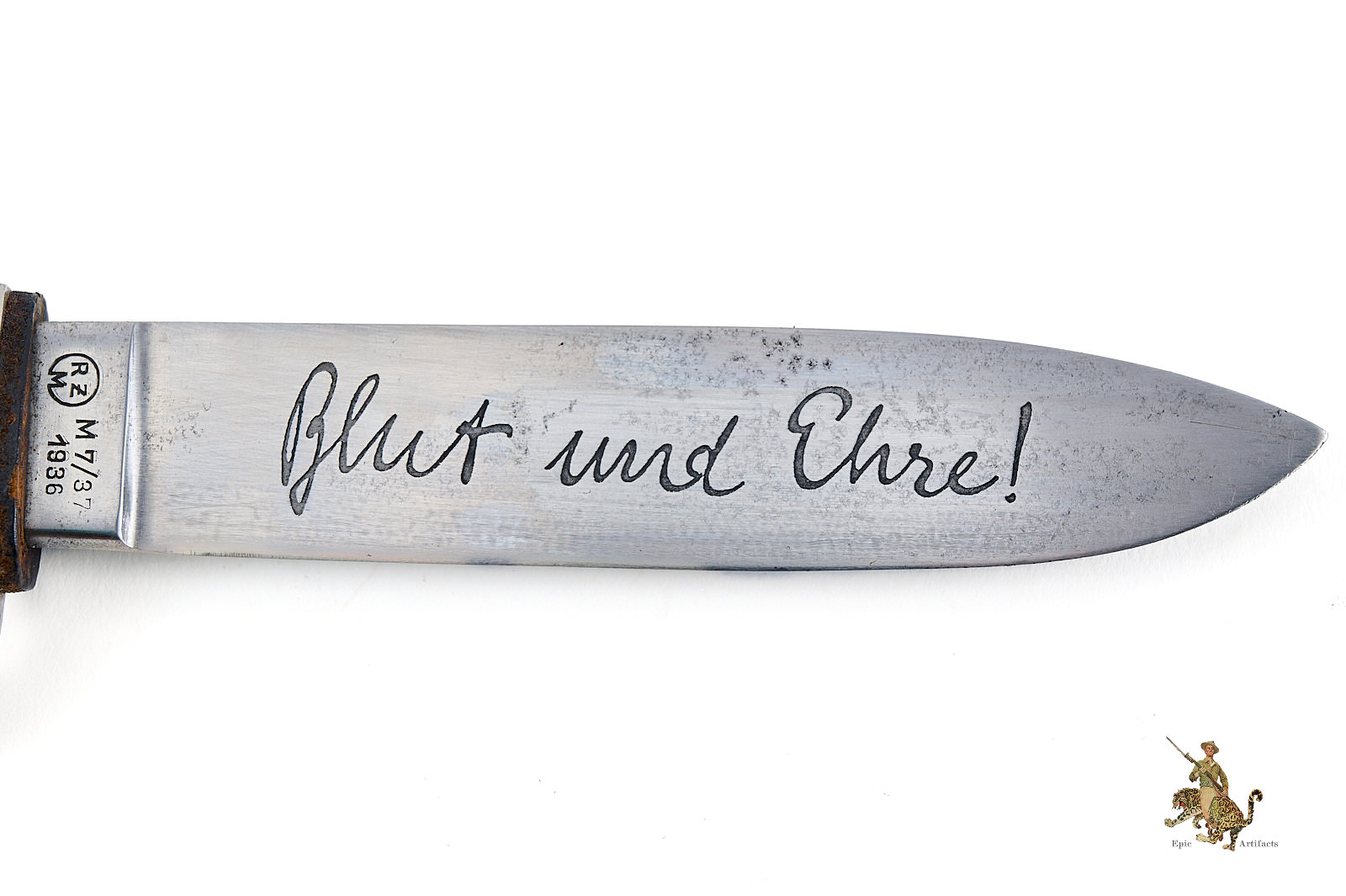 Historical Description: The Hitler Youth Knife (Hitlerjugend Fahrtenmesser) was introduced in the summer of 1933, shortly after the Nazi seizure of power in Germany. It was produced by a multitude of manufacturers and could be purchased from authorized shops for a price of 4 Reichsmarks. It was used not only as a dress sidearm, but as a functional camping tool, and these were commonly sharpened by their original owners. The earliest examples bore the motto of the Hitler Youth, “Blut und Ehre!” (Blood and Honor), etched on the blade. The blades on these early knives were marked with commercial manufacturer logos. They had nickel silver handles, and anodized metal scabbards. The use of the etched motto was discontinued in August 1938. Later HJ knives had nickel plated steel handles, painted scabbards, and the maker logos were replaced with an RZM code along with the year of manufacture. There are also transitional types that still have the etched motto but have dates on the blade ricasso. Manufacture of these knives is believed to have ceased around 1942. All HJ knives have the diamond emblem of the Hitler Youth on the handle.