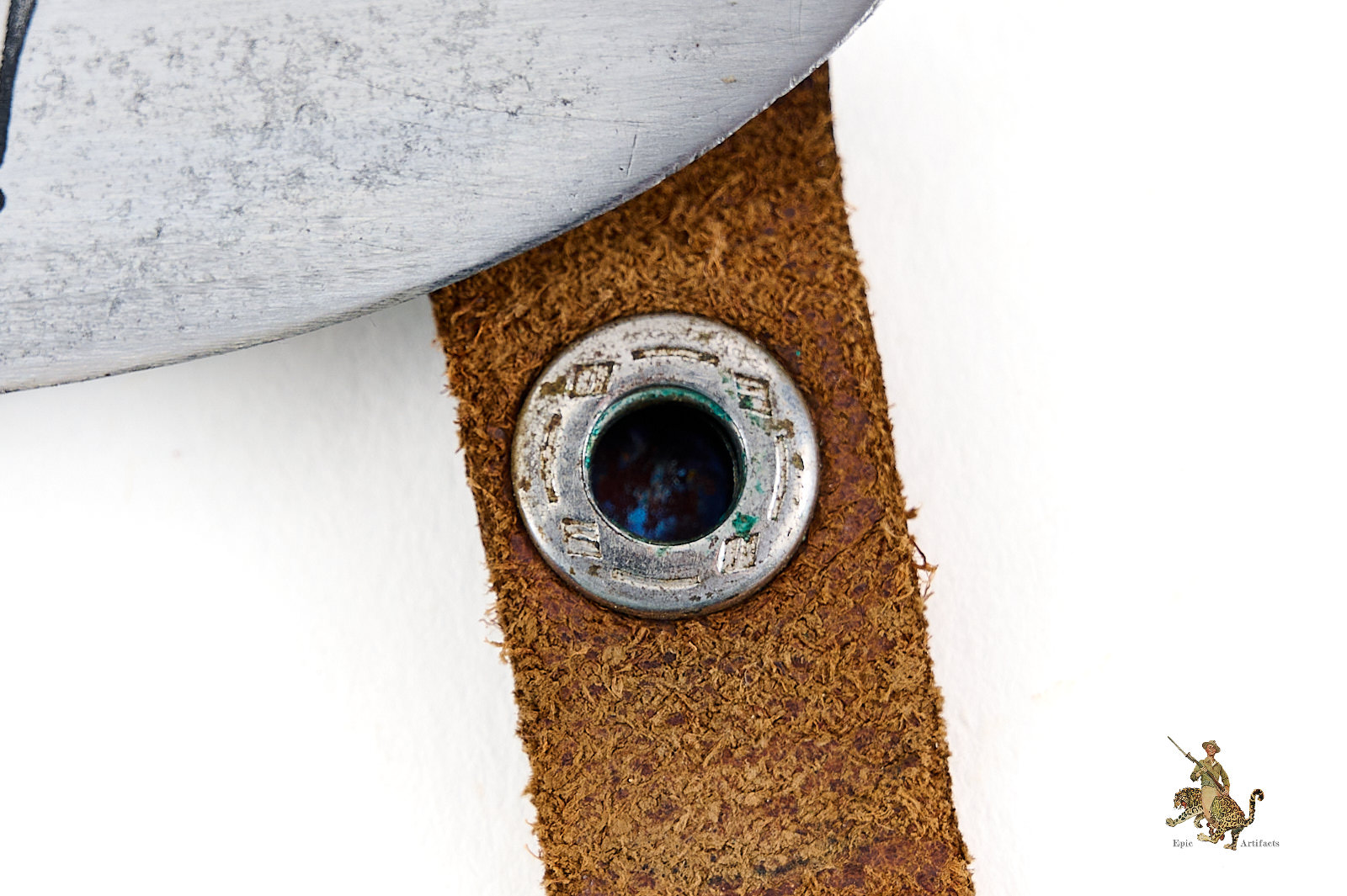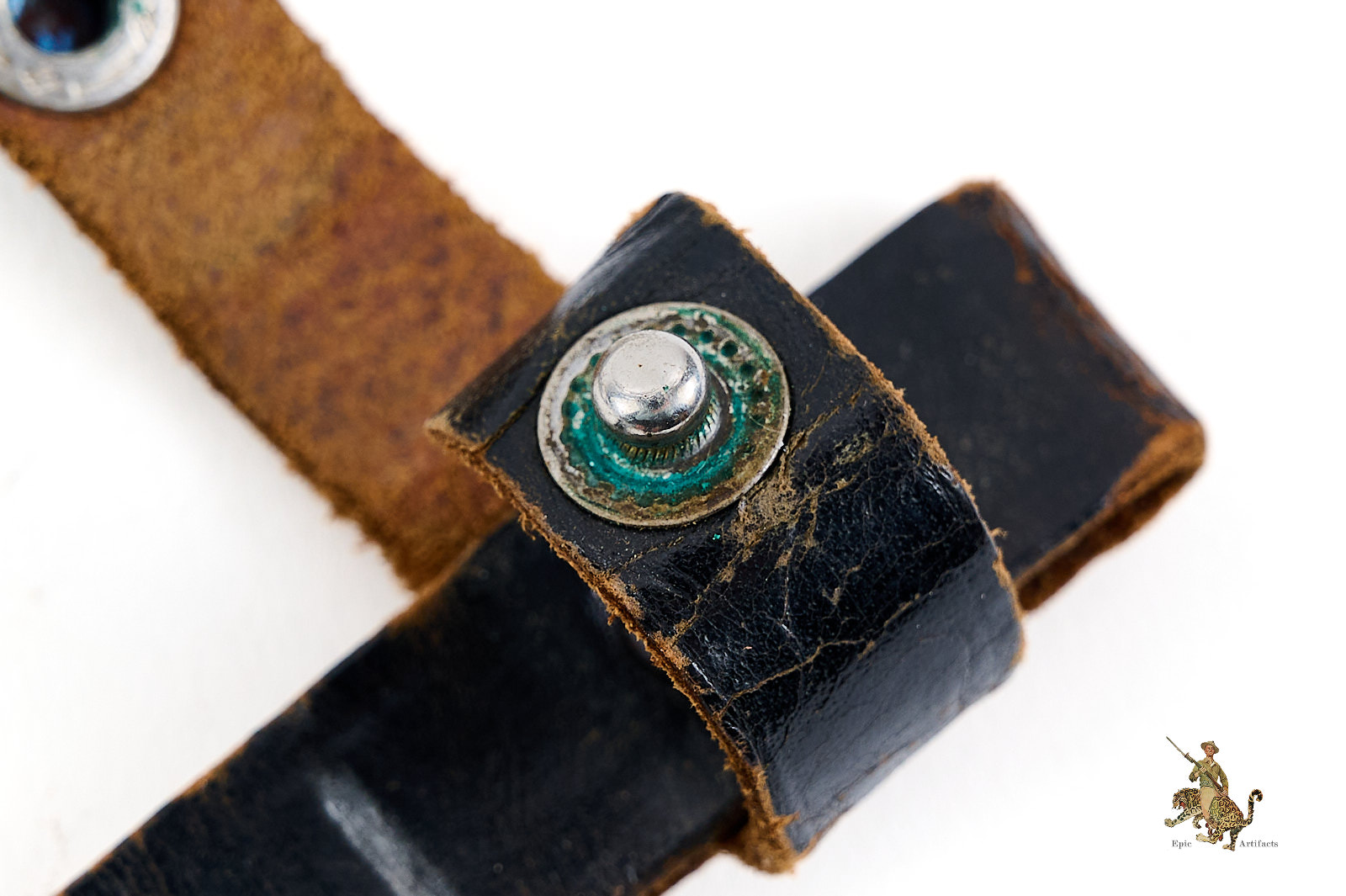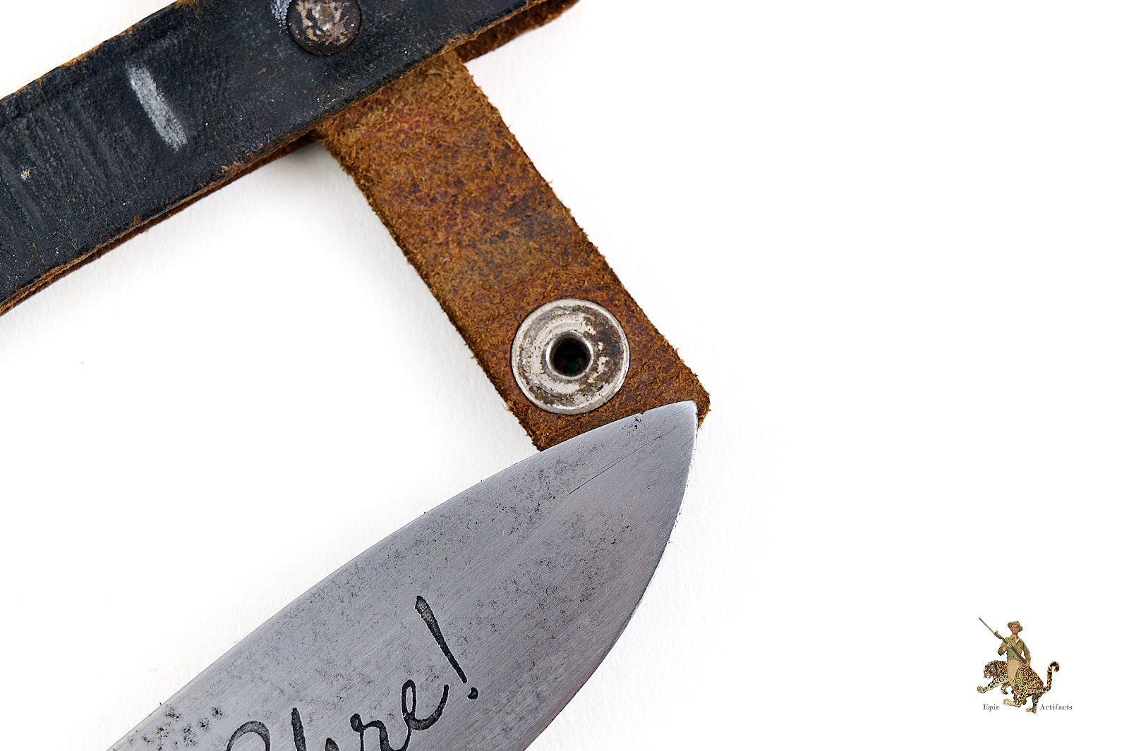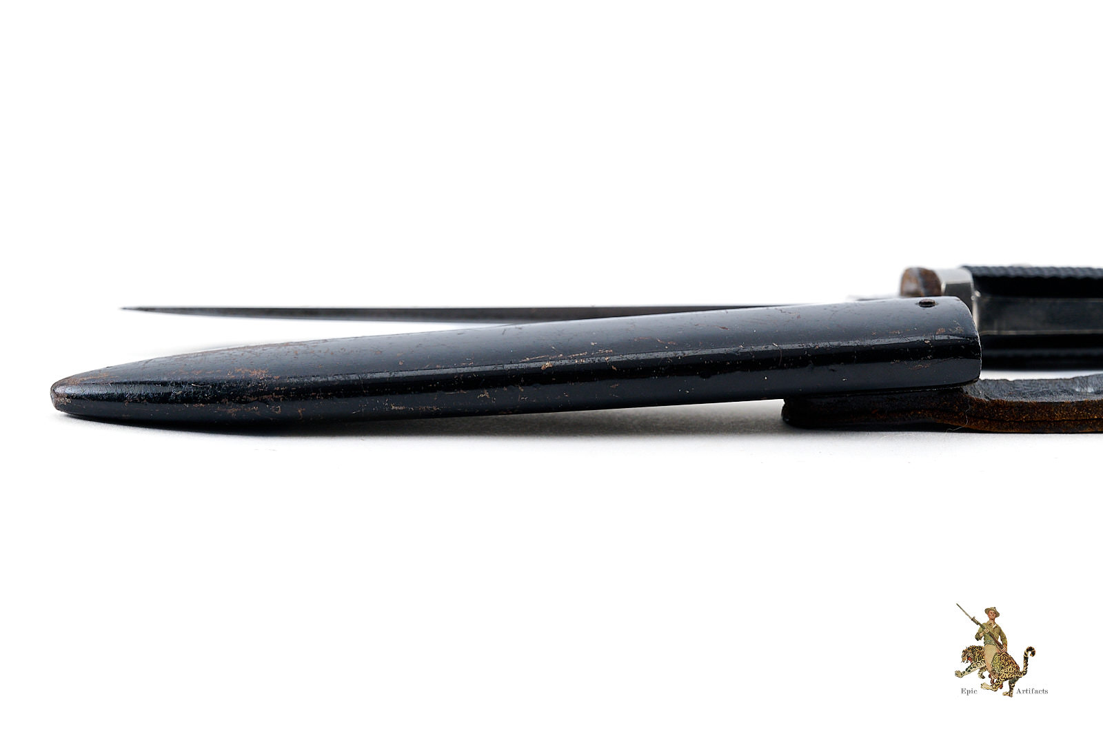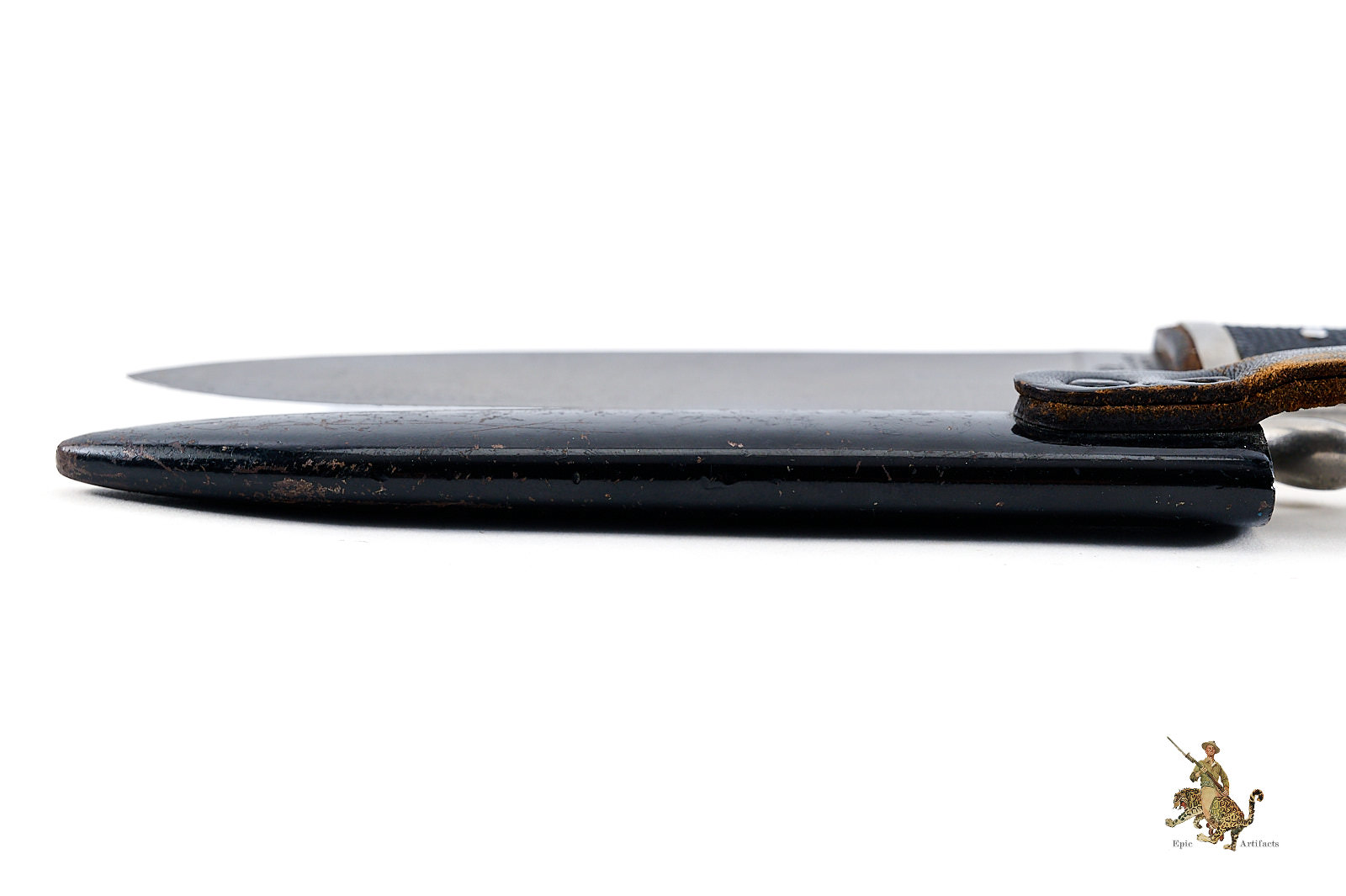 The accompanying scabbard is original and correctly matched, retaining its painted surface with minor scratching and areas of expected age-related loss. The leather belt loop remains complete, supple, and functional, including a secure retaining strap with working snap closure.