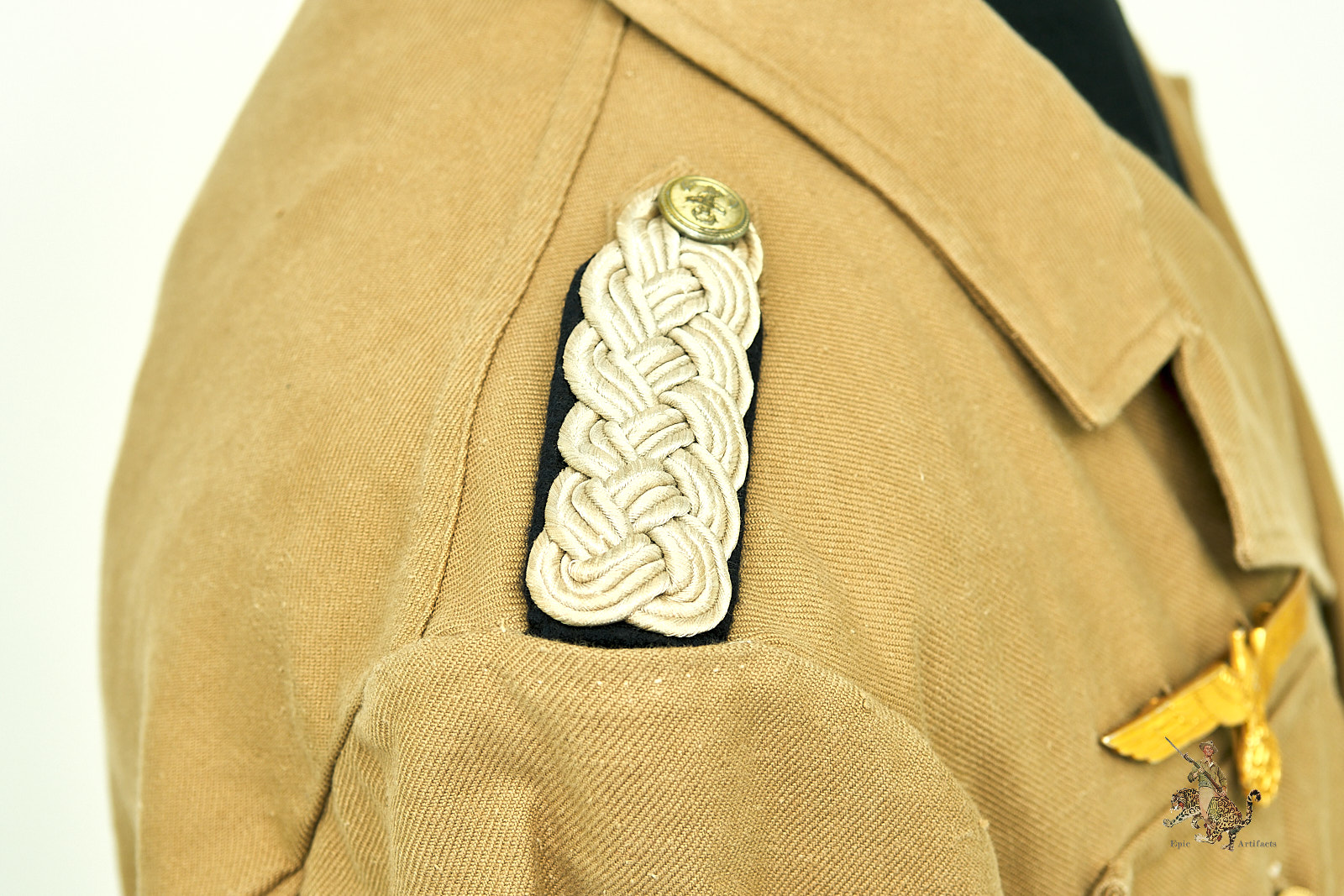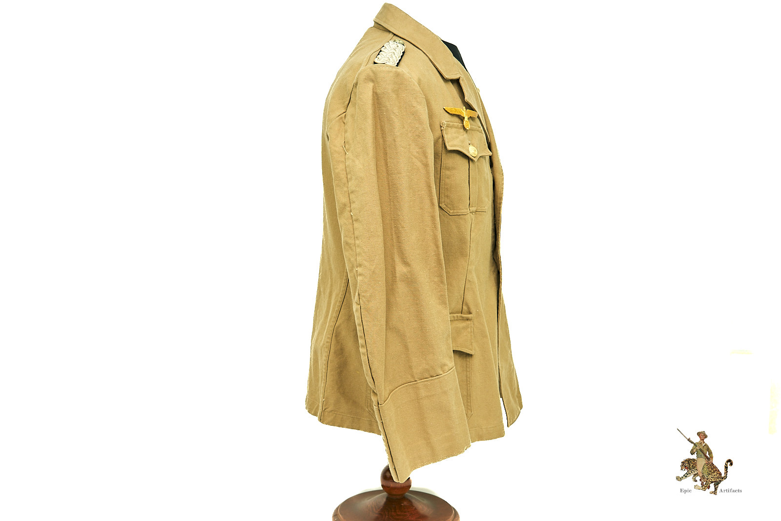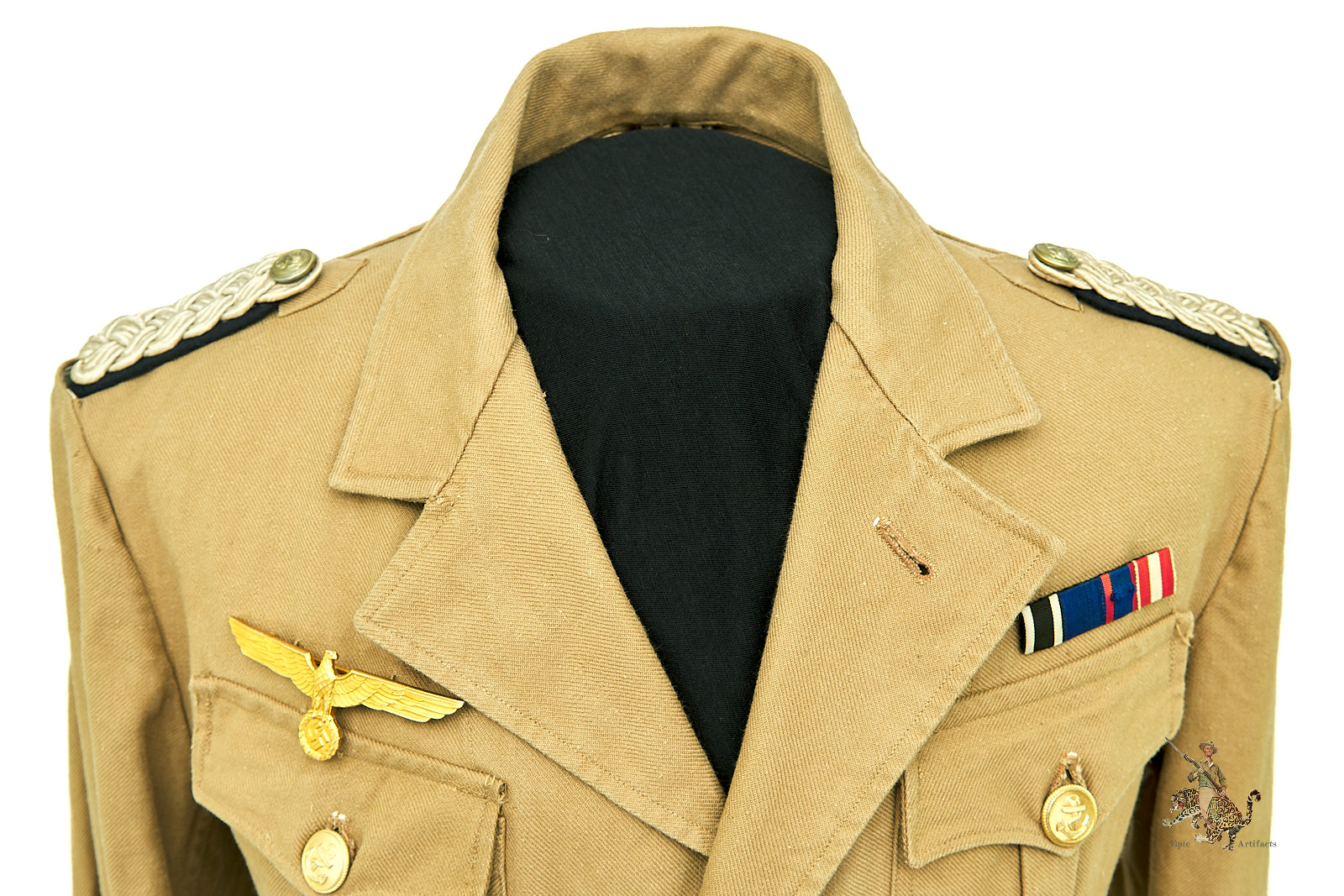 Product Description:  A highly attractive and well-preserved example of a Tropical Kriegsmarine Officer Tunic, presented in excellent ++ condition and exhibiting strong overall display appeal. The tunic retains its aluminum tropical eagle affixed to the right side, which remains in excellent condition, showing only minor scratches to the gold finish on the reverse.