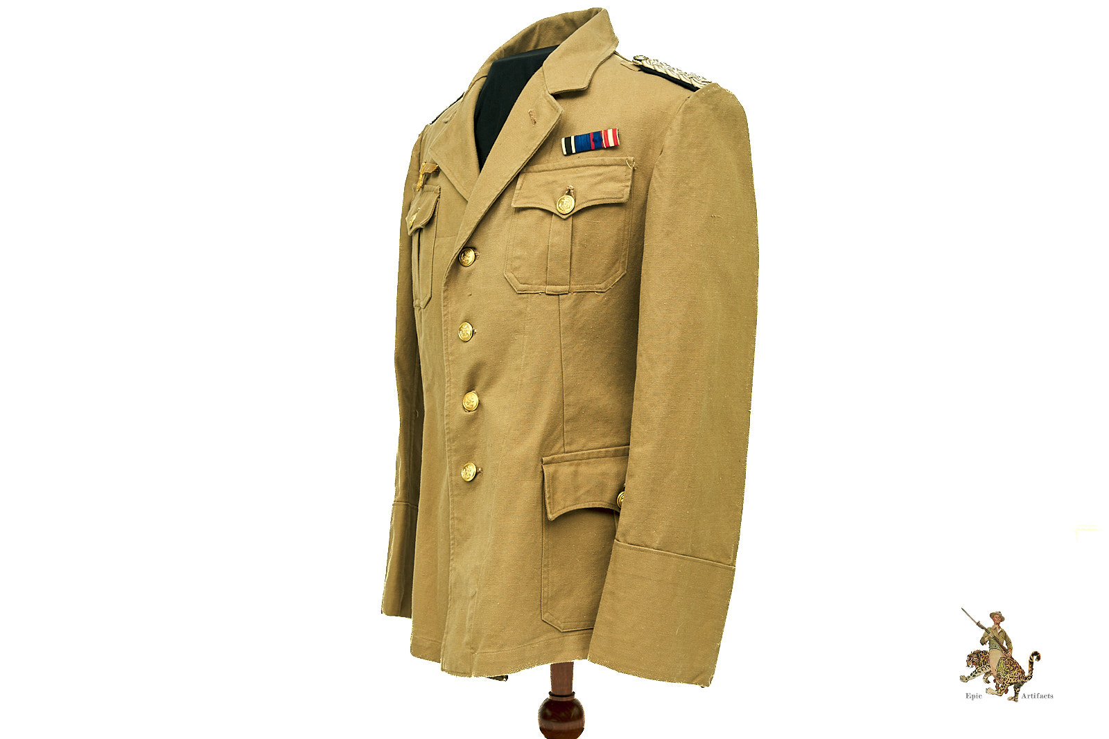The left breast bears a four-place ribbon bar, displaying light wear where an additional device was once mounted, consistent with period use. The tunic is fitted with slide-in shoulder boards, as shown, further enhancing its completeness and authenticity.