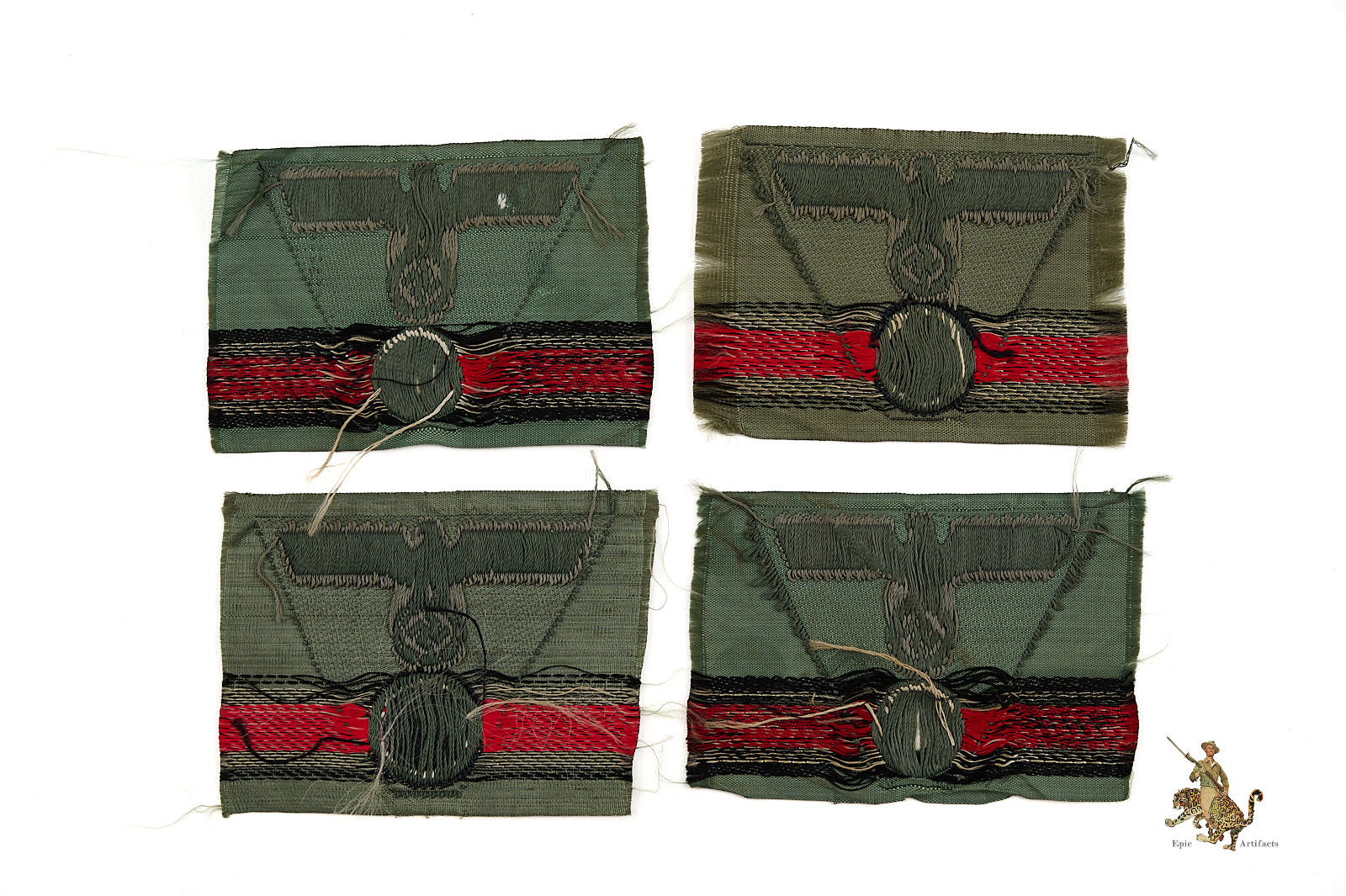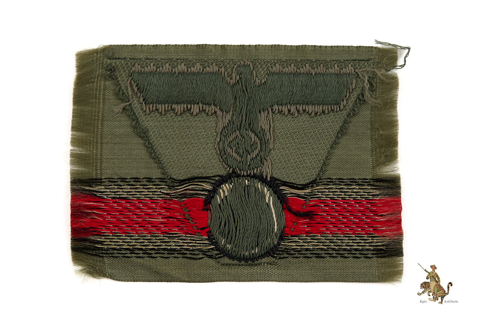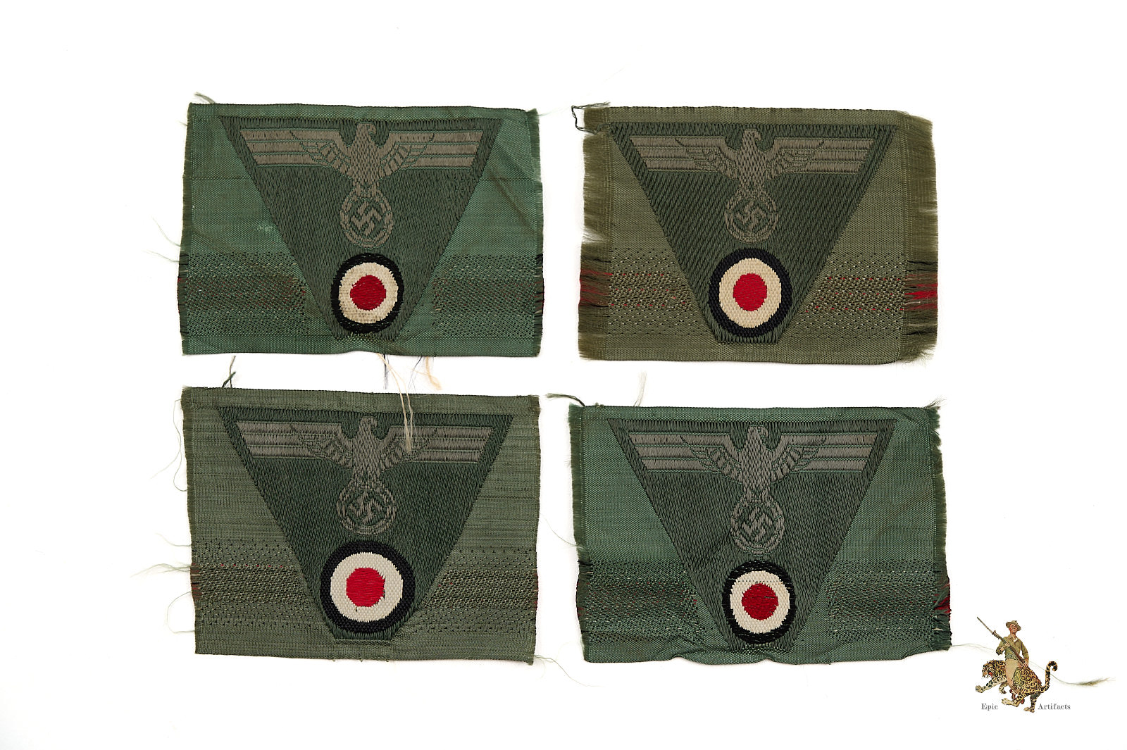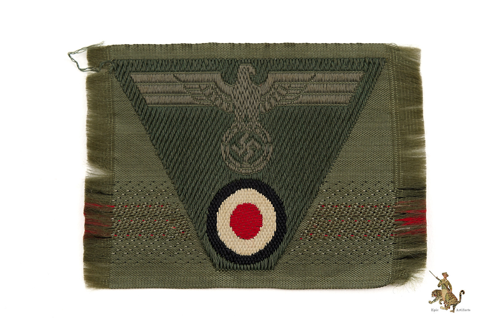 Historical Description: The German Armed Forces (Wehrmacht), as formed in 1935, and as they existed until the end of World War 2, consisted of the Army (Heer), the Air Force (Luftwaffe) and the Navy (Kriegsmarine). The Waffen-SS fell under the command of the Wehrmacht during the war. Each of these branches of service had a unique eagle design that was worn on both the formal dress and parade uniforms, and the field uniforms, of the members of that branch. These eagles were worn on soft headgear, including service and field caps, as well as on the uniform jacket. In the Heer, the Luftwaffe, and the Kriegsmarine, this eagle was worn on the chest of the tunic; collectors have termed these “breast eagles.” The Heer and the Luftwaffe generally used the same eagle style, though variations in color of the eagle or the backing distinguish between the two. The Luftwaffe used their own flying eagle emblem. The Waffen-SS sleeve eagle (and cap eagle) had wings that came to a distinctive tapered point. The cap, breast and sleeve eagles used by the various military branches were manufactured in many variations. There were machine-woven and machine embroidered versions, usually used by officers and NCOs. Hand-embroidered bullion wire eagles were typically for officers. There were metal eagles, for caps, or for uniforms that were intended to have detachable insignia. There were even eagles embroidered on camouflage fabric, intended for use on special field uniforms. There were also eagles in specific colors for use on tropical uniforms. Some of these eagles were mass-produced and are still common today. Others were, and are, very rare.