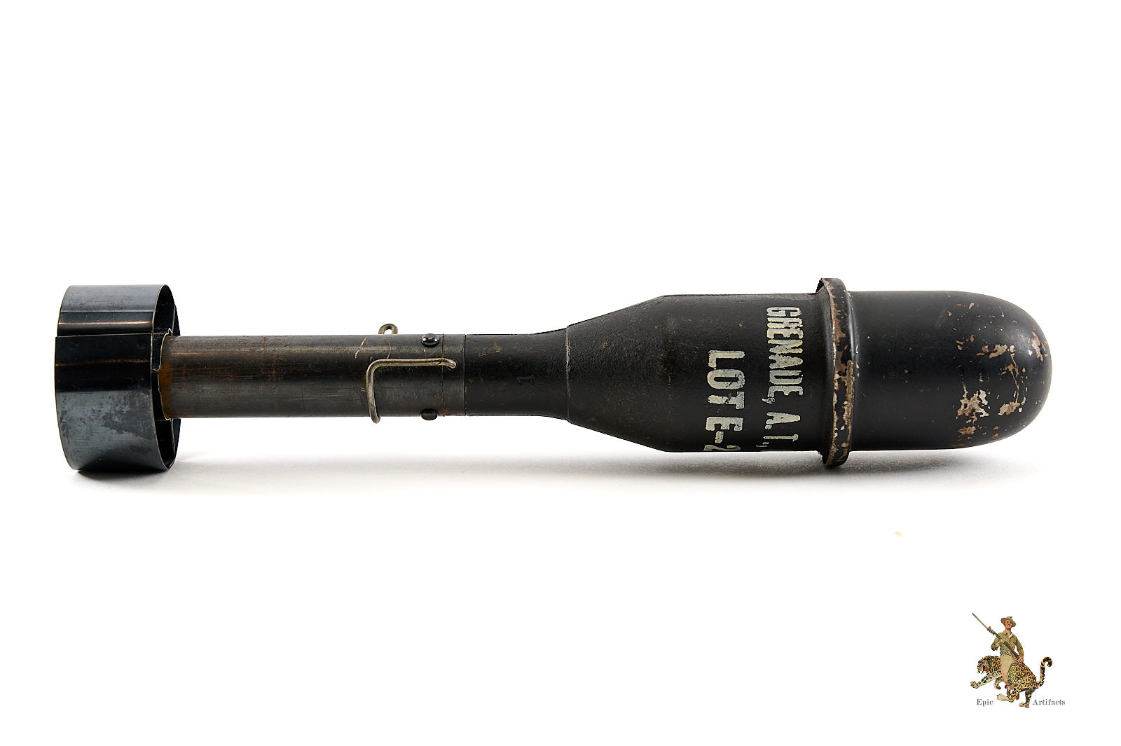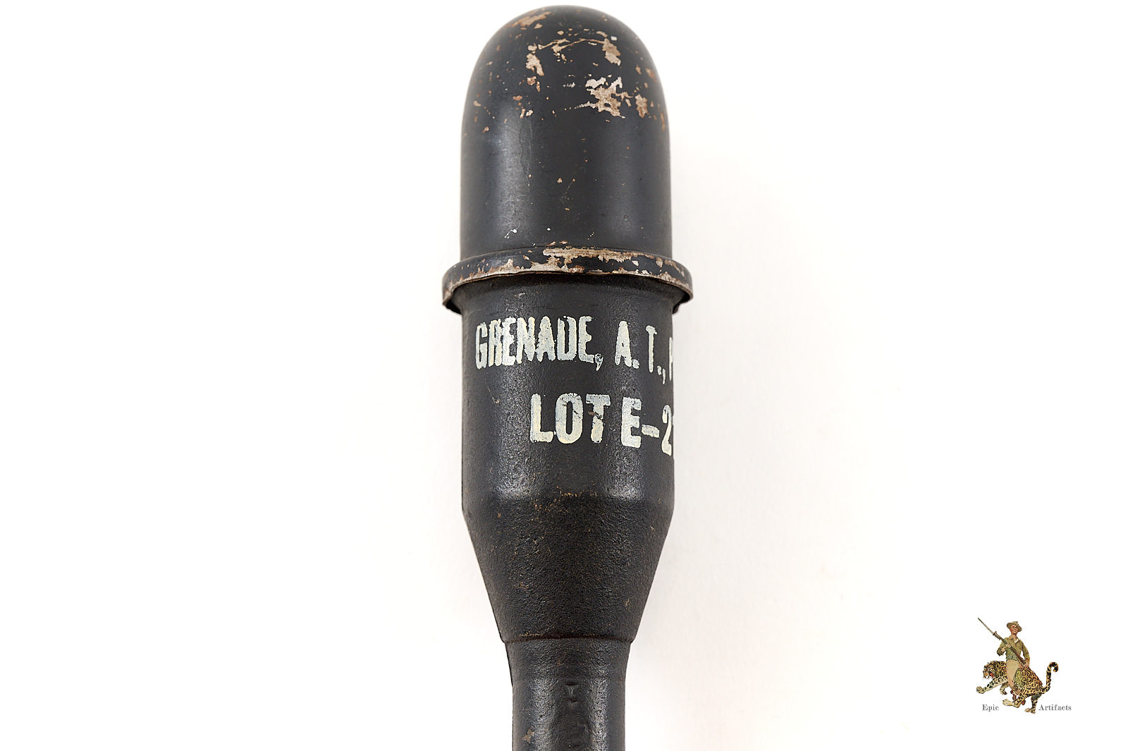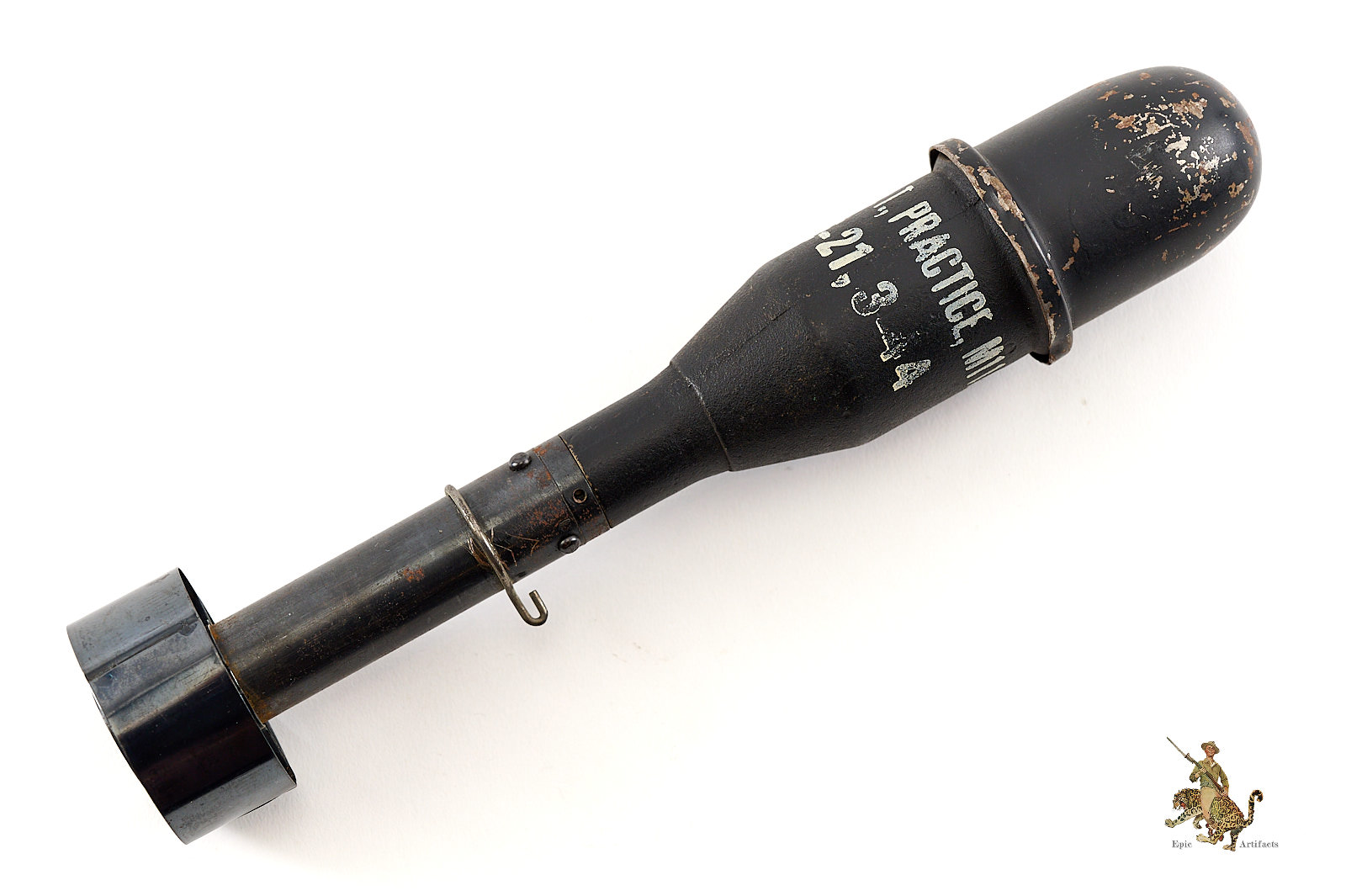 Product Description: A well-preserved US Inert M11A2 Practice Rifle Grenade 3-44, marked Lot E-21 and bearing a March 1944 production date. This ordnance-training example retains strong form and legible markings, with areas of paint loss and surface wear consistent with age and handling, all contributing to an appealing, authentic presentation.