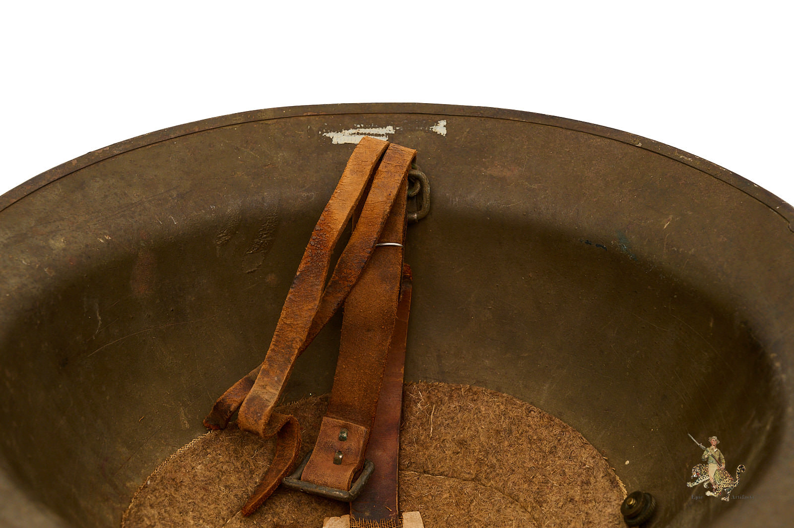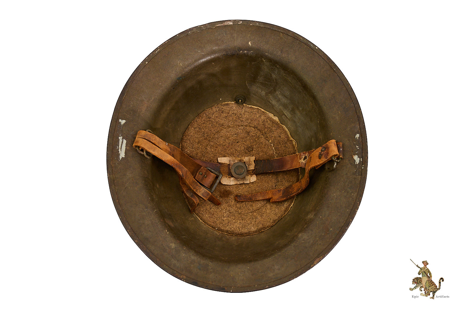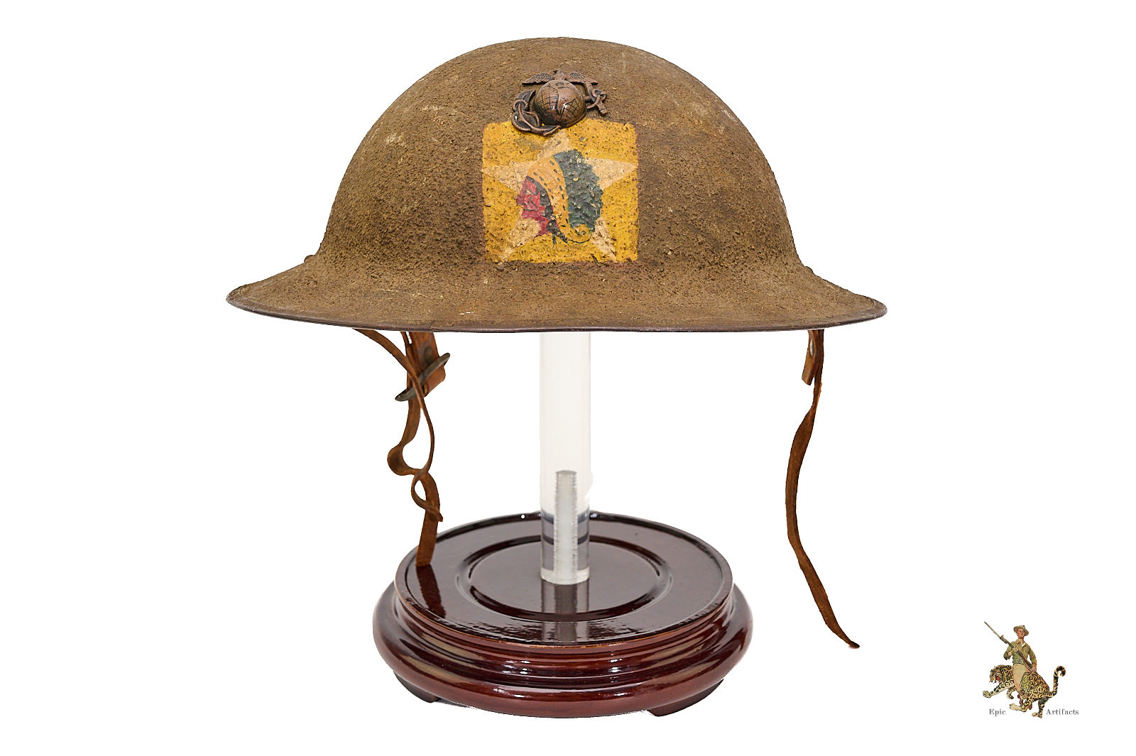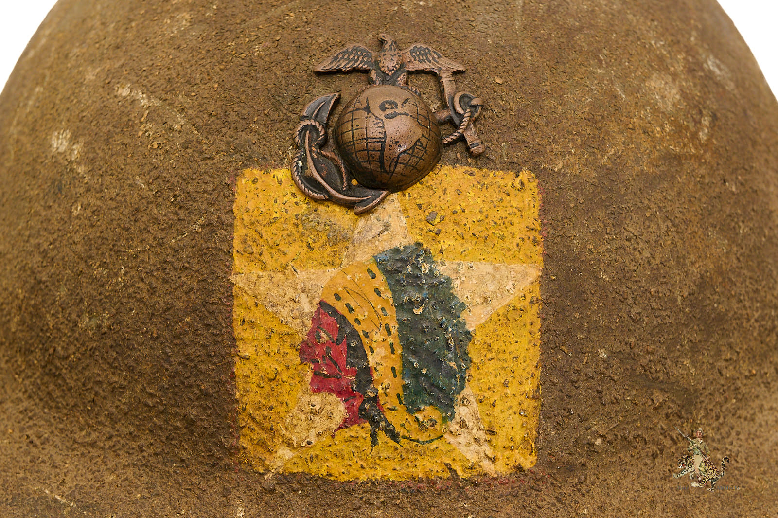 The helmet represents a particularly scarce and visually striking component, featuring a hand-renderedThe US Army’s 2nd Infantry Division (“Indianhead”). Native American-style and of course the correct Eagle, Globe, and Anchor Insignia. The artistry and patination are entirely consistent with period application. The interior is stamped “ZC193,” and retains remnants of the original chinstrap, lending further credence to its untouched, wartime configuration.