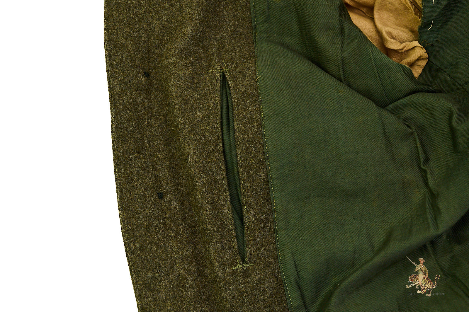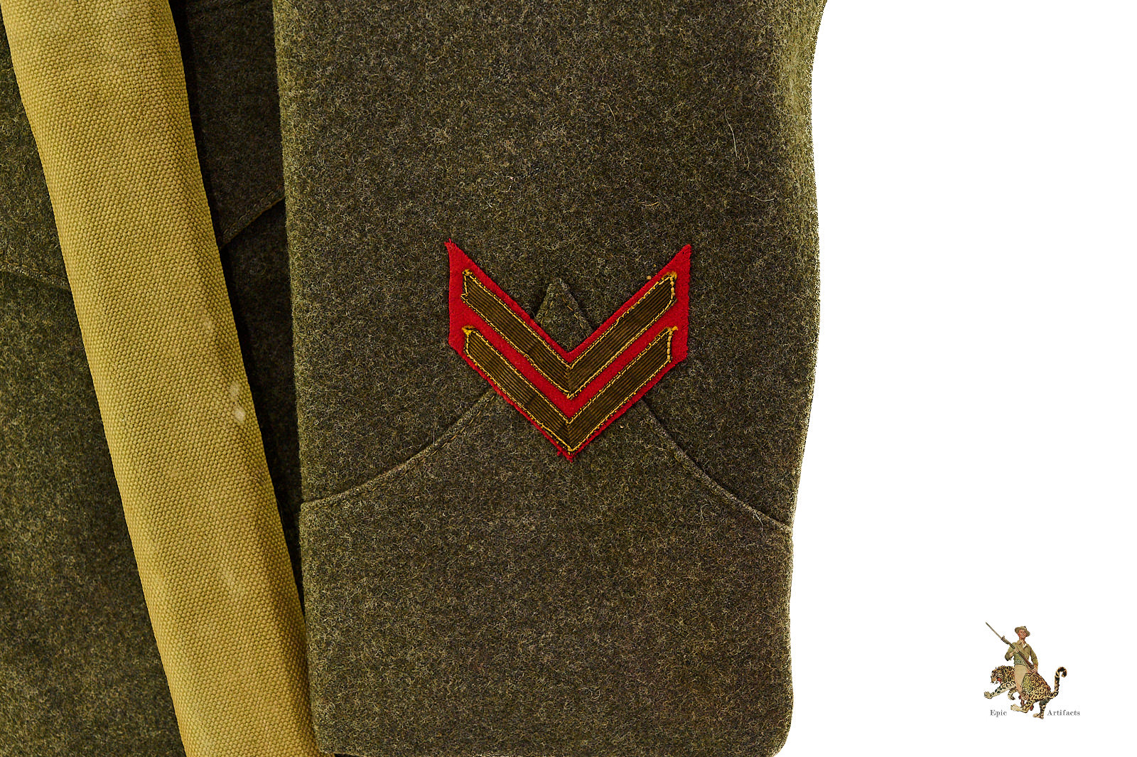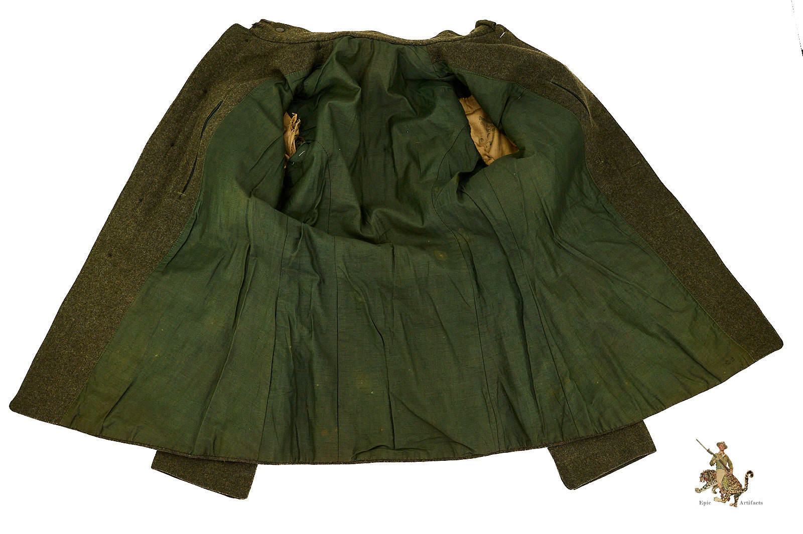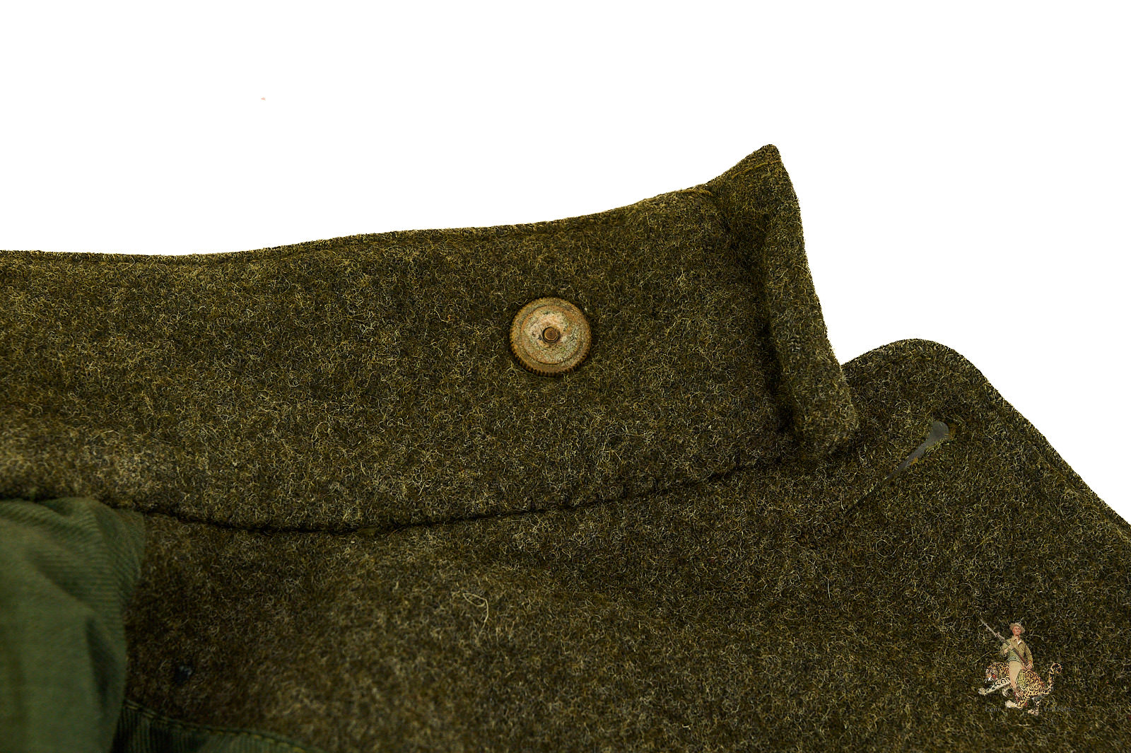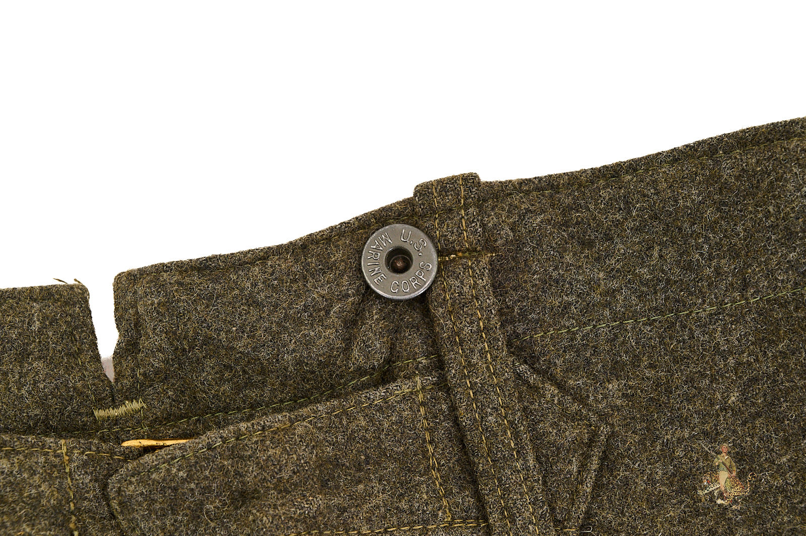 The service coat, measuring approximately 27 inches in overall length, 17 inches across the chest (pit-to-pit), and 24 inches sleeve length, is constructed of olive drab wool and remains in exceptional condition, notably free from mothing or significant fabric loss. There is minor, period-consistent separation to the interior armpit lining, with no structural compromise. The tunic is precisely configured with a 2nd Battalion 5th Marines shoulder patch, correctly applied service chevrons to the lower sleeve, and a suspended marksman qualification badge mounted above the breast pocket. The standing collar retains its original, matched USMC disc insignia, both exhibiting excellent detail and finish. Interior inspection confirms the presence of original USMC issue and sizing stamps to both coat and trousers, further reinforcing authenticity.