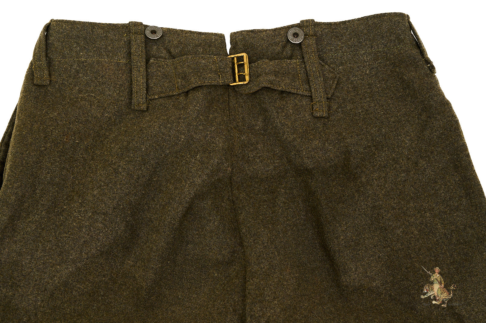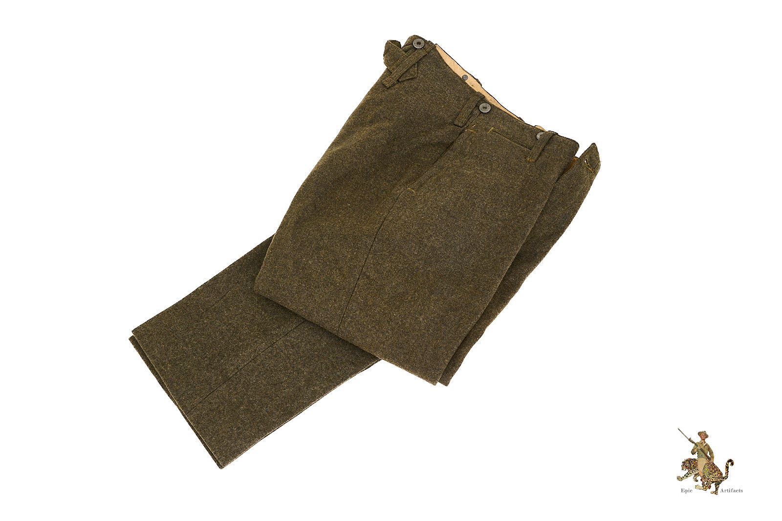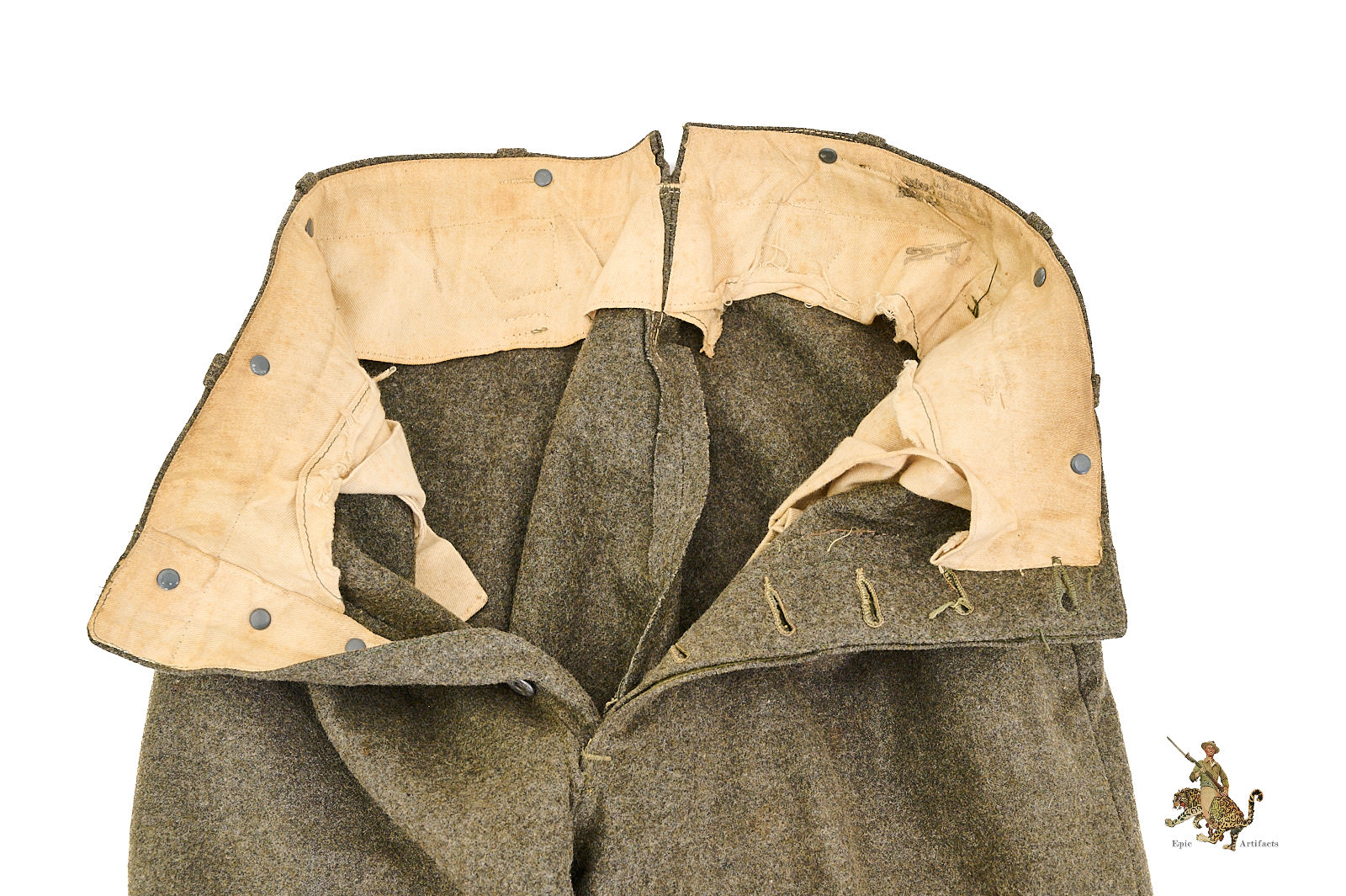 The accompanying trousers, measuring approximately a 30-inch waist with a 27-inch inseam, are of matching material and tone, displaying only minor, period field repairs visible upon close examination. The fabric remains strong, with no significant deterioration, maintaining excellent display and structural integrity.