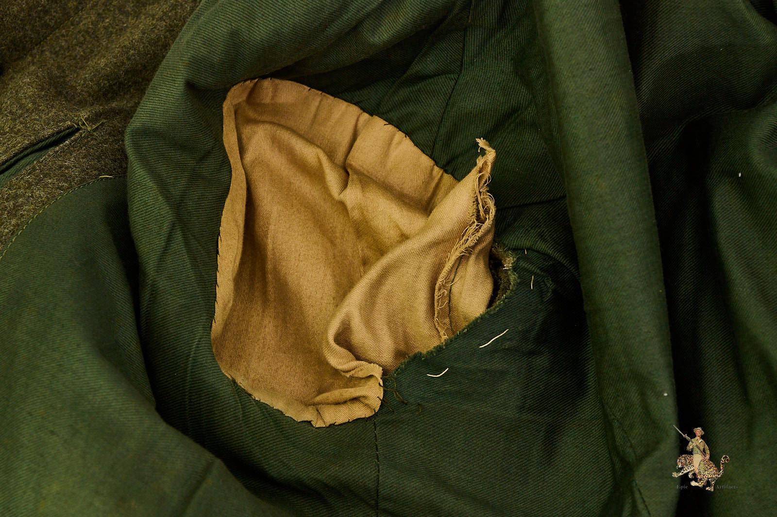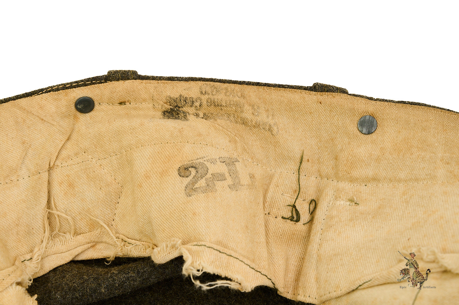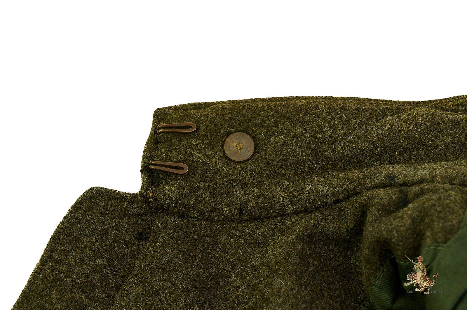 The accompanying trousers, measuring approximately a 30-inch waist with a 27-inch inseam, are of matching material and tone, displaying only minor, period field repairs visible upon close examination. The fabric remains strong, with no significant deterioration, maintaining excellent display and structural integrity.