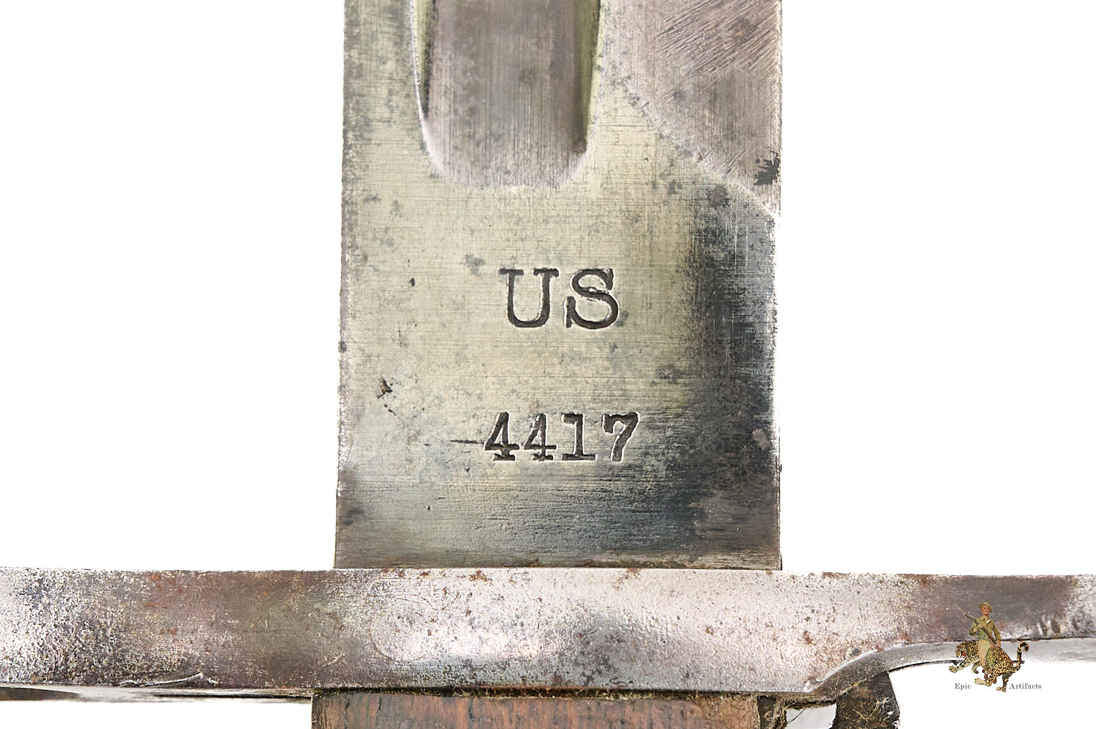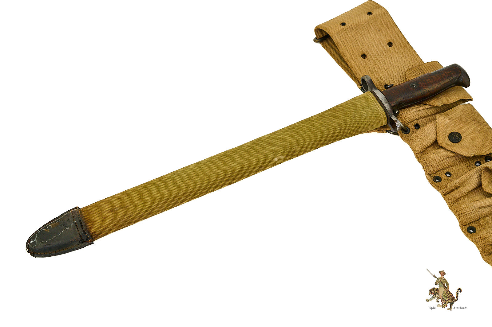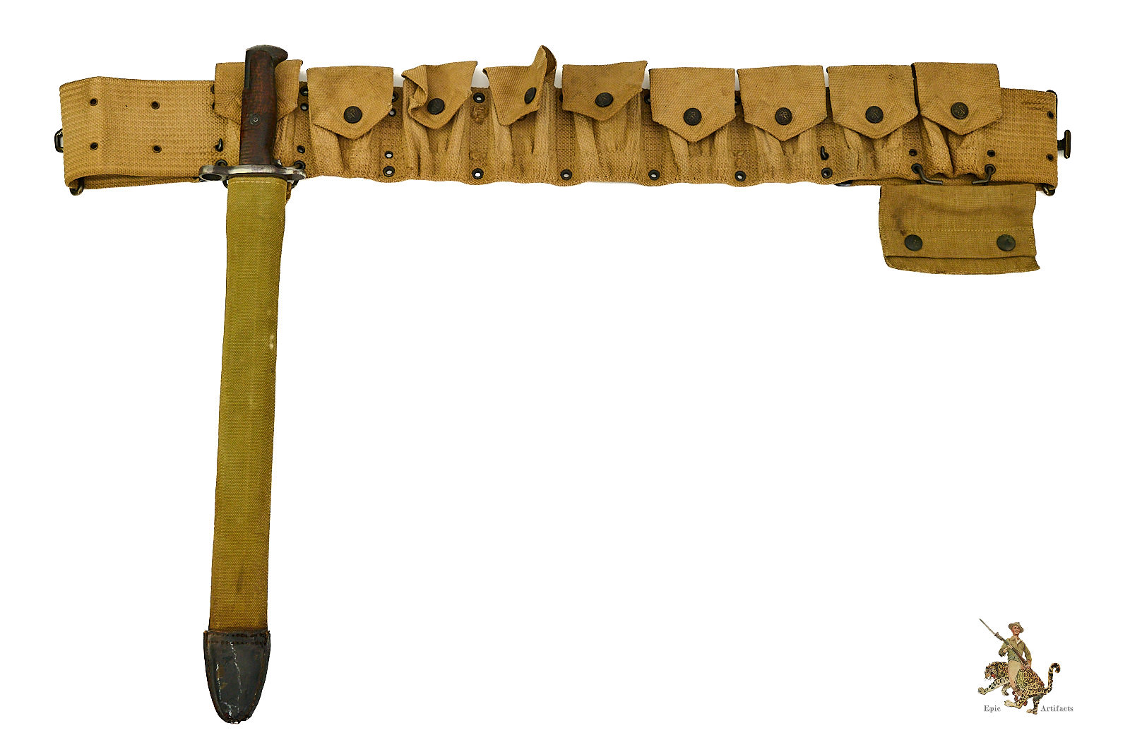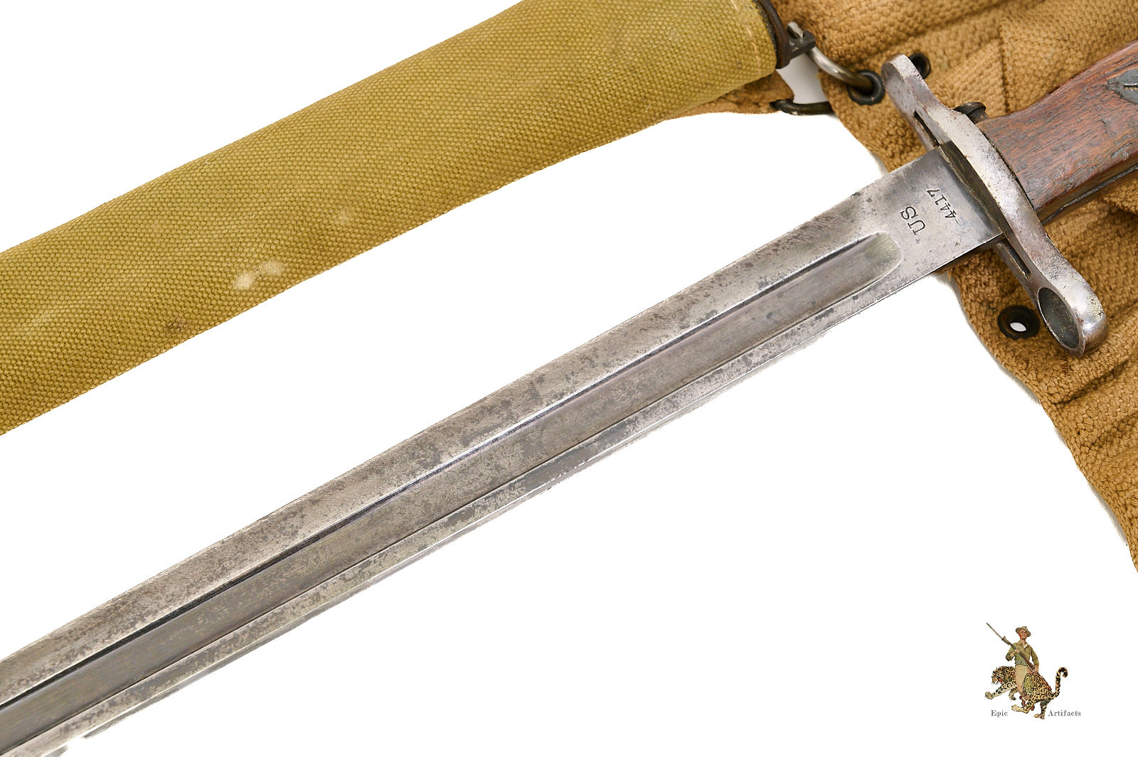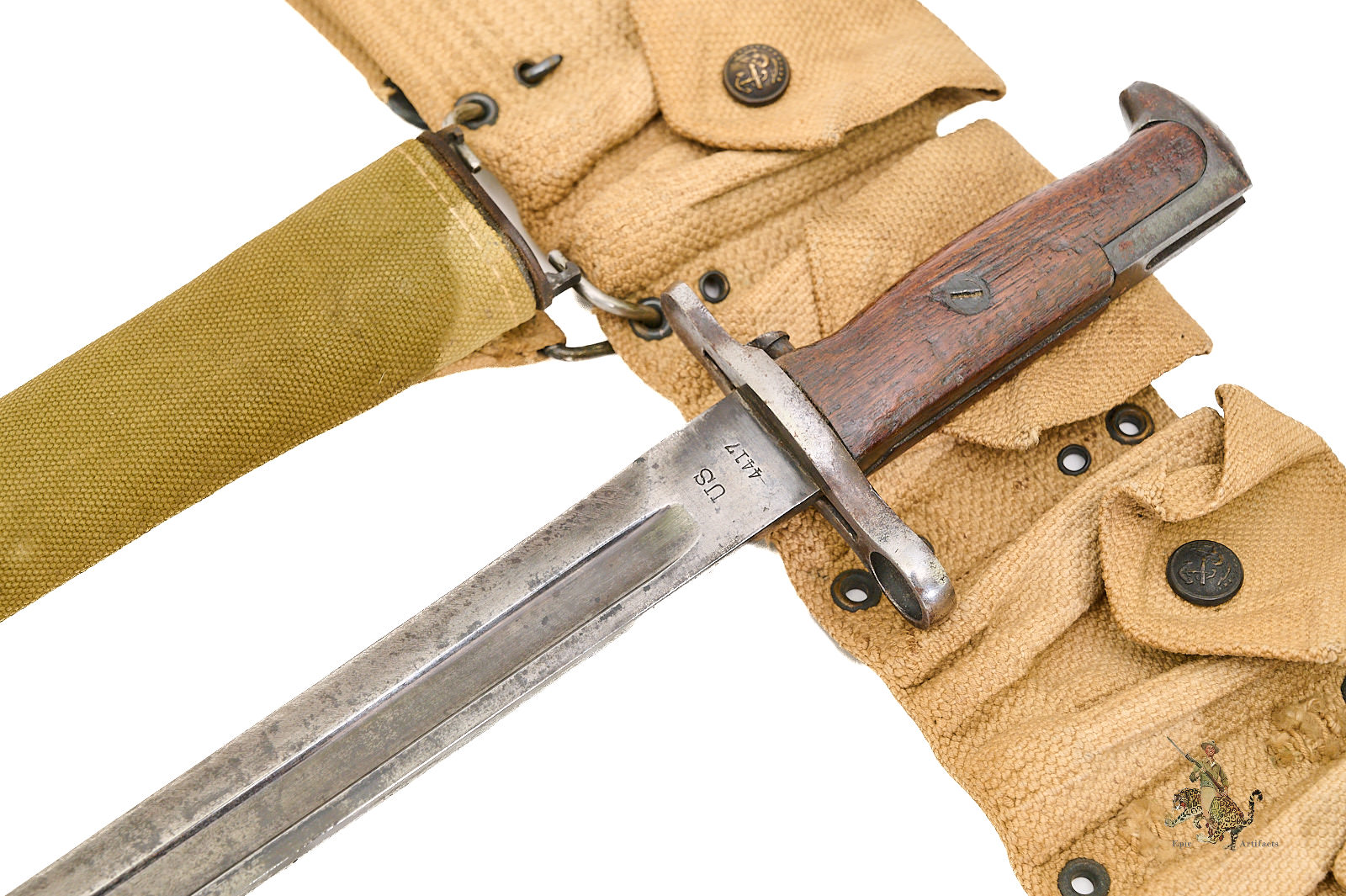 Also included is a Model 1906 bayonet, clearly marked “US 4417” and “SA 1906,” retaining its full-length blade with strong edge and profile. It is housed in its correct canvas and leather scabbard, both remaining in excellent condition with tight stitching and sound structure. Completing the ensemble is an early eagle globe and anchor snap cartridge belt, well-preserved and fully functional, exhibiting only expected age-related wear.