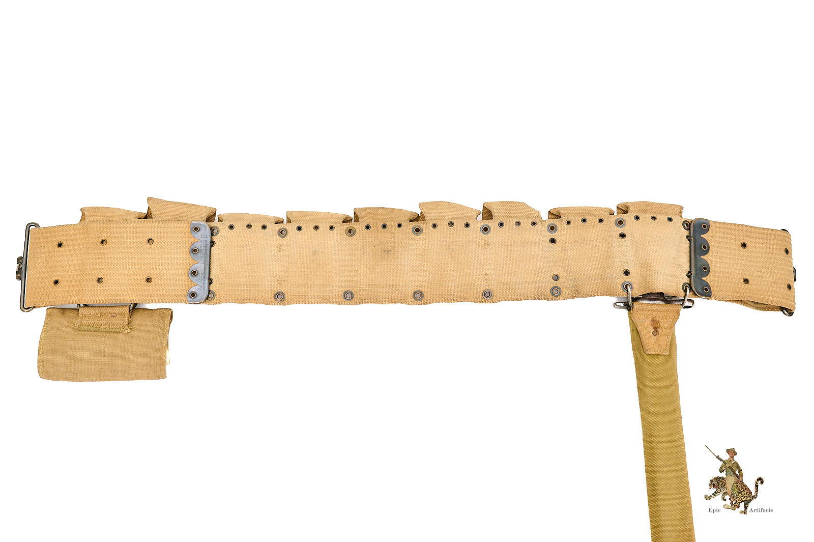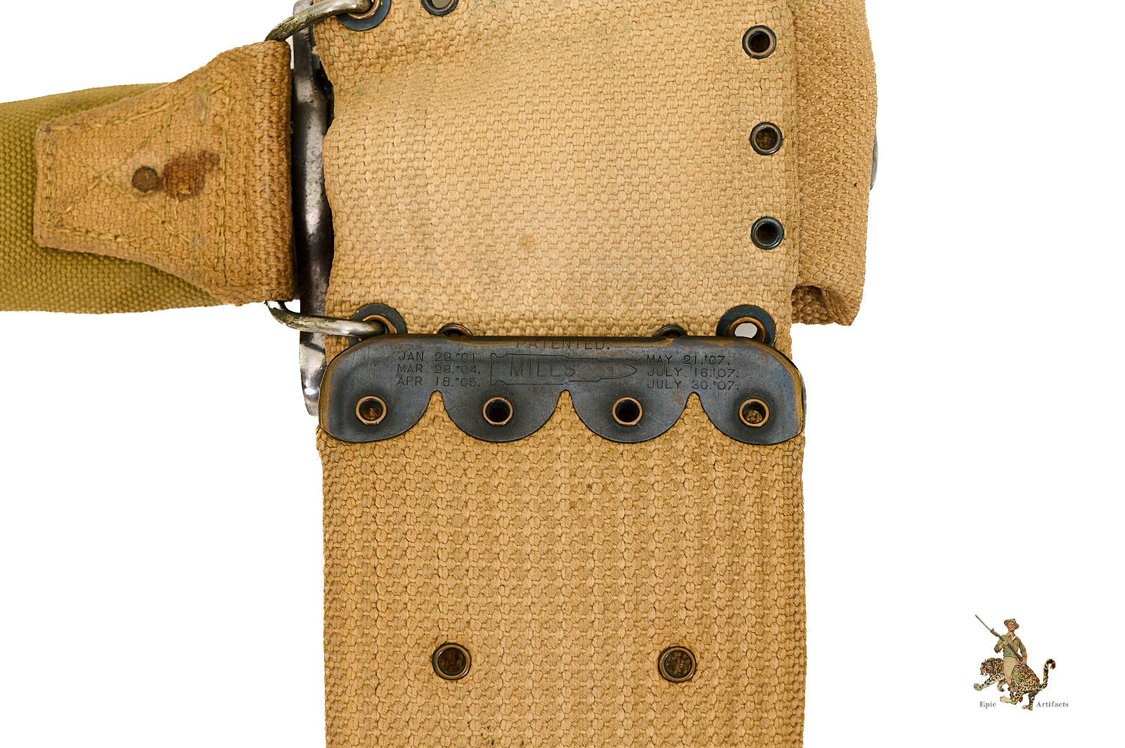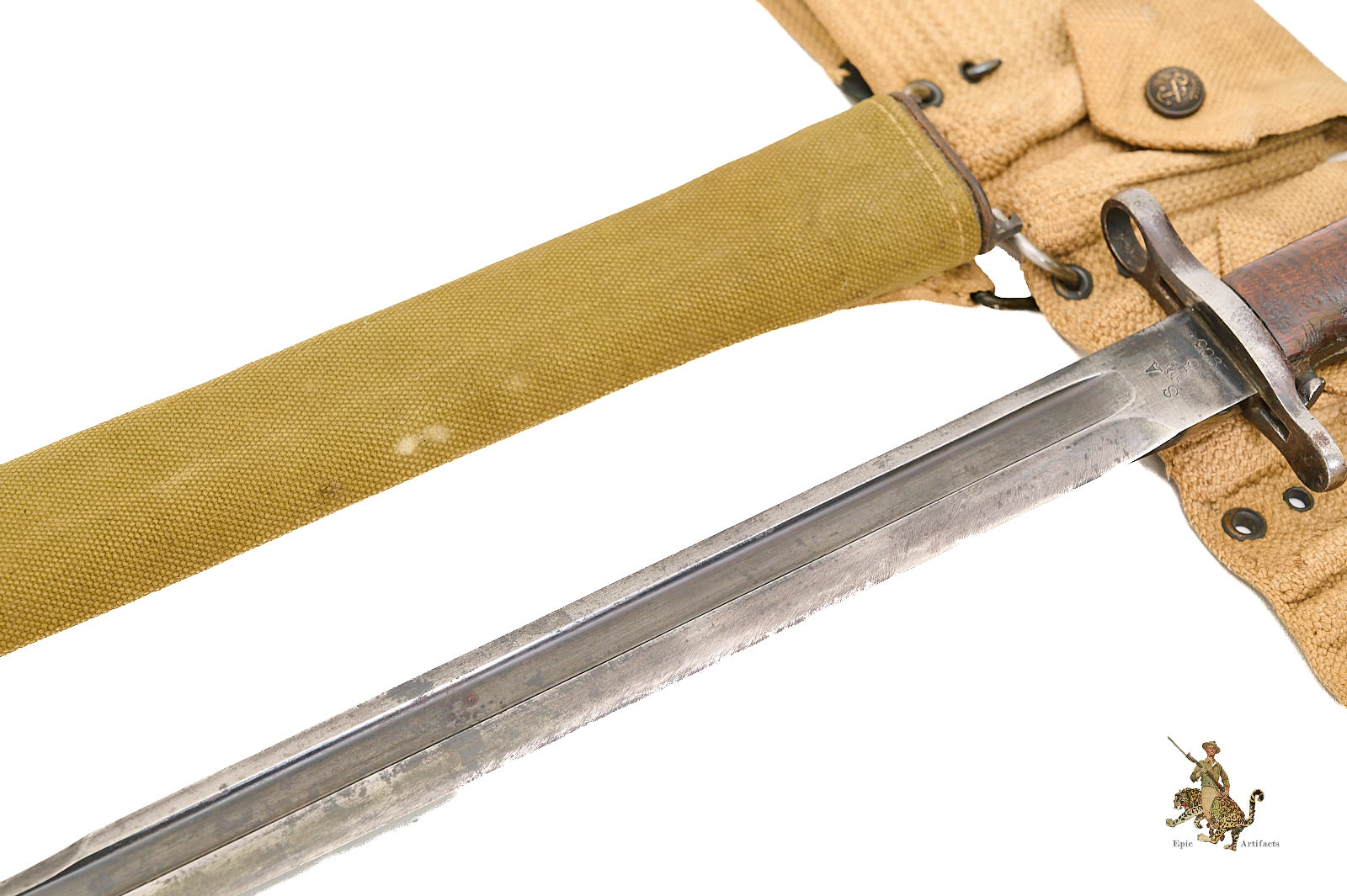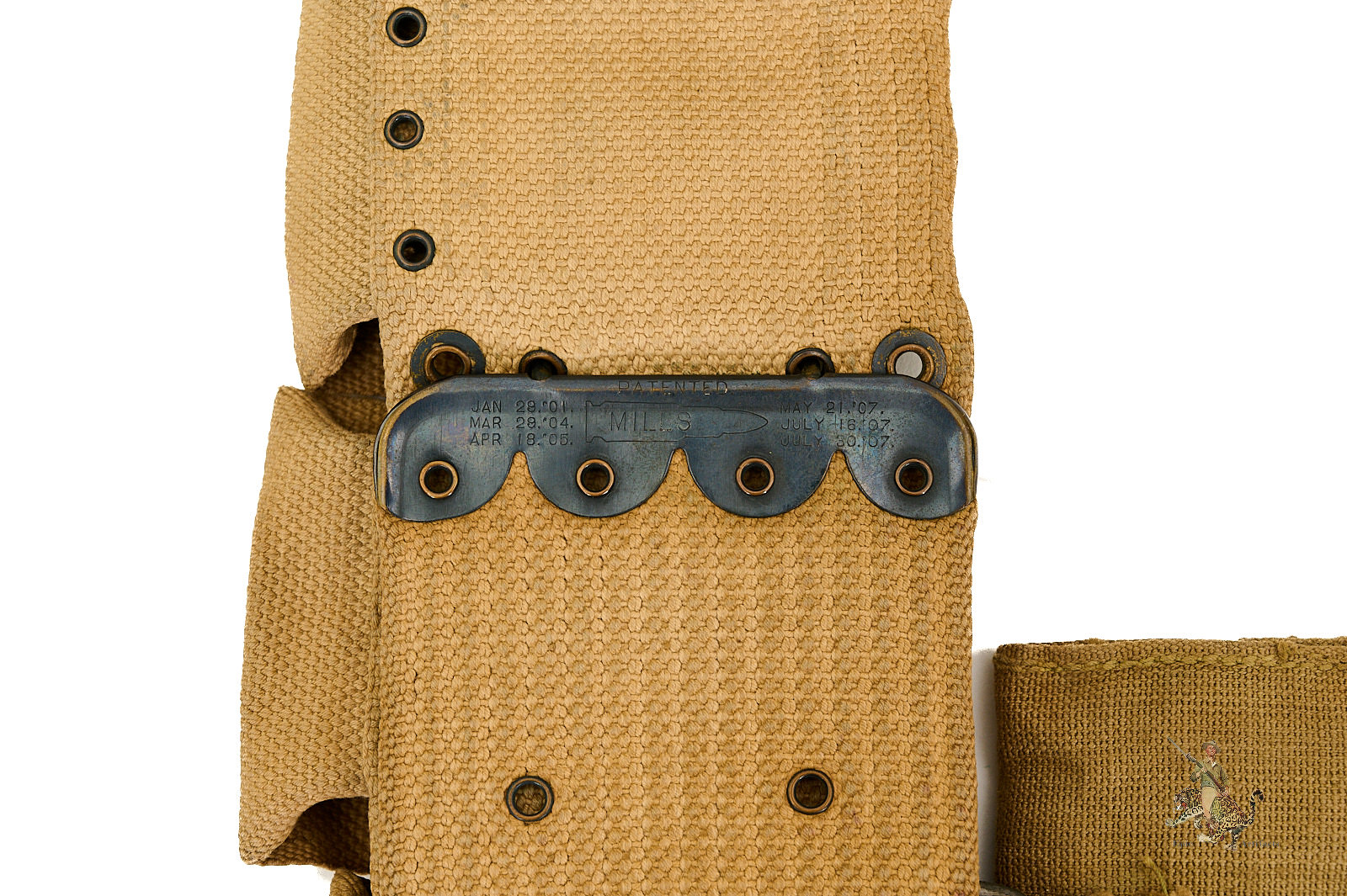 Also included is a Model 1906 bayonet, clearly marked “US 4417” and “SA 1906,” retaining its full-length blade with strong edge and profile. It is housed in its correct canvas and leather scabbard, both remaining in excellent condition with tight stitching and sound structure. Completing the ensemble is an early eagle globe and anchor snap cartridge belt, well-preserved and fully functional, exhibiting only expected age-related wear.