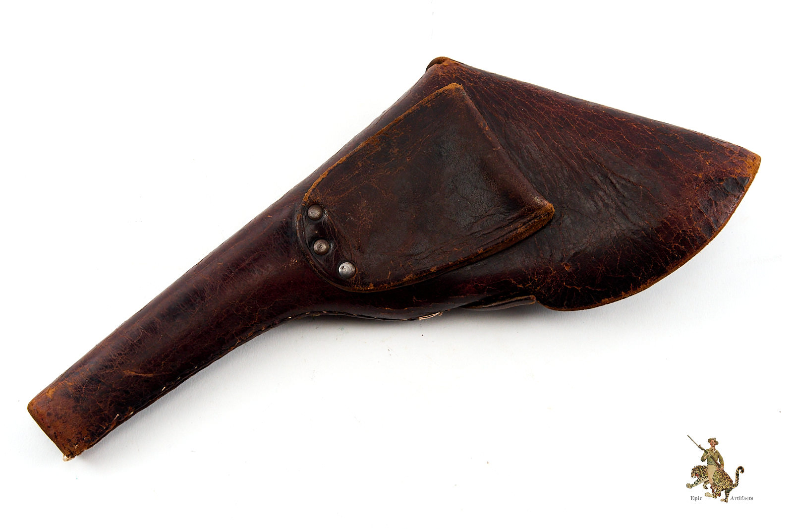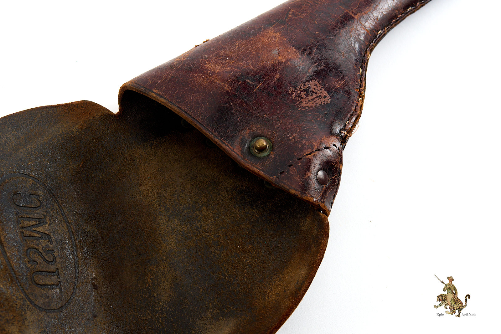 The lower tip has been reinforced with white stitching, as shown, indicating period or field-level repair. The front snap closure remains fully functional, and the leather retains an appealing softness and pliability despite its age.
